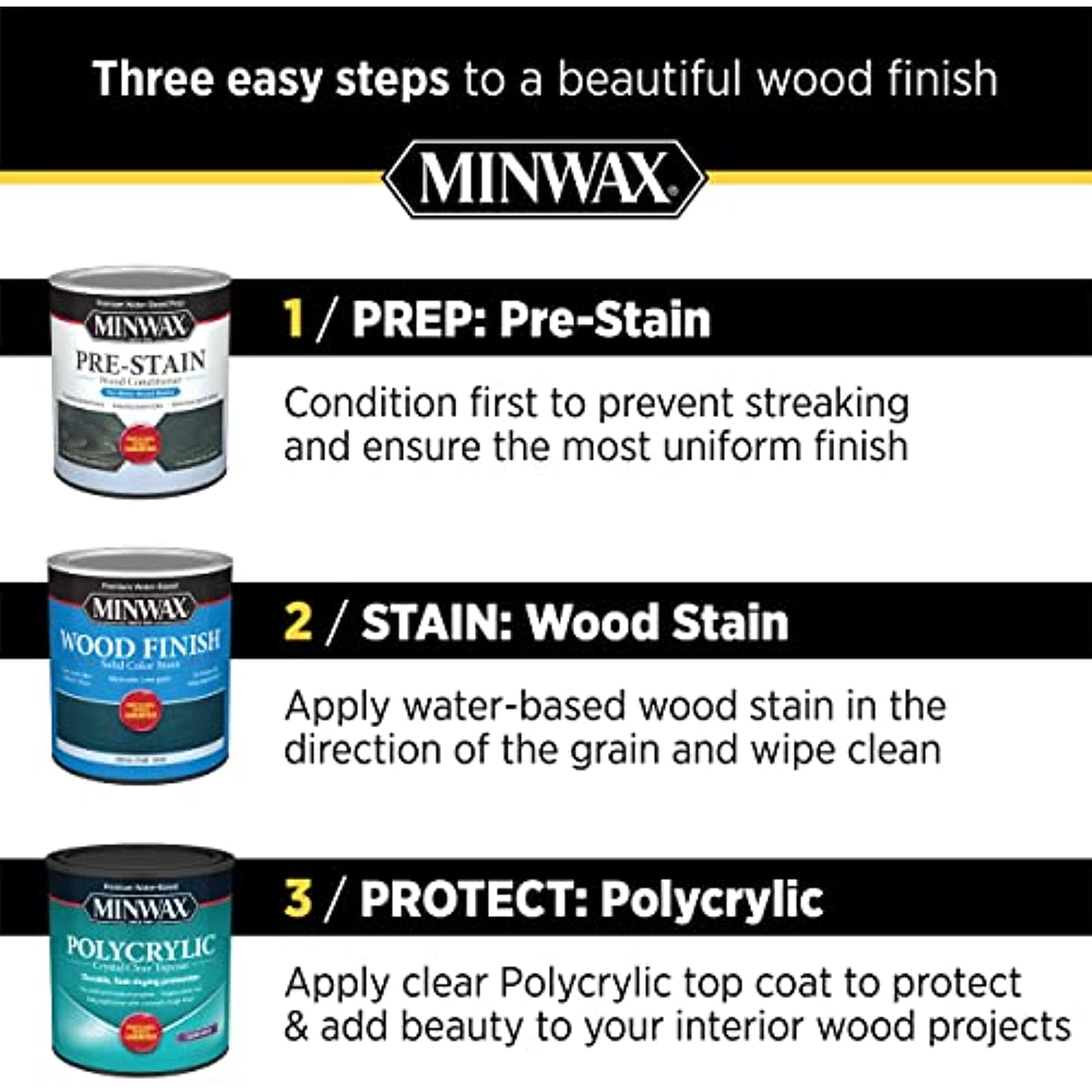 Product Description Keep interior wood projects looking beautiful with Minwax Polycrylic Protective Finish. This crystal clear protective finish protects and adds beauty to woodwork, furniture, and more. The clear top coat protects against scratches, scuffs and blemishes to protect the wood surface beneath. This clear sealer dries crystal clear and stays crystal clear, making it ideal for use over all Minwax Oil-Based and Water-Based Stains and colors, as well as all wood species including light woods like maple, ash and birch. The ultra-fast-drying protective coating allows for quick recoats after 2 hours. It’s also easy to clean-up the clear wood finish with just soap and water. This protective wood top coat not only protects the natural beauty of the wood, but offers a shiny, sleek sheen for a bright, modern look. It’s also non-yellowing, non-ambering and low odor. Note: Minwax Polycrylic Protective Wood Finish may appear milky upon opening, but applies and dries to a crystal clear protective finish that lasts. Application: 1. Surface must be dry and free of wax, grease, polish, any foreign matter or old finishes in poor condition.2. Sand to a smooth, uniform surface. DO NOT USE STEEL WOOL. Remove dust with a damp cloth. Let dry completely.3. If desired, apply stain such as Minwax Water Based Wood Stain or Minwax Wood Finish stain to bare wood surfaces following label directions. Wait at least 24 hours before applying Polycrylic Finish over Minwax Wood Finish Stain. Can also be applied to bare wood.4. Stir well before and regularly during use. DO NOT SHAKE.5. Apply a thin coat of Polycrylic Finish with a high-quality synthetic bristle brush. Apply in one direction with the grain. Do not over-brush.6. Let dry at least 2 hours then sand with very fine sandpaper (220 grit) to ensure an even finish and proper adhesion of additional coats. Do not use steel wool. Remove all dust.7. Apply a second coat. For additional coats, repeat Step 6 before applying. Three coats are recommended.8. After final coat, allow 3 hours before light handling and 24 hours before normal use. From the Manufacturer Minwax is America's leading brand of wood finishing and wood care products. From staining and protection, to preparation, maintenance, cleaning and repair, Minwax makes and keeps wood beautiful.