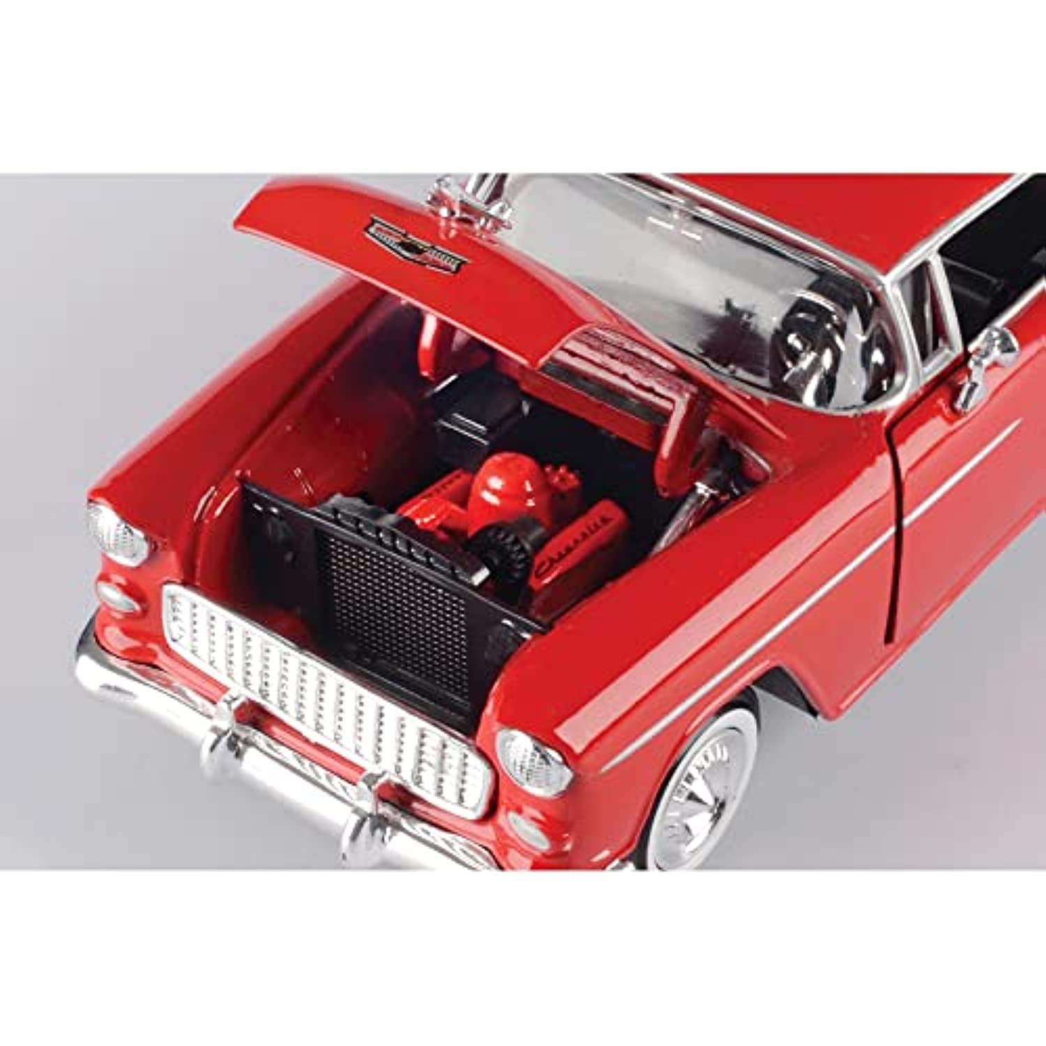 FeaturesPrecision Diecast CollectibleHood, Doors & Trunk OpenAuthentic Chevy Turbo-Fire V-8 Under the HoodAuthentic Interior AppointmentsA Fifties Icon You Don't Want to MissChrome Jet Plane Hood OrnamentSmooth Rolling Whitewall TiresSteering Wheel Controlled Front WheelsChevrolet unveiled their mighty Turbo-Fire small block V-8 in their all-new 1955 Bel Air and The Hot One was born. The rest is history. Fresh for the showroom floor this stunning pillarless hard top Coupe is guaranteed to turn heads in your diecast collection!