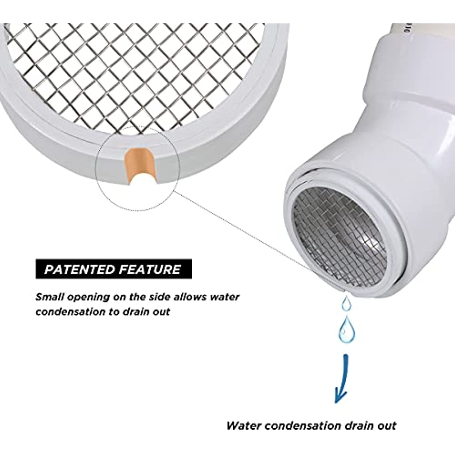 The unique feature of Raven termination vent was patented and designed in a way that allows water condensation to drain out from the pipe. From top to bottom, a small, curved line slot along the outer edge of the termination vent help with the flow. It can be fitted on any pipe with termination ends to ensure the flow is uninterrupted. A 304 stainless steel mesh vent cap can be easily fitted on any PVC / Flexible elbow, adapter or coupling fitting (not included). The quality of type 304 mesh screen provides the strength and durability to resist obstruction of leaves, debris and prevents wildlife from entering the pipe. The unique design of the mesh screen provides maximum airflow that allows the vent to discharge output effectively. Useful for residential or commercial applications. Please note that the PVC / Flexible elbow, adapter or coupling fitting are not included and must be purchased separately. Available in 2, 3, 4, and 6 inches. ⚠ California Proposition 65 Warning: This product is known to the state of California to cause cancer, or other reproductive harm. For more information, go to www.p65warnings.ca.gov.