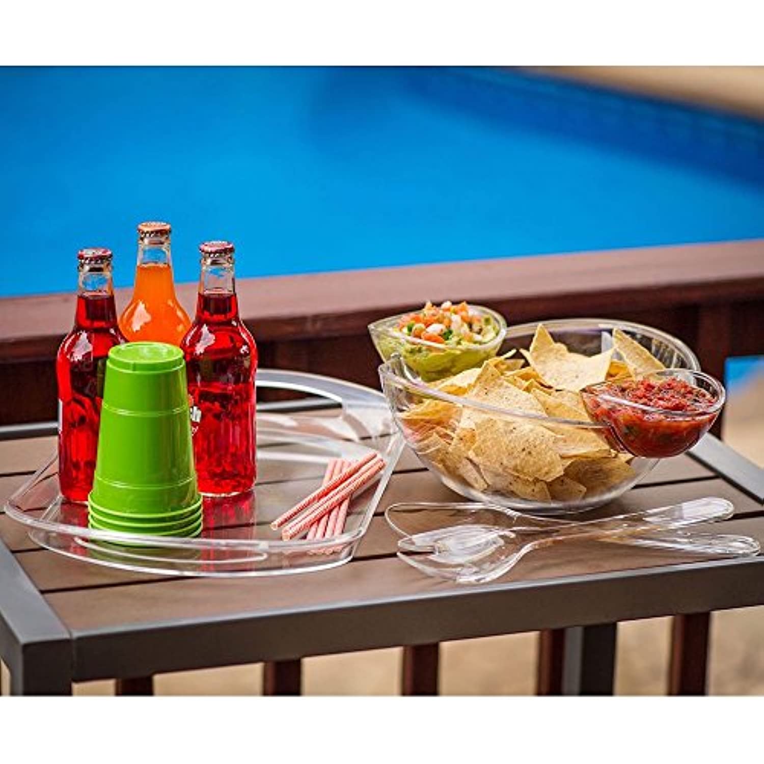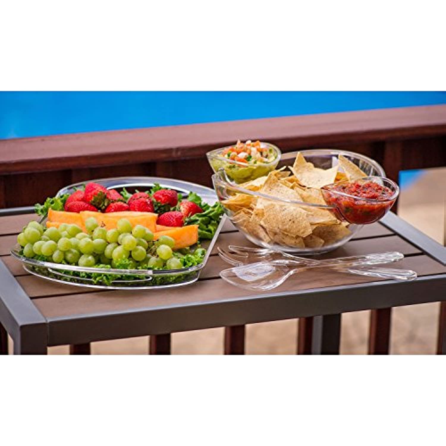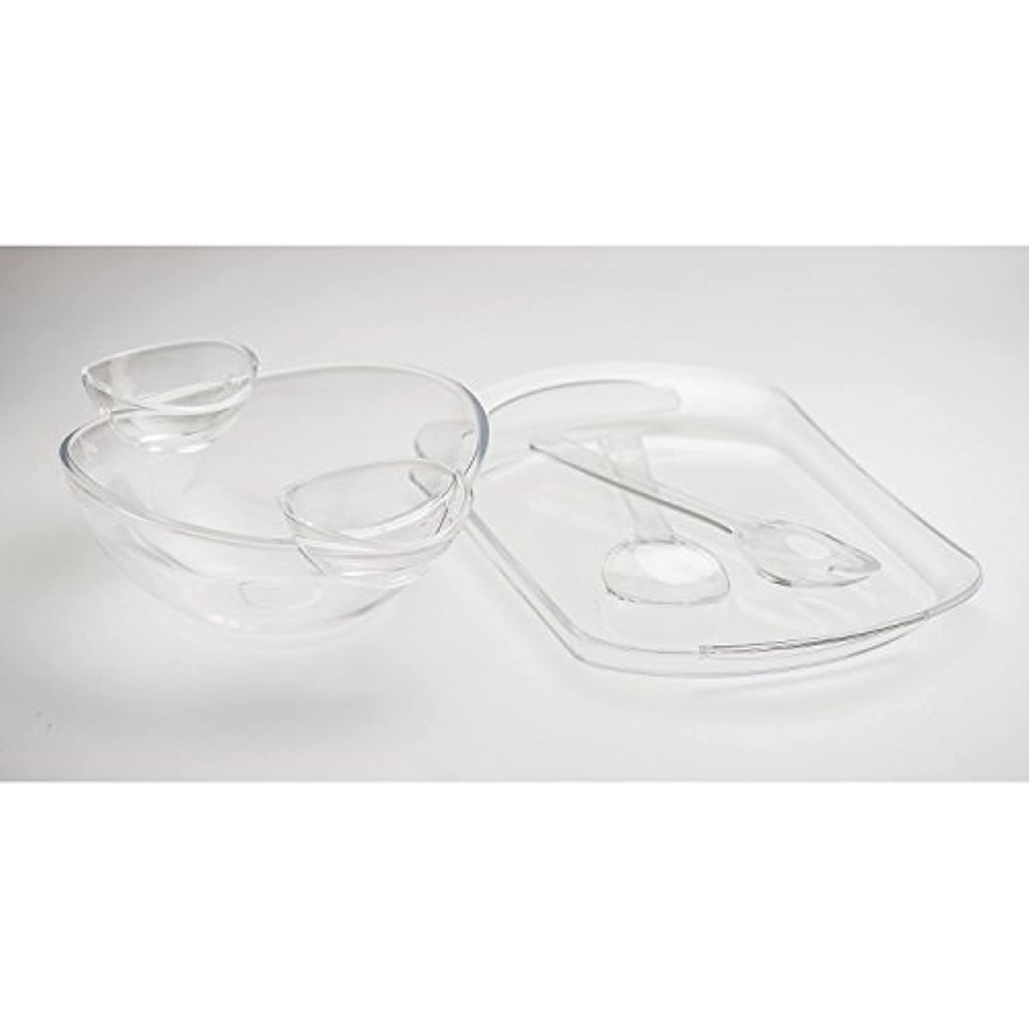 This crystal-clear acrylic serving set complements any table setting. Lightweight serving pieces are easy to transport and ideal for both indoor and outdoor use. Large tray holds appetizers for a crowd, or can be used to transport drinks, utensils and more. Small bowls hold 8 oz. of dip or dressing -- use separately or clip onto large bowl. Large bowl is ideal for salads, chips or snacks and comes with matching serving fork and spoon. This set comes complete wtih two serving utensils (serving fork, serving spoon). The is the perfect serving set for parties, picnics or every day use.