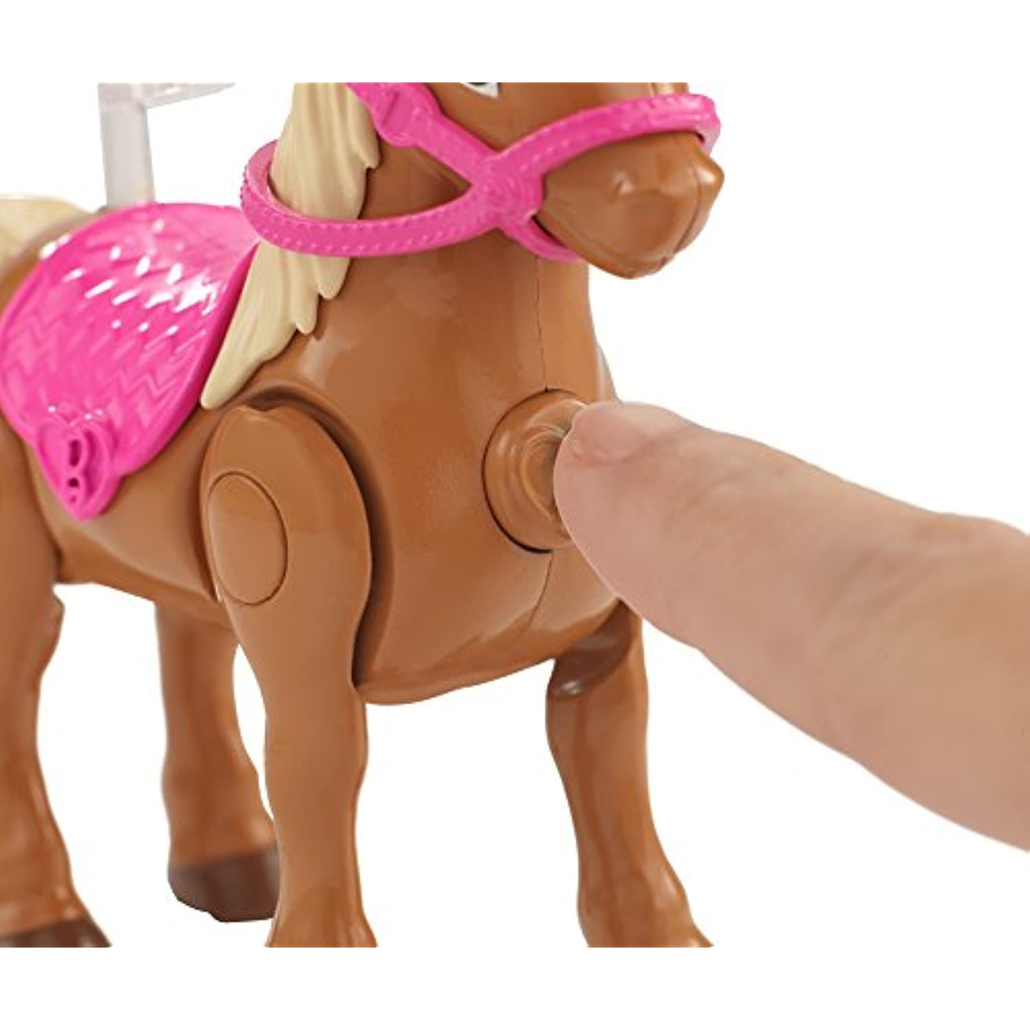 - Push the button on each pony's chest to see it walk. The motorized action is battery powered, and a clip holds a Barbie On-the-Go doll in place