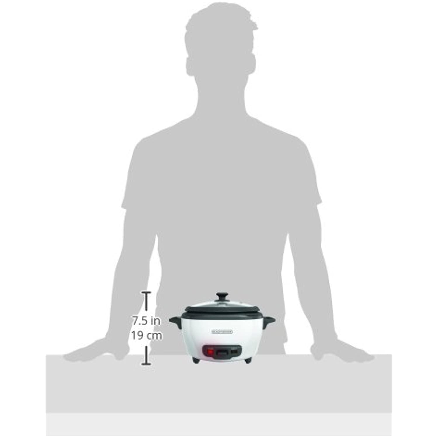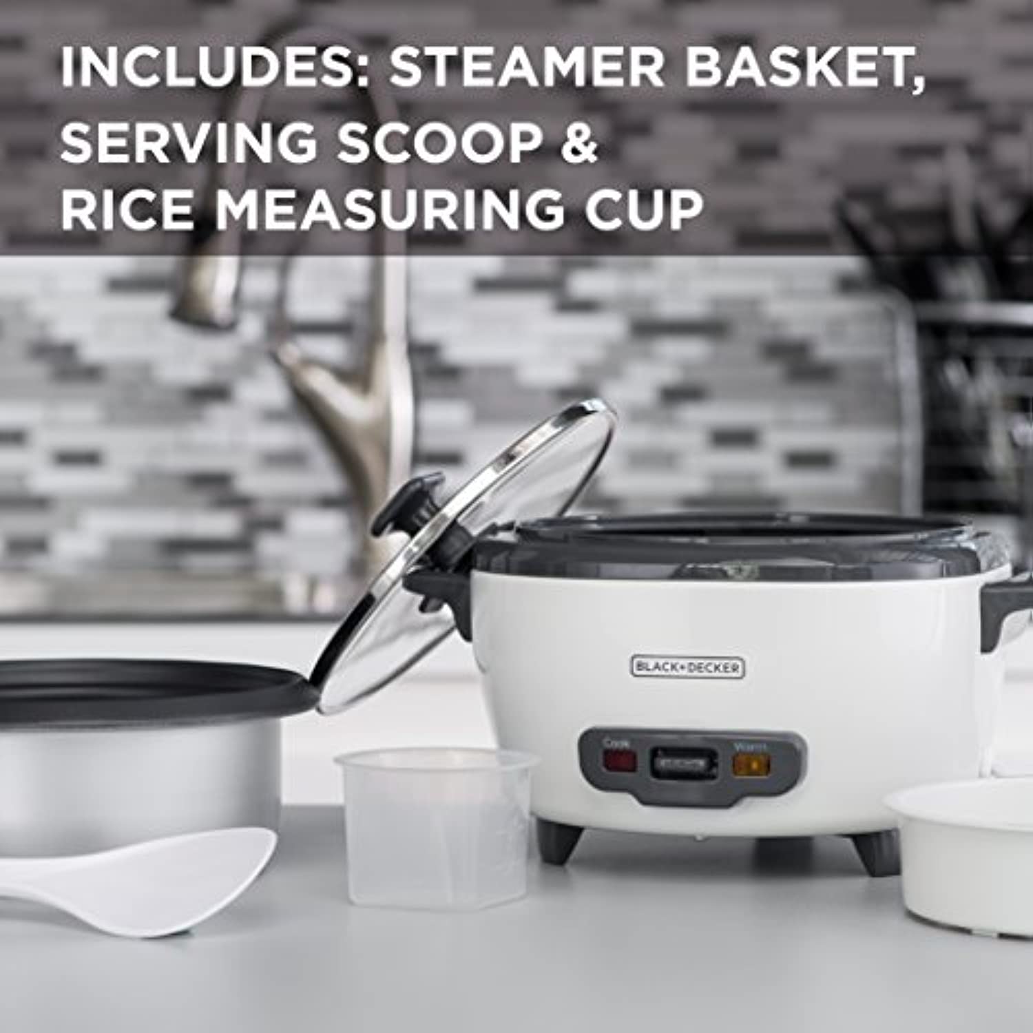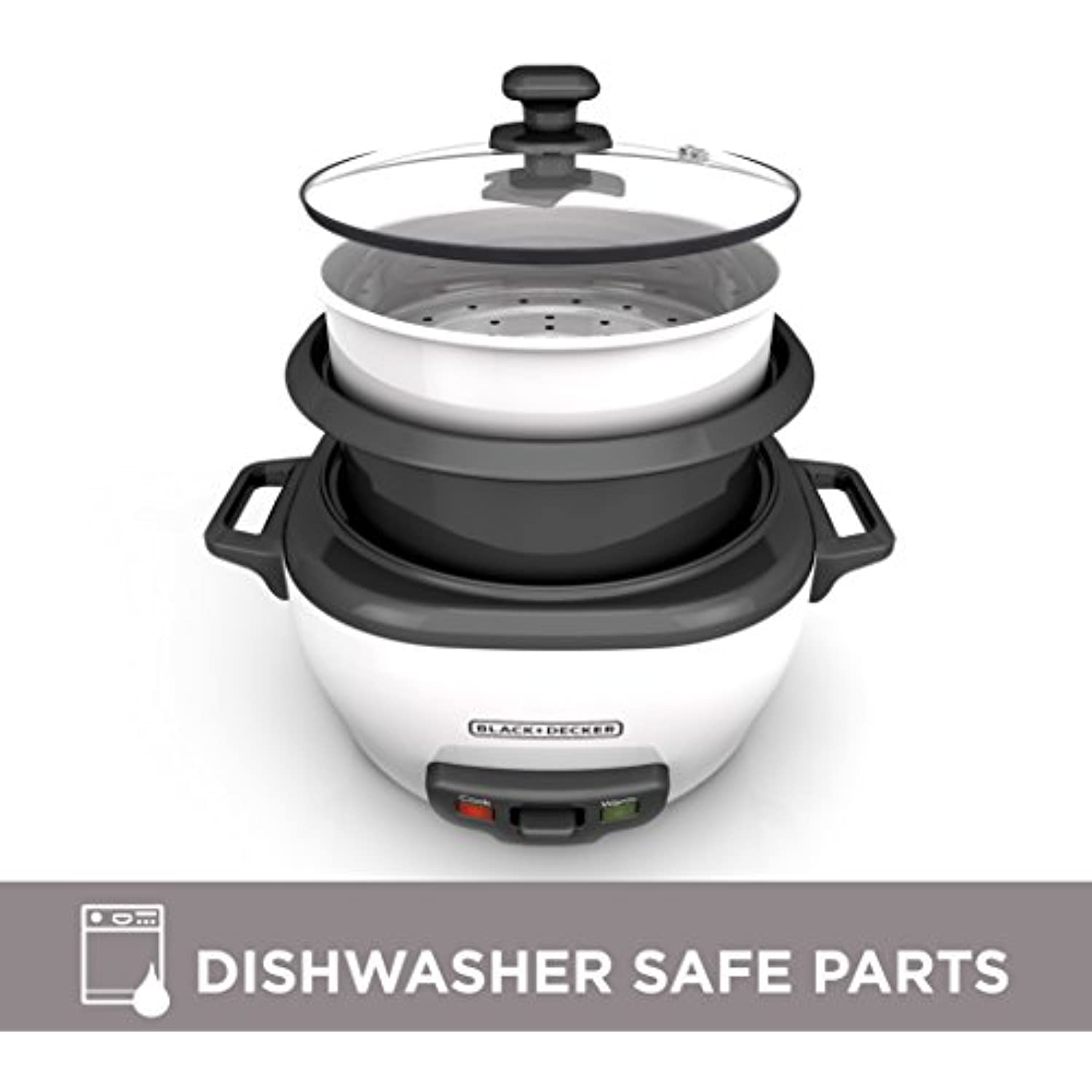 Product Description Dinner is easier with the BLACK+DECKER 6-Cup Electric Rice Cooker. Cooking takes just 20-30 minutes, and the unit keeps the delicious, fluffy rice ready to serve long after cooking is complete with an automatic “keep warm” function. Use it as a food steamer, too! The included steaming basket lets you prepare healthy meals with vegetables, fish, and more. Cleanup is a cinch with the dishwasher-safe, nonstick rice pot and tempered glass lid. Plus, you can use the electric cooker to prepare soups, stews, and even oatmeal! With a 1 to 6-cup capacity, this electric rice cooker is great for small and large servings. Dishwasher-Safe Parts - The rice pot and tempered glass lid can be cleaned in the dishwasher.Seller Warranty Description 2 year limited warranty Brand Story By BLACK+DECKER