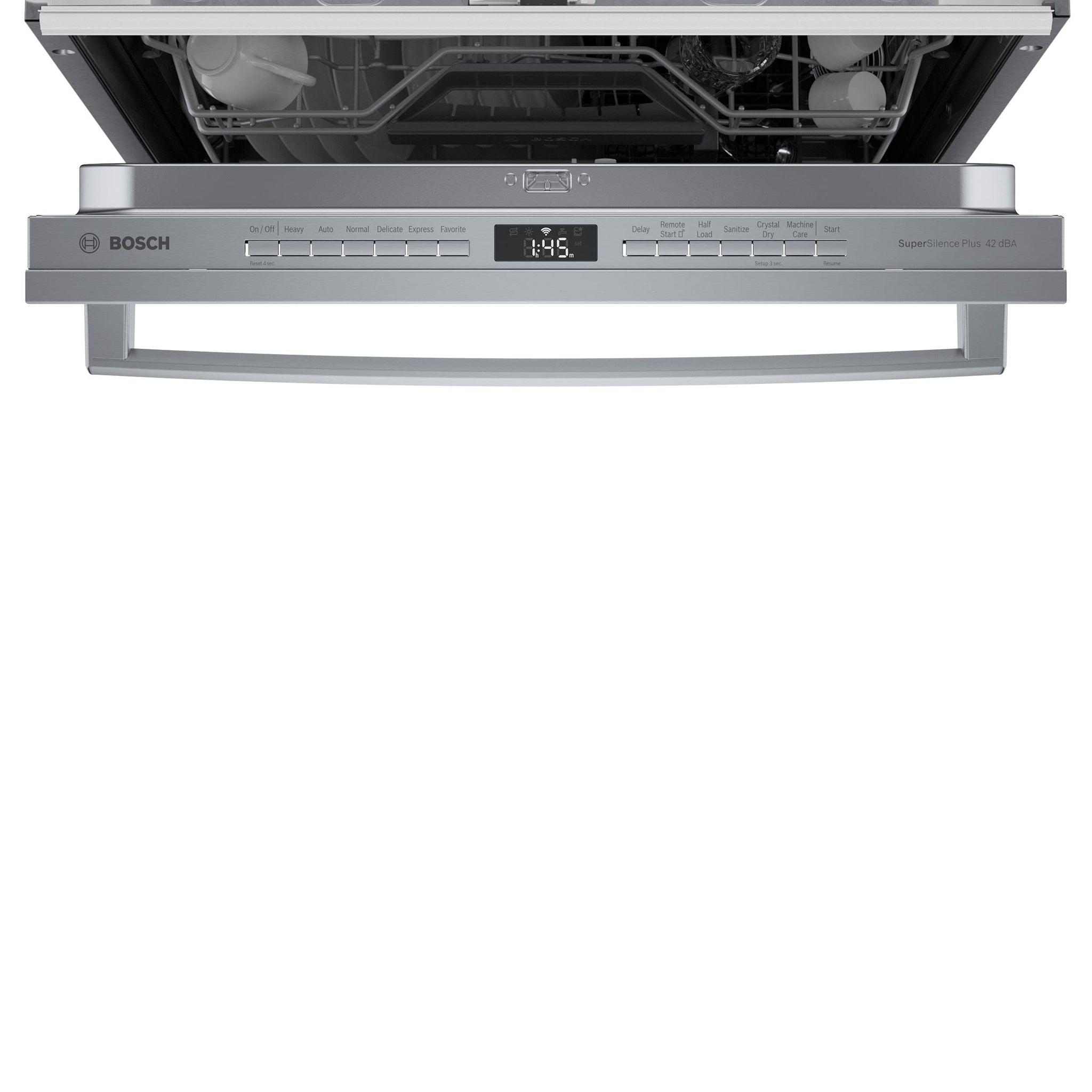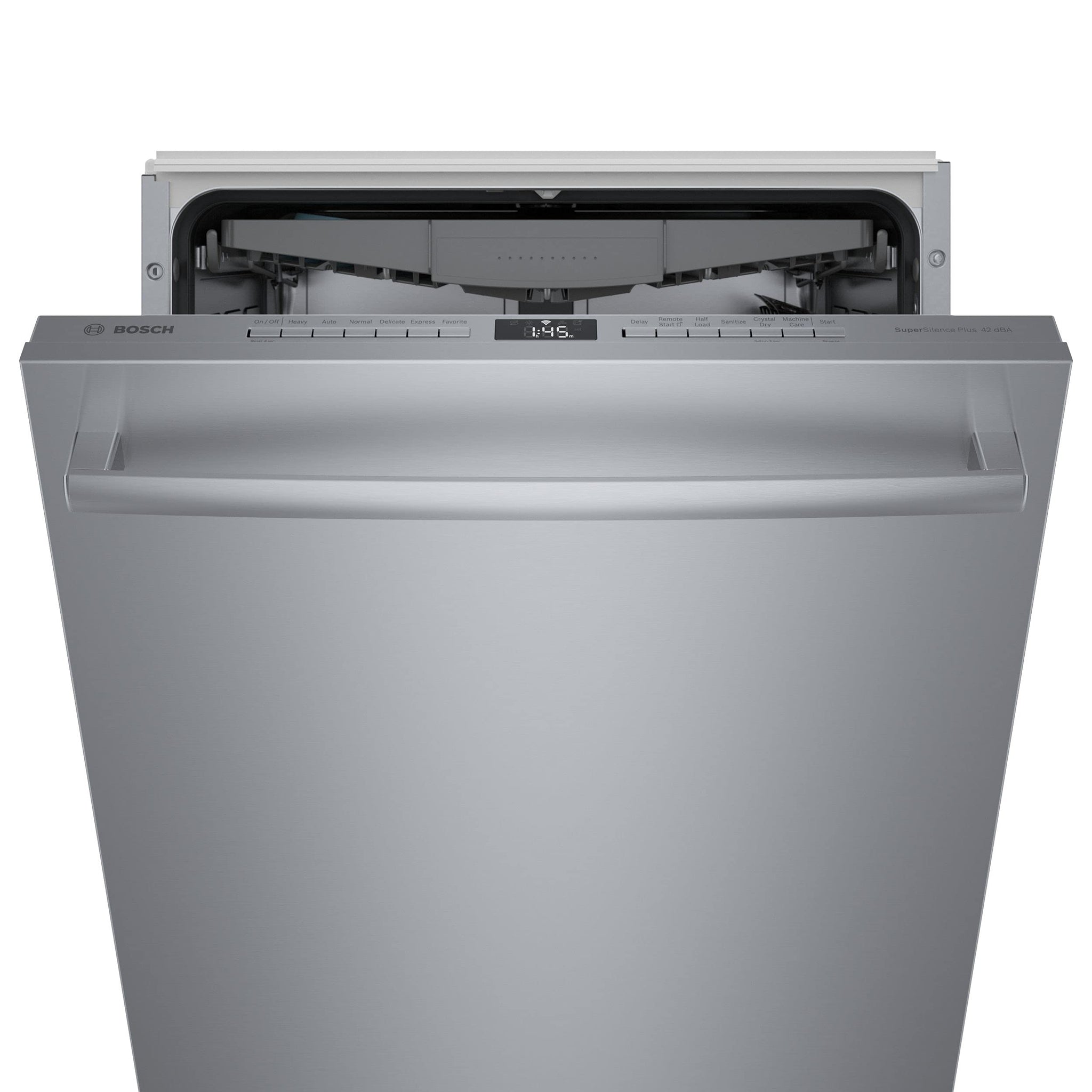 - Patented CrystalDry technology = the ultimate dry - A standard 3rd rack adds versatility and more loading capacity - Hidden integrated electronic controls maintain a clean exterior and InfoLight shines a red beam on the floor to indicate when the dishwasher is running - Extremely quiet operation (42 dBA) with InfoLight that shines a red beam on the floor to indicate when the dishwasher is running - Large interior provides the space and loading flexibility to easily accommodate 15 place settings, and the 3rd rack provides additional space for silverware and utensils - Offers 6 wash cycles, including the following Heavy, Auto, Normal, Express, Delicate, Favorite and 6 options, including Delay Start, Remote Start, Half Load, Sanitize, CrystalDry and Machine Care - Every Bosch dishwasher is ENERGY STAR qualified and meets or exceeds federal guidelines, for year-round energy savings - Full stainless steel tub is sleek, durable and long-lasting - Precisely engineered detergent tray holds detergent tabs in place for a dedicated spray jet to directly dissolve them, preventing buildup for a deeper clean - RackMatic adjustable middle rack easily adjusts to 9 different positions to allow taller items like stemware to fit in the middle rack, while leaving room for pots and pans below. The flip tines make loading wide bowls easy - Features 2 lower rack flip tines for improved storage capacity, with dedicated space for a tall vase or baby bottle - 3rd rack provides the perfect space for silverware and large utensils while its V shape leaves room below both sides for taller items like stemware. Also includes a lower rack silverware basket - Bosch's advanced PrecisionWash system has intelligent sensors that continually scan and check the progress of dishes throughout the cycle, and powerful spray arms target every item of every load, for the ultimate clean
