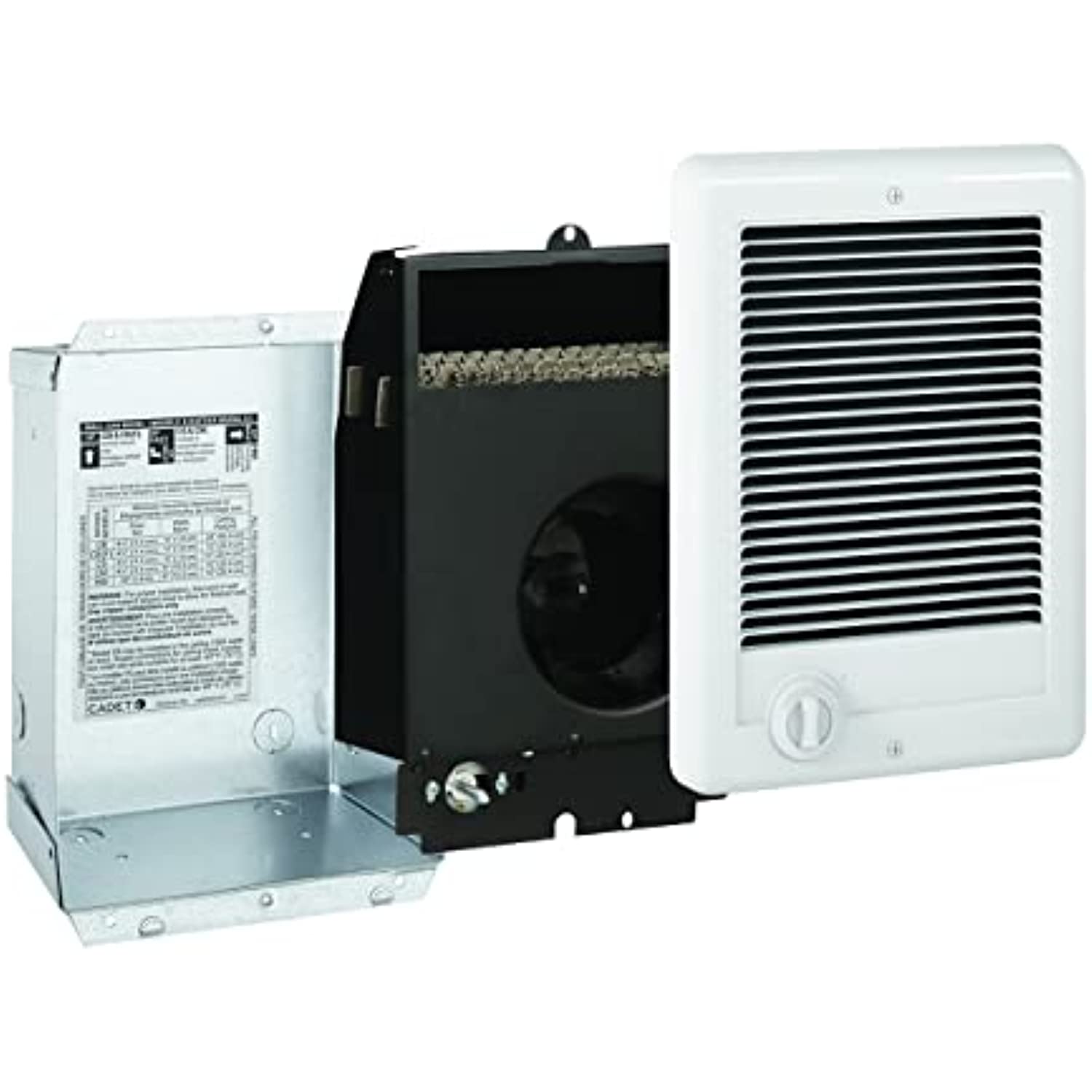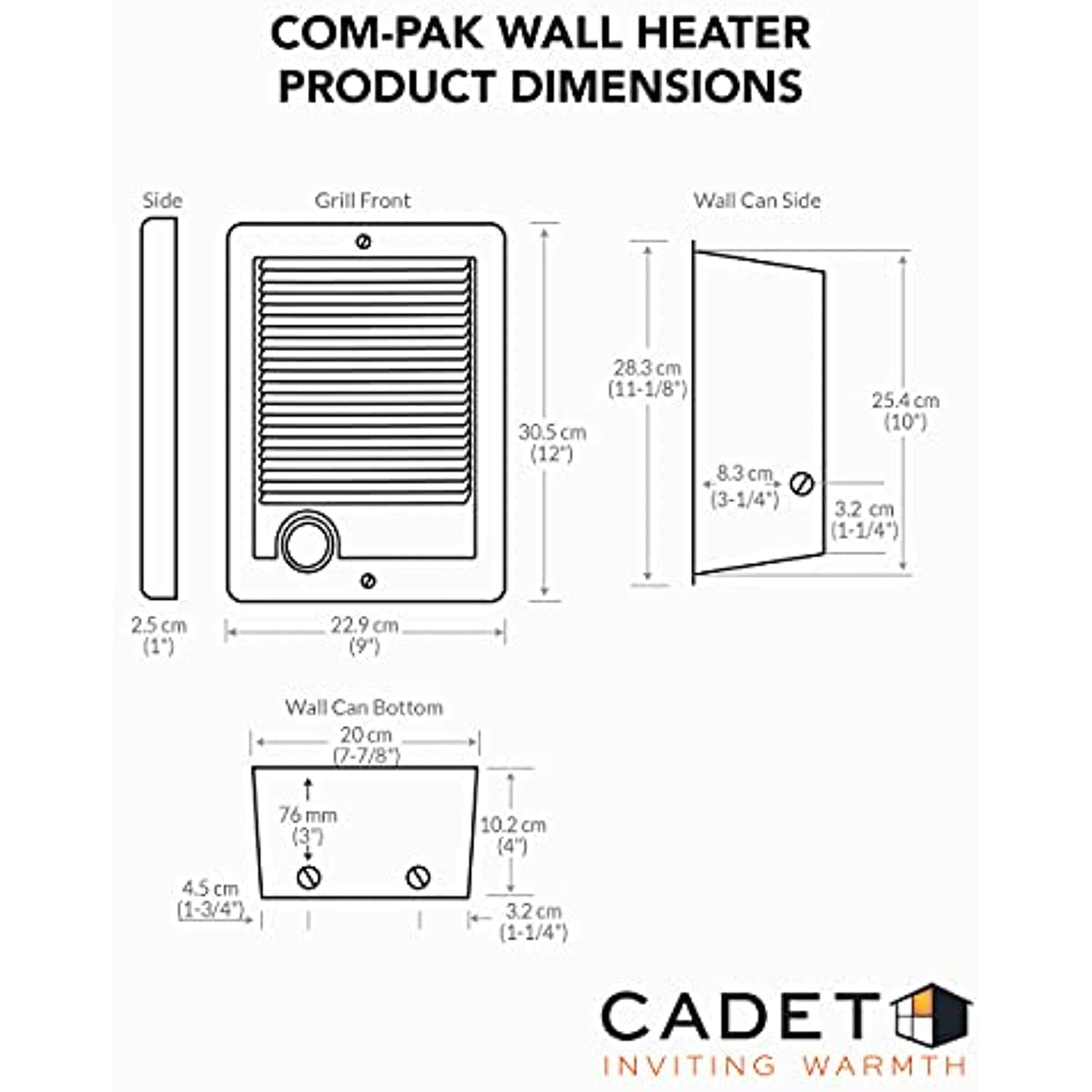 Enjoy lasting warmth with the Cadet Com-Pak Electric Wall Heater. At 240 Volts and 1500 Watts it lends a powerful performance to medium-sized rooms. This model includes a wall can, heater, grille, and thermostat, making temperature control a breeze. It suits the layout of any room with horizontal, vertical, or ceiling mounting options. Rest easy with a high-temperature safety shut-off feature and a powder-coated finish to eliminate sharp edges. Proudly assembled in the USA and includes a 2-year warranty. California Residents: Proposition 65 Warning.