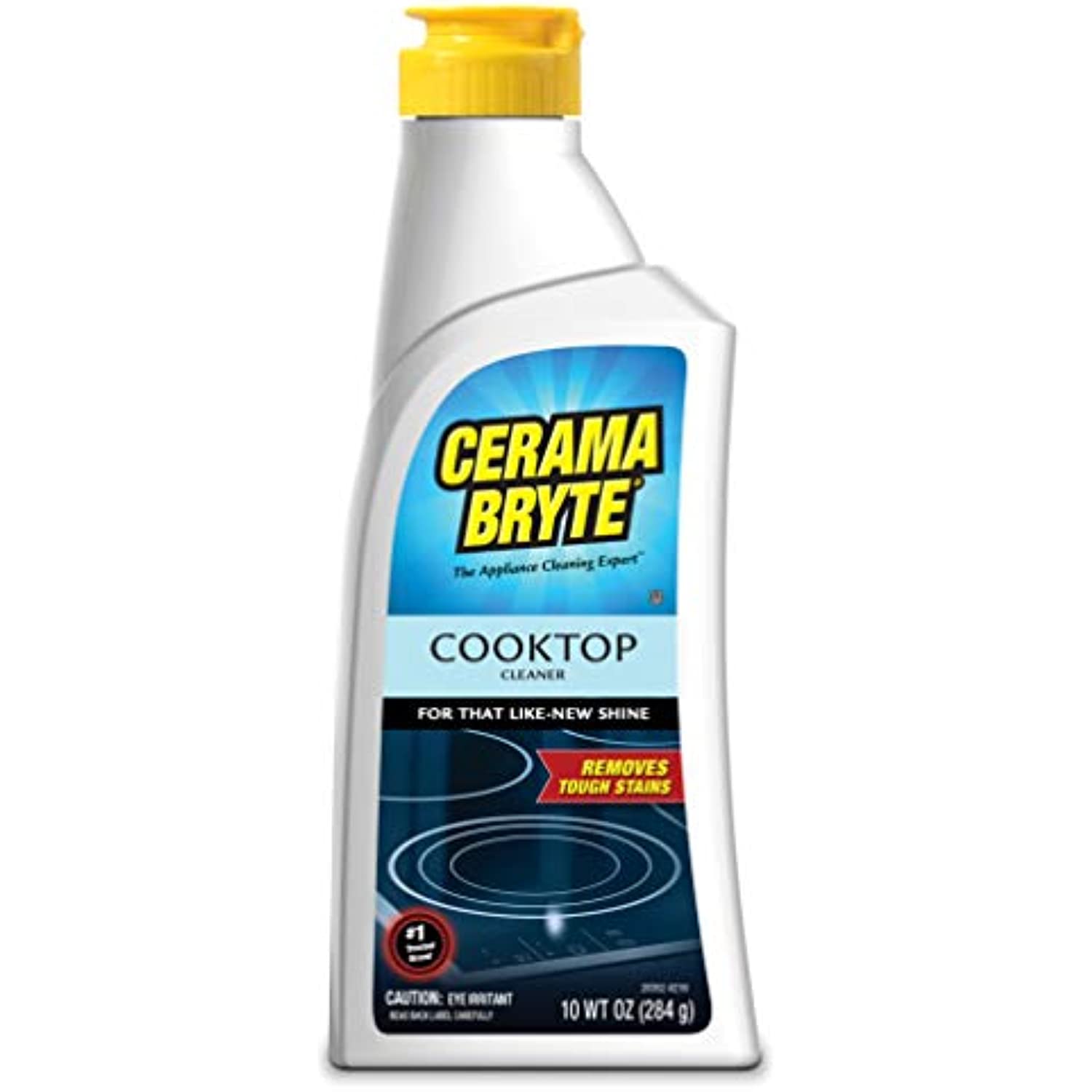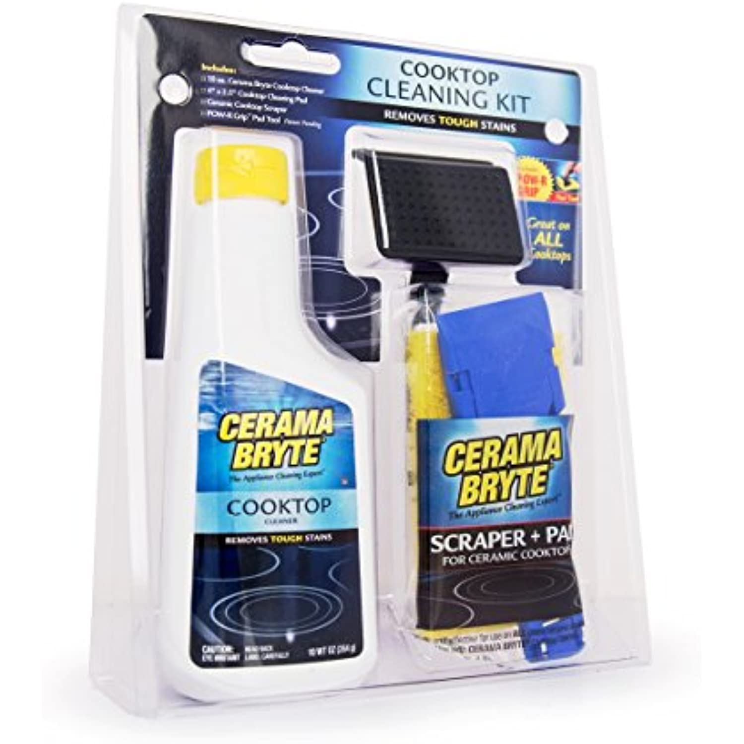 Product Description      Cerama Bryte - Cooktop Cleaning Kit - Includes 10 oz. Bottle of Cerama Bryte Cooktop Cleaner, 1 Cleaning Pad and 1 Scraper.Cooktop cleaner safely & quickly removes stains on ceramic cooktops      From the Manufacturer      Our innovative Clear-View Cooktop Cleaning Kit allows consumers to see the full value of our most popular set of cooktop cleaning products. Featuring a 10-ounce bottle of the number one cooktop cleaner formula in the world, Cerama Bryte Cooktop Cleaning Kit has all the tools necessary to keep any smooth top range looking like new. Cerama Bryte is the choice for removing tough stains while regular use helps maintain shine and performance. In addition to the cleaner, each kit contains one Cerama Bryte Cooktop Scraper -- specially designed to work at an appropriate angle for cleaning effectiveness, two Cerama Bryte Cleaning Pads -- right-sized for cleaning cooktops, and the patent-pending POW-R Grip Pad Tool -- the perfect compliment to the cleaning pads for a secure grip and extra leverage while cleaning.