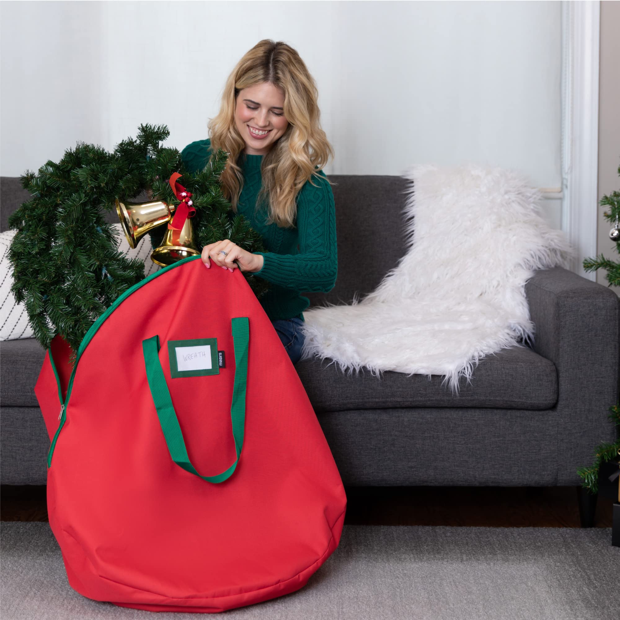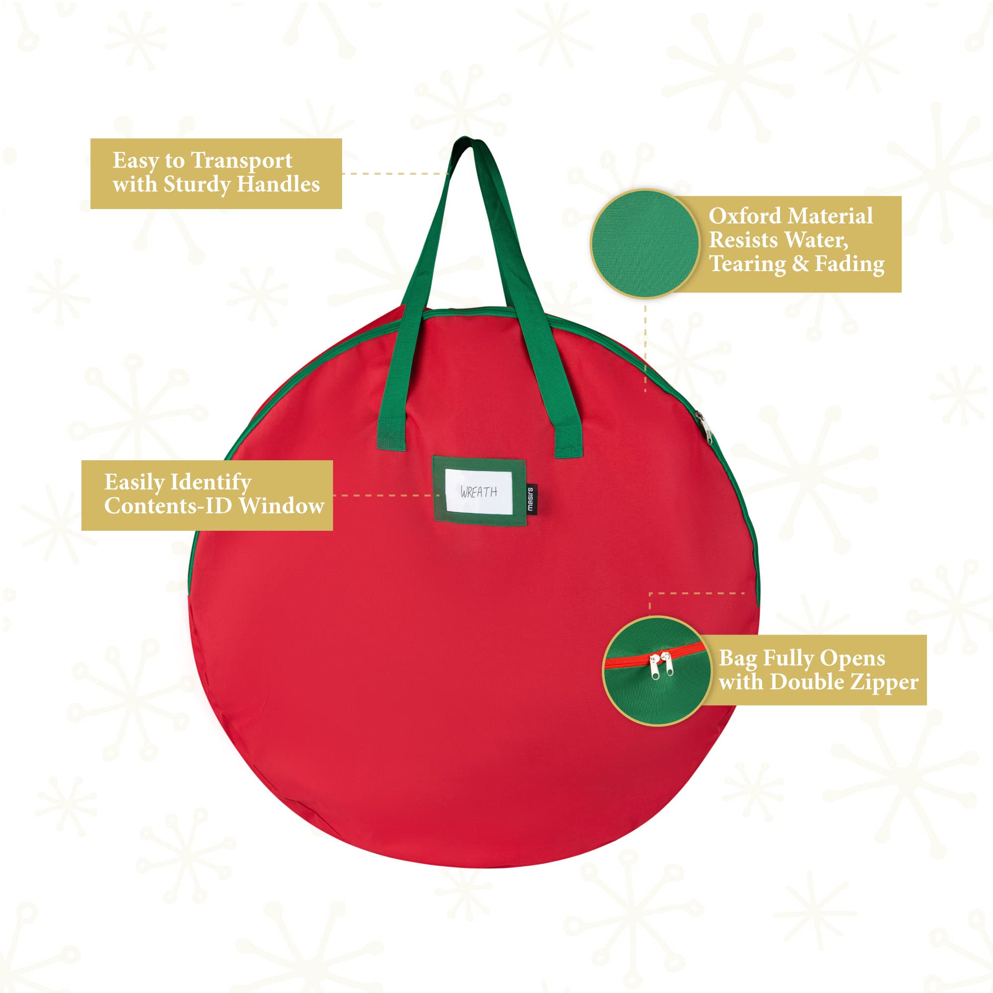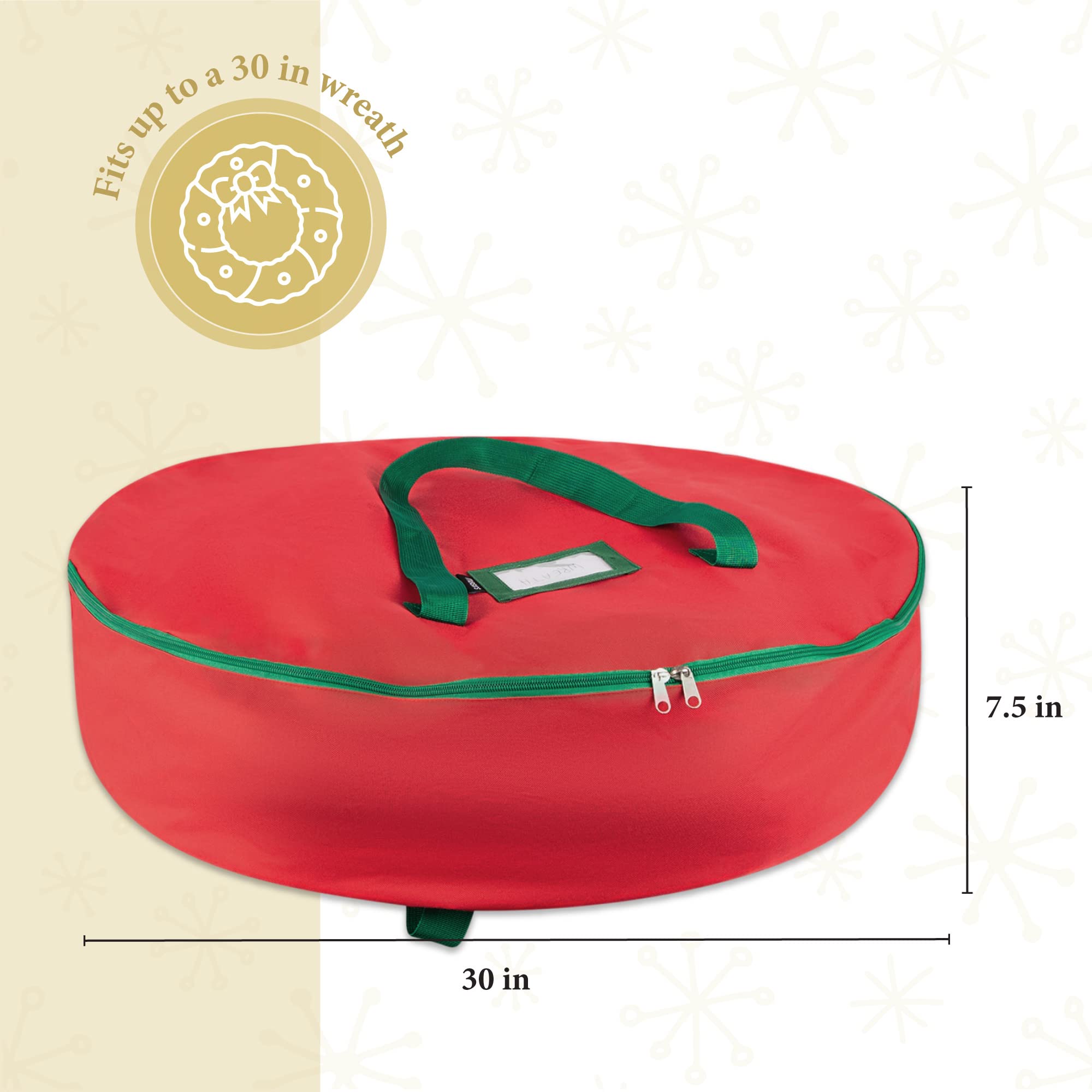 afely keep your Christmas wreaths in perfect condition using this lightweight durable wreath storage case. Here is the simple solution to provide your special wreaths with the cover they need to keep them in beautiful shape for next year. This case will shield your wreaths and protect them from dust and dirt from season to season. The convenient zipper makes it simple to effortlessly slip your wreath in and out. And, the handle provides an easy way to carry it. Alternatively, the handle can be used to safely hang your protected wreath from a hook wherever you choose to store it. The Christmas Wreath Storage case is designed in holiday red so you can instantly find it among your stored items. Made of durable material; you’ll be able to reuse the Christmas Wreath Storage case from year to year. Tuck in your wreath and rest assured you’ll find it ready to hang back on the door next year. The Christmas Wreath Storage Case is 30 inches wide and 7.5 inches high; it can store a wreath up to 30 inches in diameter.