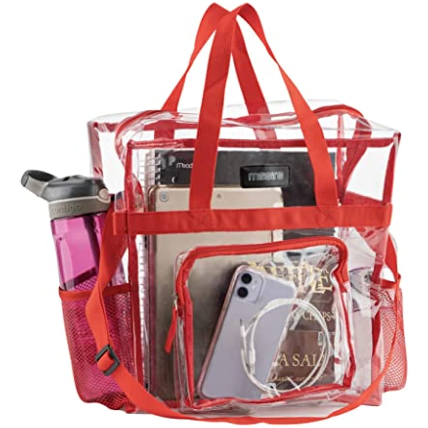 Clear Tote Bag Stadium Approved - Mesh Pockets, Shoulder Straps and Zippered Top. Perfect Clear Bag for Work, School, Sports Games and Concerts. Meets Stadium Tournament Guidelines. (Red)