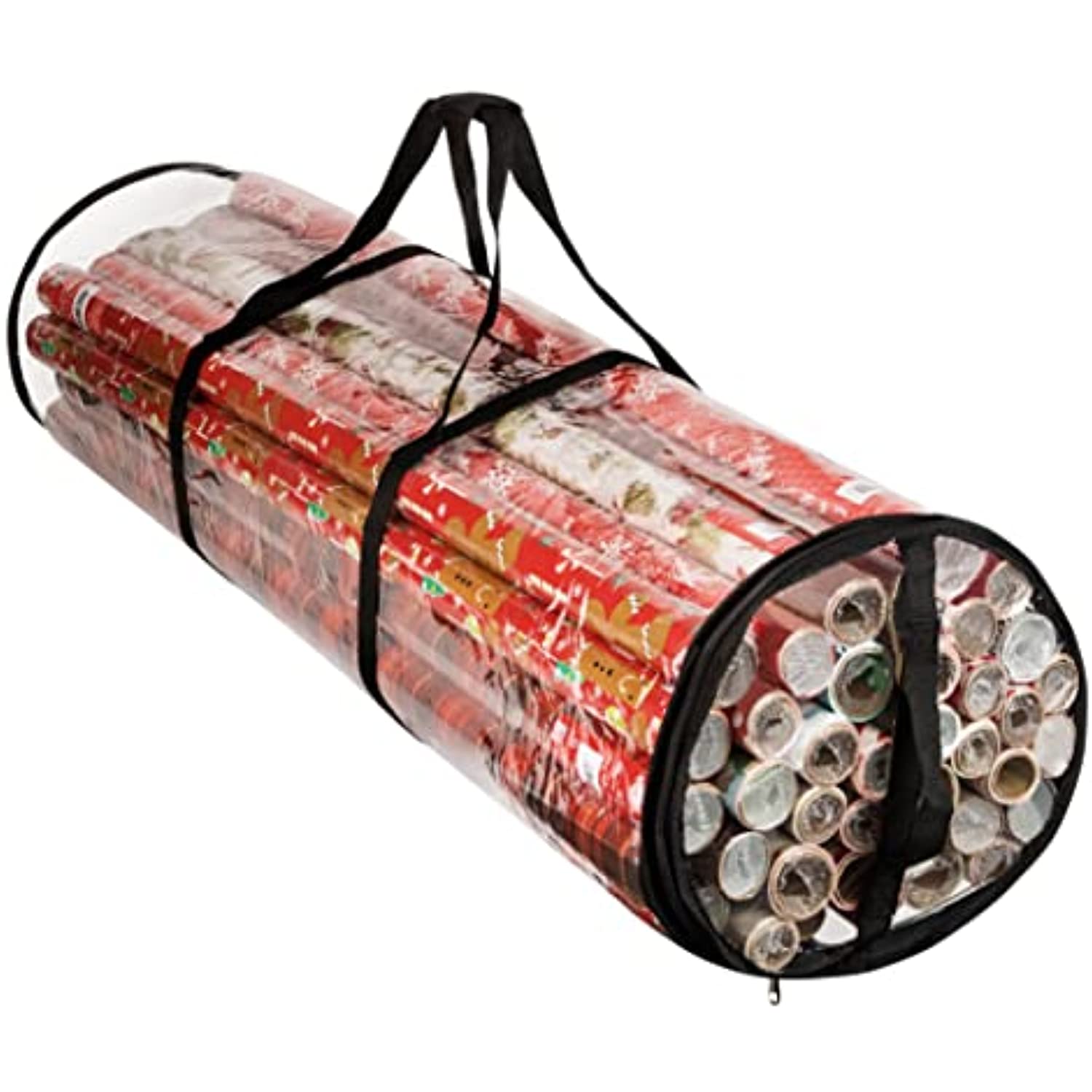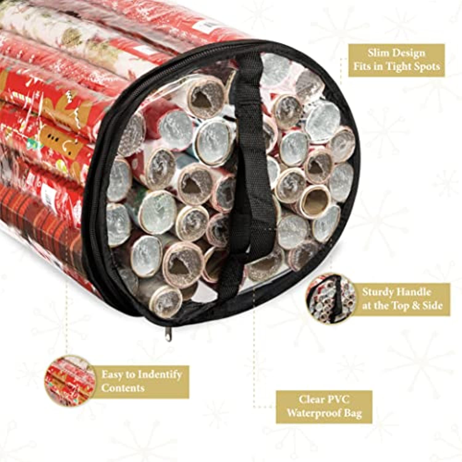 SAVES SPACE Slim design fits easily under beds, in closets or other narrow spaces, while still holding 14 to 25 rolls of gift wrap, up to 40 inches in height. Collect plenty of rolls without compromising on space. PROTECTS PVC material locks out dust and moisture, maintaining your gift wrap in perfect condition. Keep your favorite rolls year to year without worry. PRACTICAL DESIGN The dual zipper makes it easy to open the storage bag wide to access the rolls without damaging them, and reinforced handles make it easy to carry the storage bag anywhere. Transparent PVC material allows you to find what you need easily.
