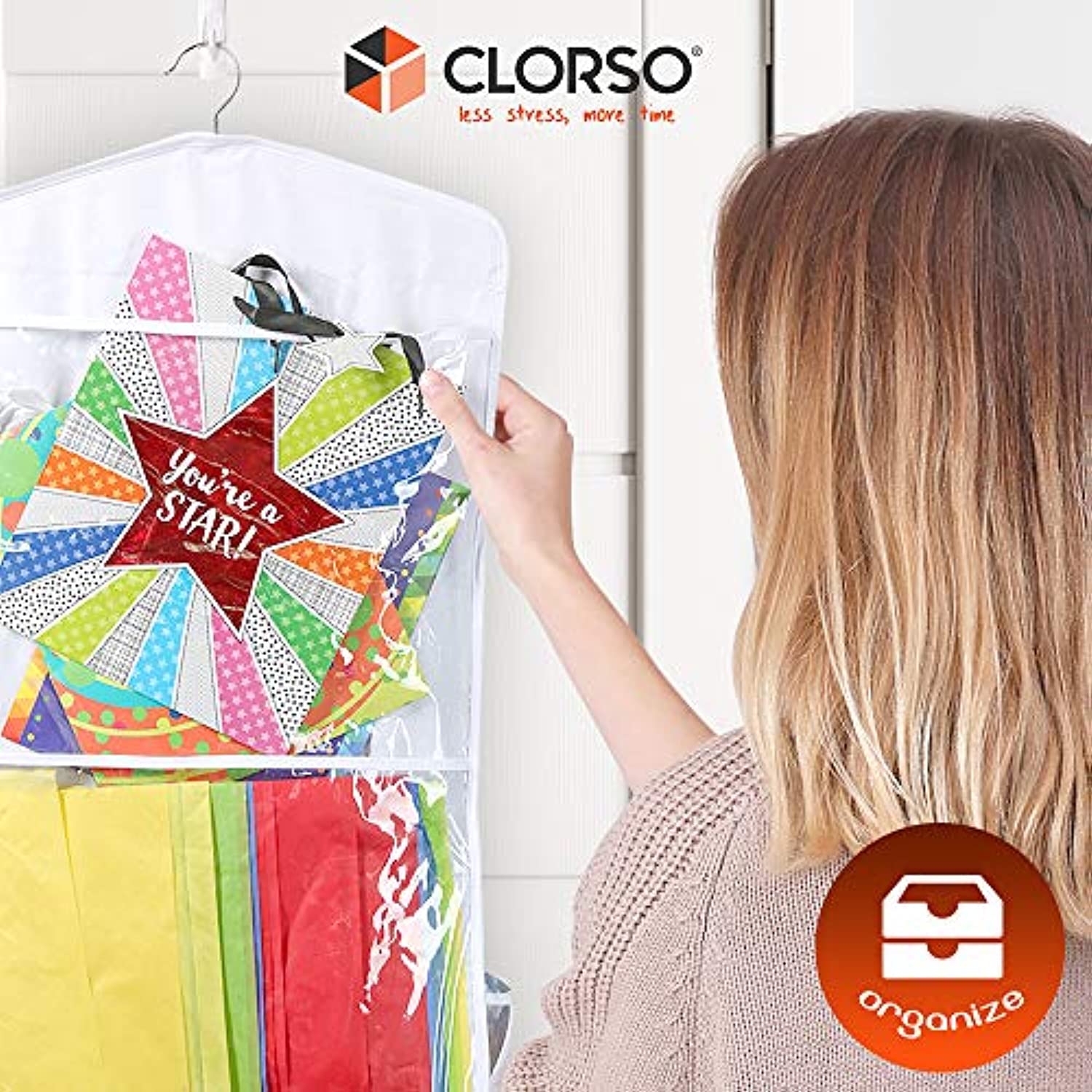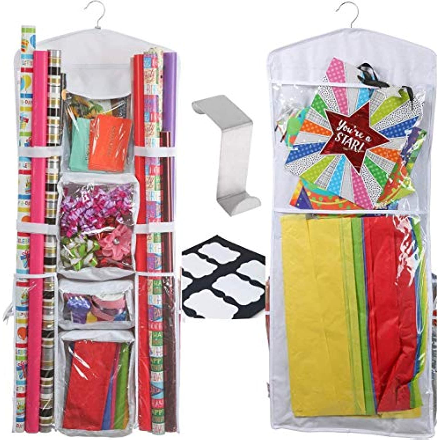 MAKES BIRTHDAY AND CHRISTMAS WRAPPING A BREEZE. Imagine how simple gift giving would be if ALL your wrapping paper, bows, tape, scissors, and accessories were organized together. This handy Gift Wrap Organizer has a big 40 inches length and 17" Wide with double sided storage. There are 2 additional Straps on top making it easy to neatly store those extra long rolls of wrapping paper. It's got 10 roomy pockets including a zippered pocket, that it makes a great gift wrapping ribbon organizer. Hangs with a strong steel hook over any door. Extra large pocket perfect for large gift bags. You won't have to fold them over. This is the ultimate space saver for closets and storage rooms. TAKES THE STRESS OUT OF CHRISTMAS Your life is very busy. Add a holiday to the mix and many of us are about to pull our hair out. This handy gift wrapping supplies organizer makes wrapping presents go ten times faster. Everything is within reach where it's easy to grasp. Just right for storing Christmas cards and Birthday cards. Great for umbrellas, yoga mats, pool noodles, or other cool toys. Also wonderful for notepads, notebooks, glue, markers, pens, yoga mats, paint brushes, baseball bats, toy bats, and bubbles. CONVENIENT HANGERS and RUGGED CONSTRUCTION This plastic wrapping paper holder won't rip, tear, or break even when loaded down with lots of paper rolls, bows, and supplies. Seams are hemmed with strong white plastic. The cover is clear so you can see what is inside the bag at all times. Safety Hanger design won't poke or injure you when using. Hanger has a ballpoint tip for safety. LOTS OF SATISFIED CUSTOMERS. Many customers love this organizer so much they return to buy another. This makes a much-appreciated gift for friends, family, and co-workers.