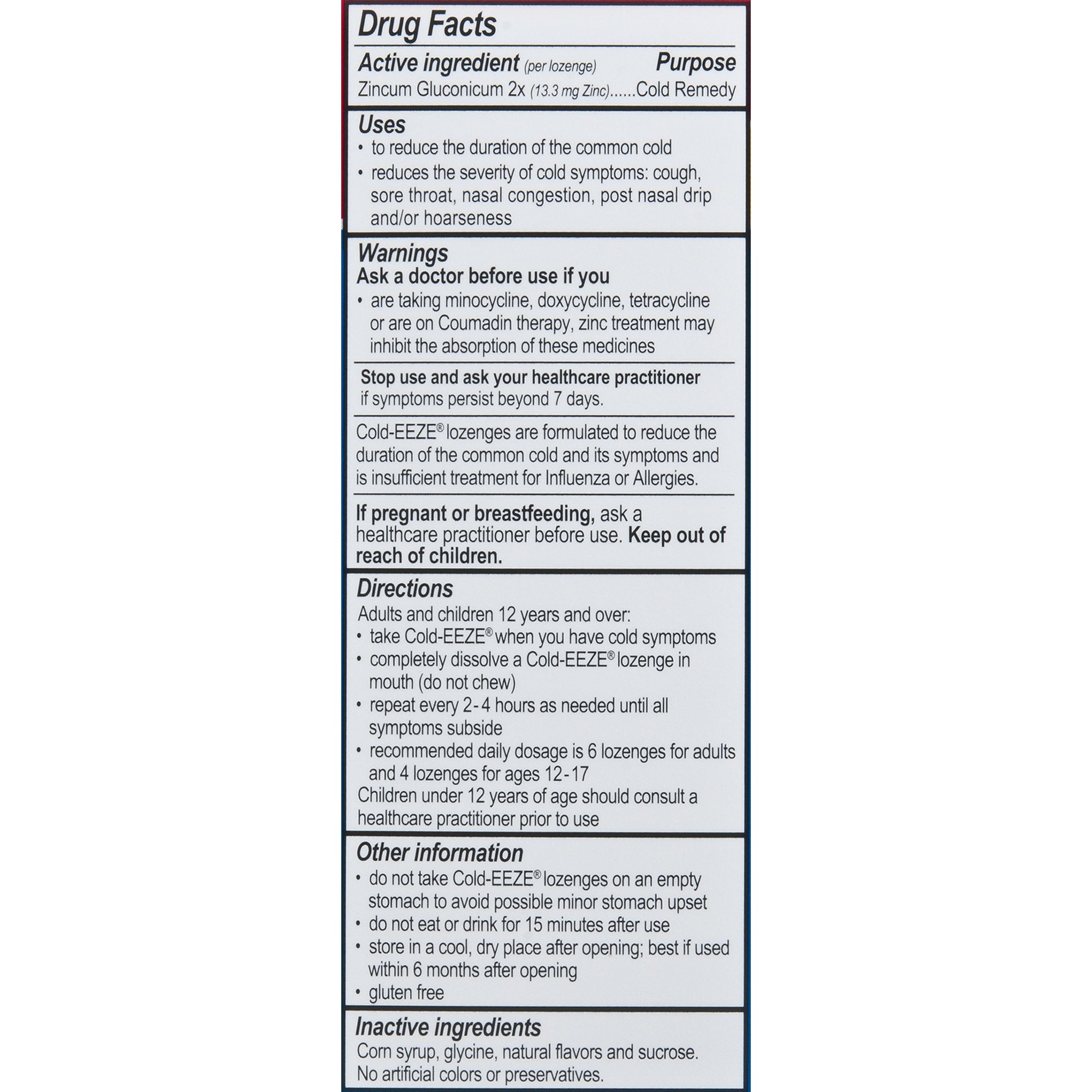 - safety warning: Ask a doctor before use if you are taking minocycline, doxycycline, tetracycline or are on Coumadin therapy, zinc treatment may inhibit the absorption of these medicines. Stop use and ask your healthcare practitioner if symptoms persist after 7 days. Cold-EEZE lozenges are formulated to reduce the duration of the common cold and its symptoms and is insufficient treatment for Influenza or Allergies. If pregnant or breastfeeding, ask a healthcare practitioner before use. Keep out of reach of children.
