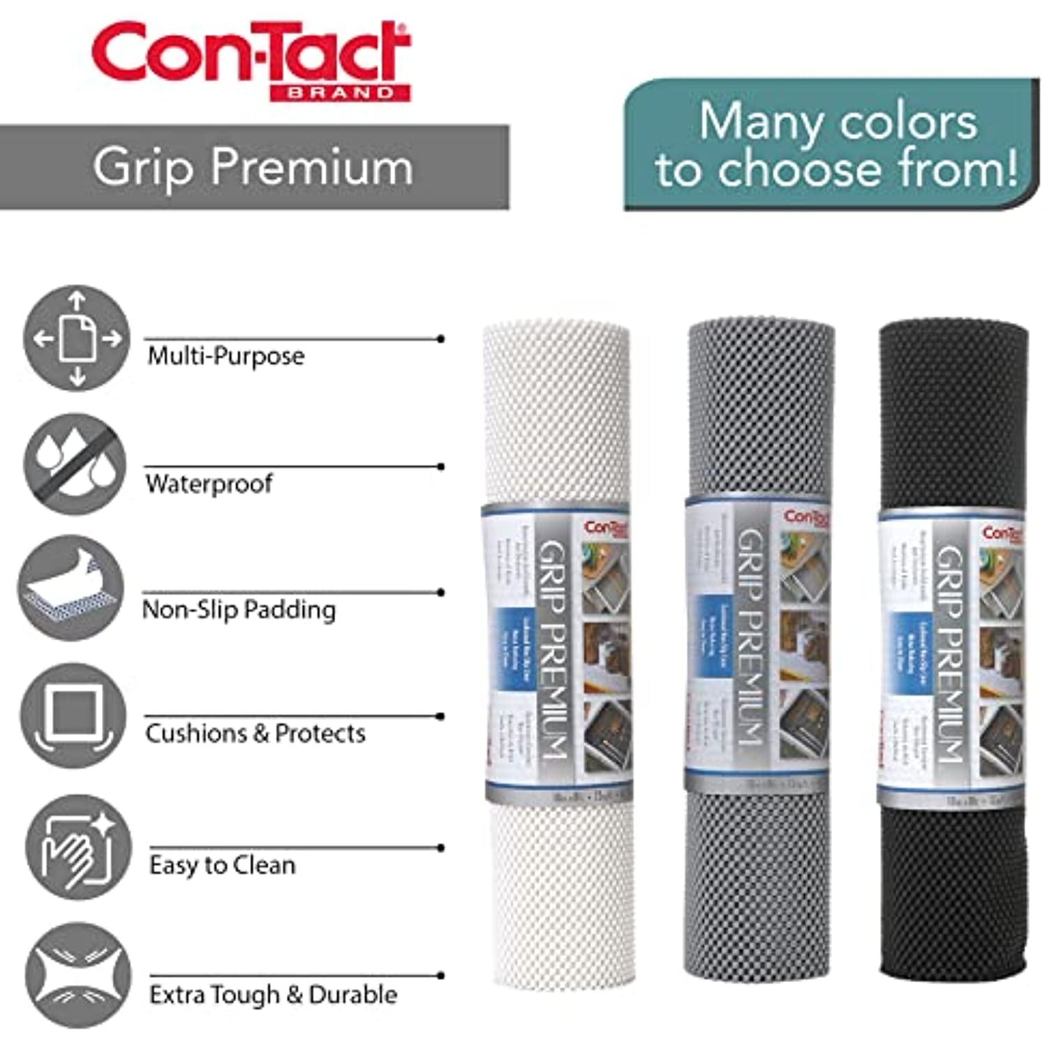Con-Tact Brand's thickest cushioned Grip Premium Solid Shelf and Drawer Liner sets the industry standard for the ultimate in high level cushioned protection and are made from a compound designed for its non-slip properties. Con-Tact Brand's Grip Premium Solid Liners works as a barrier in drawers and shelves to keep utensils and dishes neat and safely secure. With our latest innovative and fashion-forward products in sophisticated colors and patterns, Con-Tact Brand products continue to lead the industry. Our colors and materials are coordinated from one substrate to another so our customers can mix and match to their delight. As you can expect only from Con-Tact Brand products, our premium high-quality shelf and storage liners lead the industry in quality and value. Whatever the room, whatever the surface, Con-Tact Brand's got you covered.