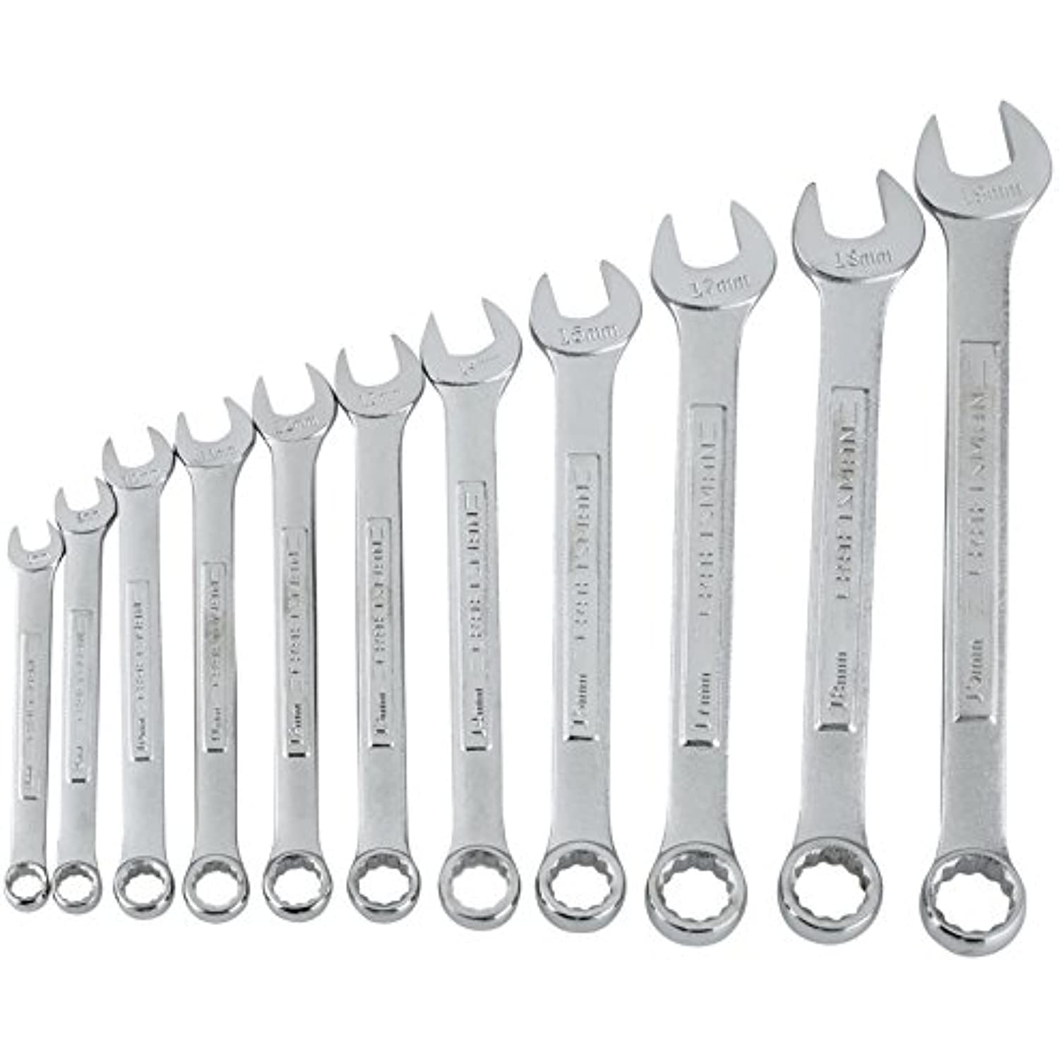 - The set includes 11 wrenches in 8, 9, 1, 11, 12, 13, 14, 15, 17, 18 and 19mm