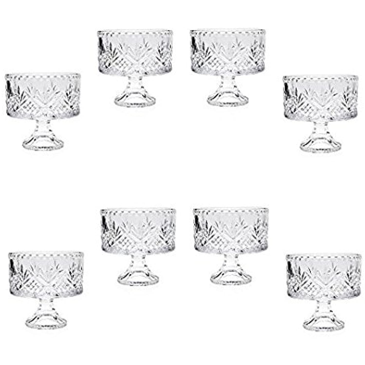 Display your decadent truffle cake or a plentiful array of fresh fruits with this chic crystal dessert bowl, featuring a footed base and etched details. Serve superb fudge sundaes or tiny trifles with these exquisite dessert cups. Beautifully crafted from glass with intricate designs, they create an opulent presentation on the table. Includes eight trifle dishes and eight spoons. These are great glasses. The design is classic, clean, and unfettered. The glasses are sturdy and are unmistakably for desserts. Beautiful stems and ringing glass, Fruits, or Ice cream look fantastic in these and sit very stably and very straight, the glass stems being properly delicate and straight. The basic design will fit into anyone's décor, a fine addition to anyone's décor glass inventory.FEATURES