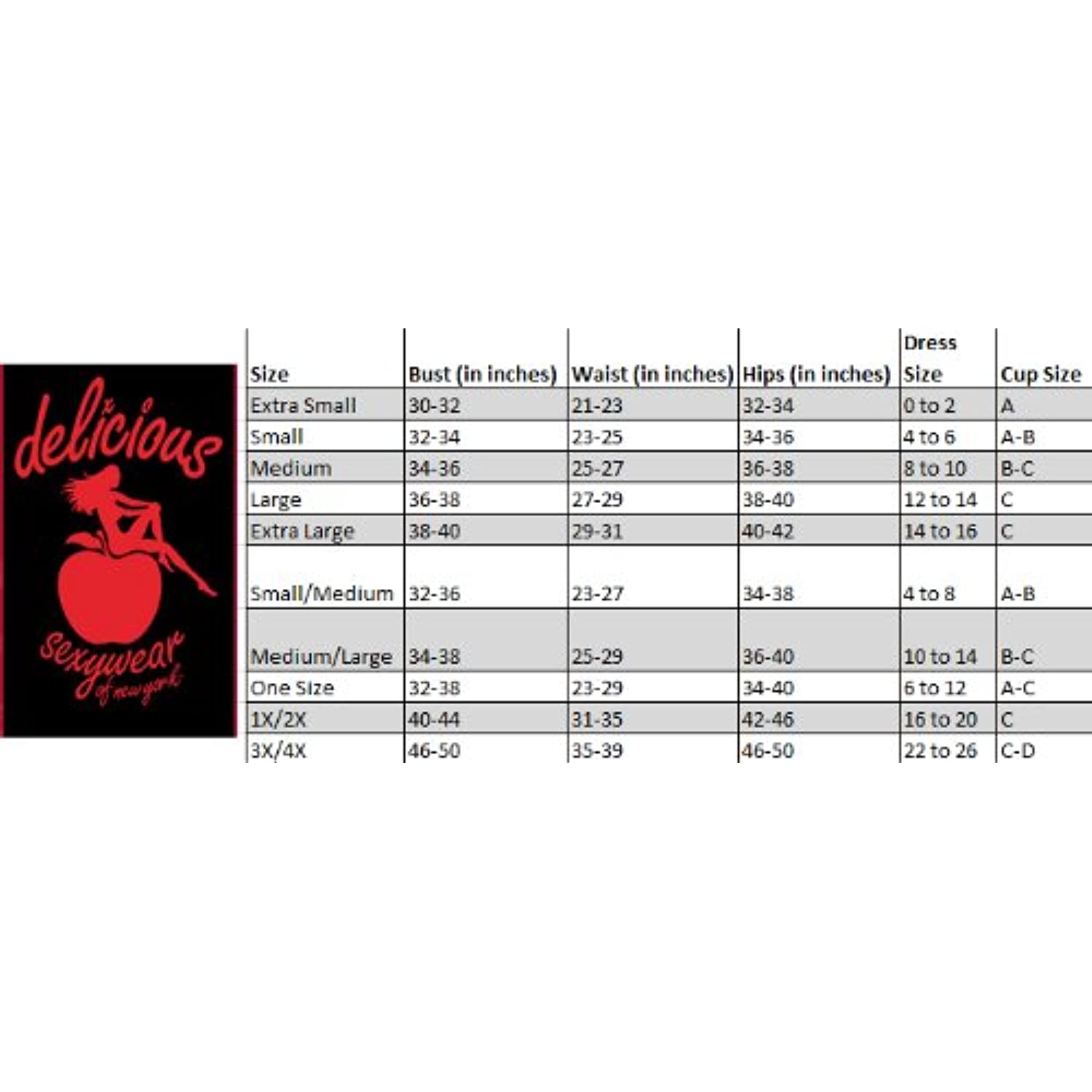 - Note: costume sizing is different than apparel sizing, review the Delicious size chart and measure before selecting size