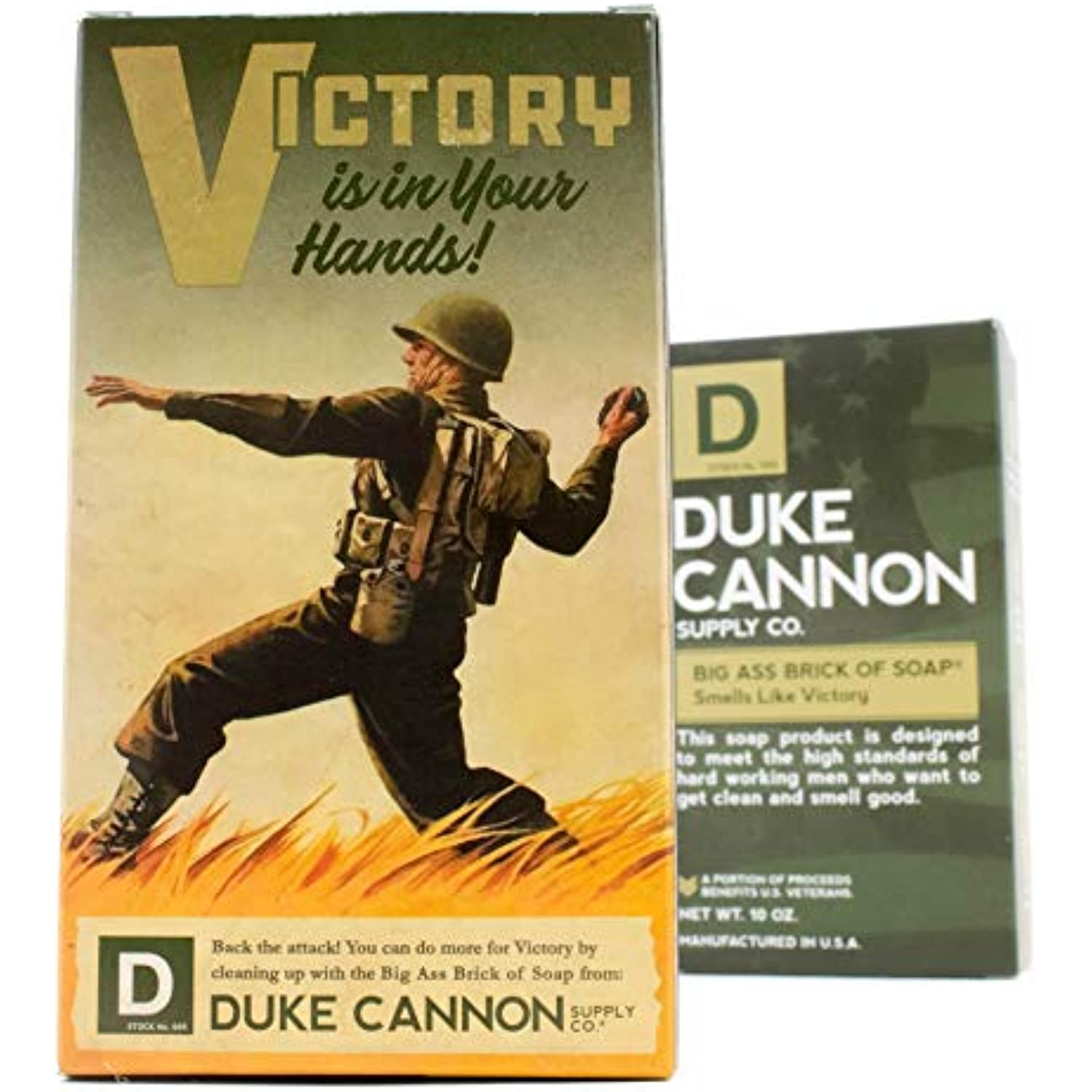 - HONORS THE VETS - To honor the military heritage of our Big Ass Bricks of Soap, this particular item comes in our limited edition WWII-era propaganda package, reminding you that "Victory is In Your Hands!"