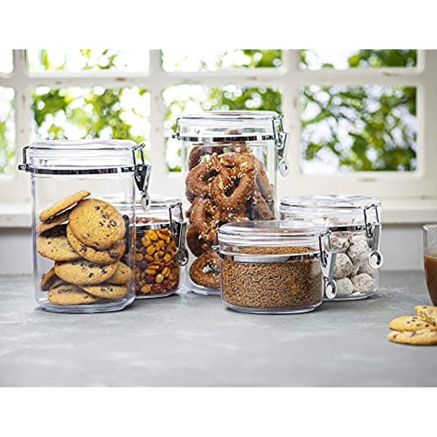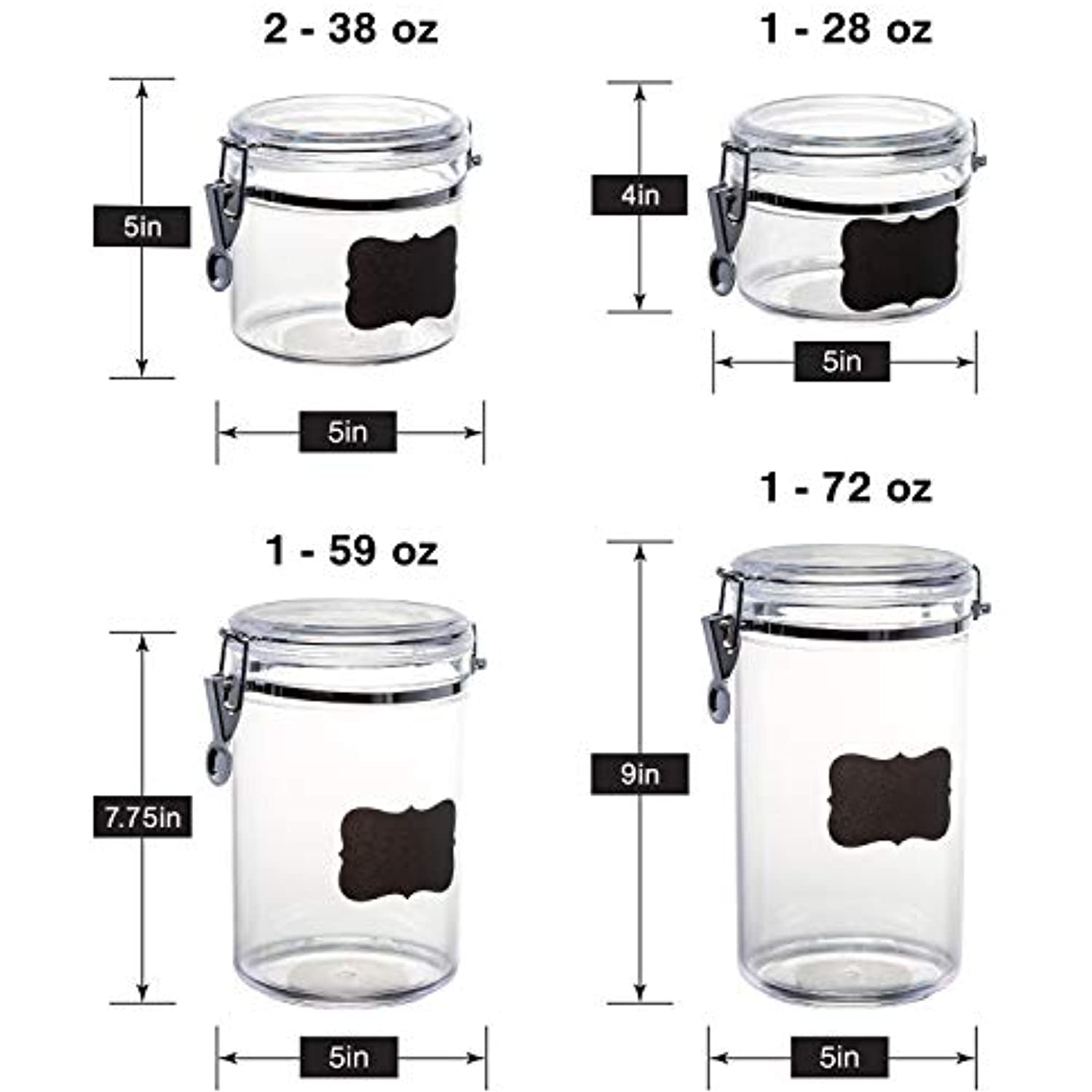 - COMES IN AN ASSORTMENT OF CONVENIENT SIZES: Five canisters sized 72 oz. (holds 9 cups), 59 oz. (holds 7.5 cups), 2 - 38 oz. (holds 4.75 cups) and 28 oz. (holds 3.5 cups).