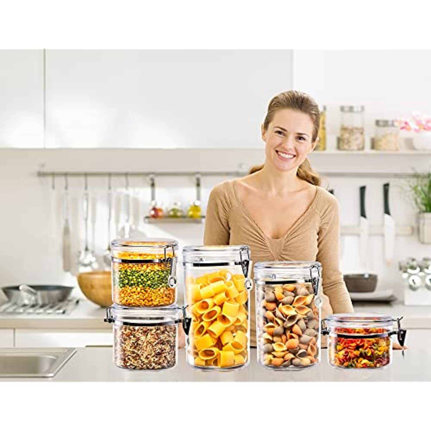Durable 5pc Airtight Clear Canister Set with Clamp Lids + Marker & Labels, Bulk Food Storage Containers for Kitchen Pantry, Tea, Sugar, Coffee, Candy, Flour, Dry Goods, Pasta, Rice, Spices, & Herbs