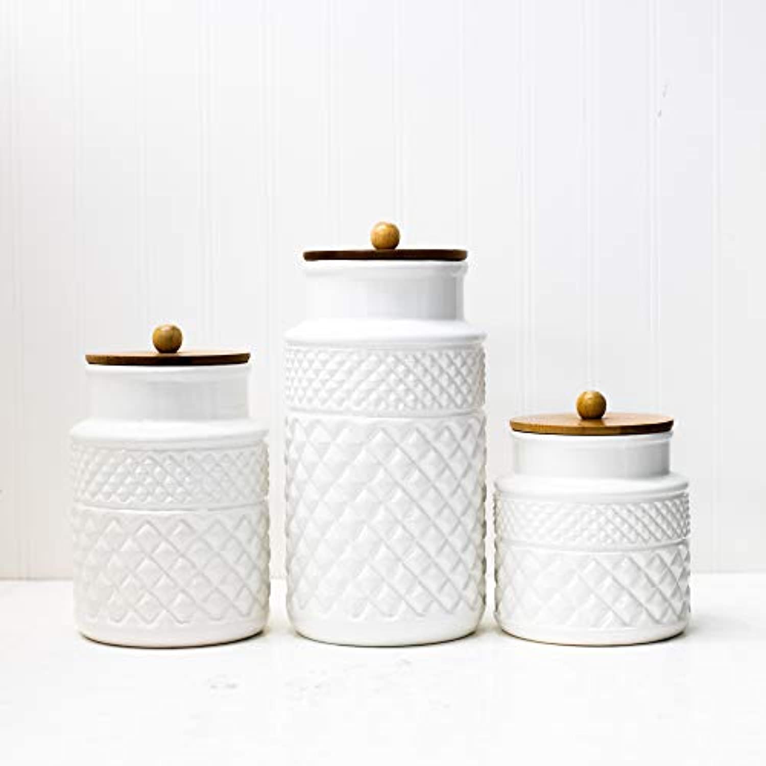 HOME ESSENTIALS & BEYOND has been the innovative, global resource for trend-forward housewares, tabletop, gift, home décor and lifestyle product for over 25 years. We are committed to the creation of new and exciting products that you can trust and value without compromise. OUR IN-HOUSE product development team travels the globe visiting local markets, artisans and producers, and strives to be at the forefront of creativity, taste, and trend. We believe style inspiration and great design bring joy to life! Faceted Canisters come as a coordinating set of 3 different sizes; Each features a textured pattern and wooden lid with knob on the top. Food canisters are made of glossy ceramic with classic white finish. Storage and organization piece measures approximately 11 x 5 x 5 inches. Perfect for functional use or decorative display in the kitchen. Ships in protective packaging.