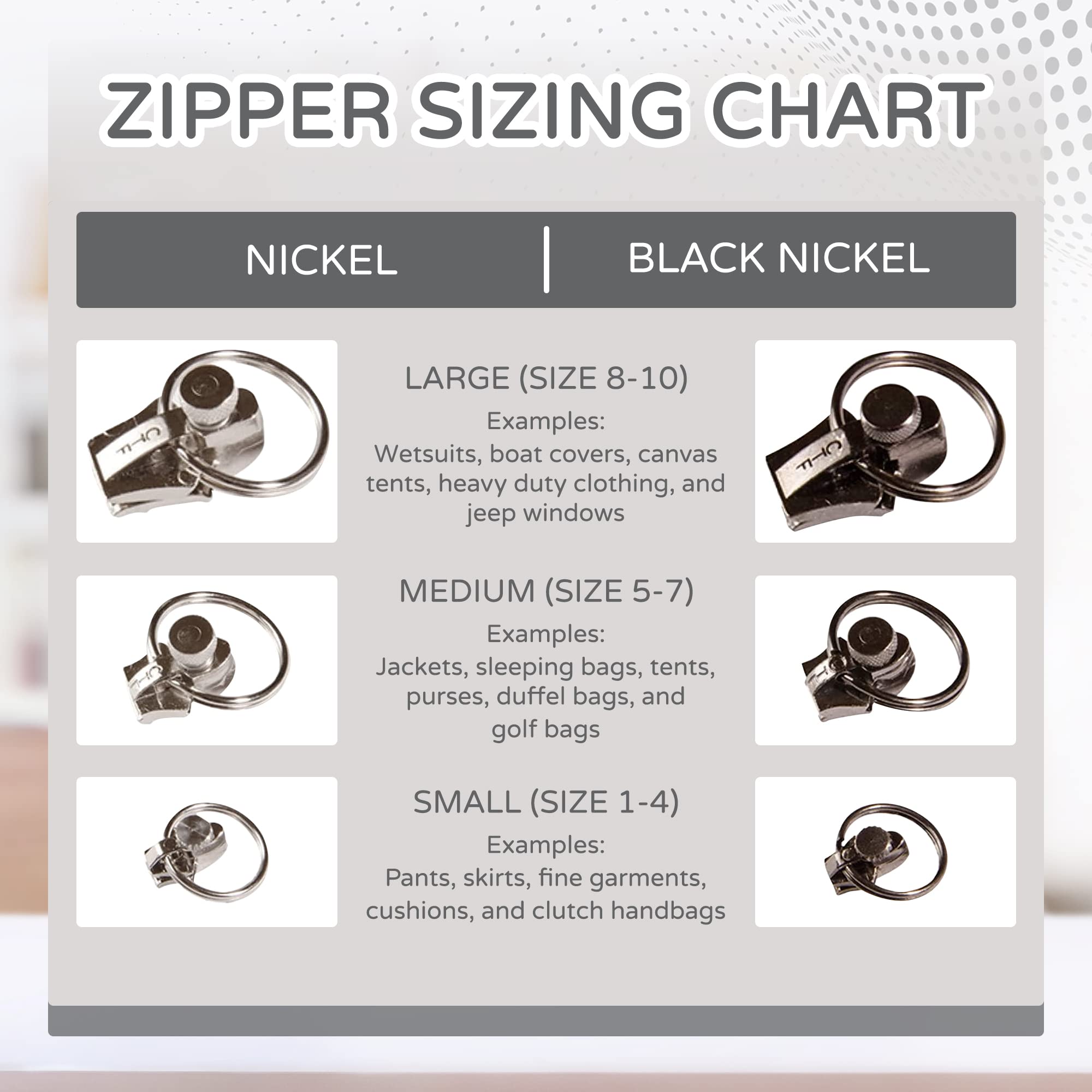 - SIZE GUIDE: Small zipper slider: Tooth and coil sizes 1-4 (pants, skirts, fine garments, cushions). Medium zipper slider: teeth and coil sizes 5-7 (jackets, sleeping bags, tents, purses, duffel bags). Large zipper slider: teeth and coil sizes 8-10 (wetsuits, boat covers, canvas tents, heavy duty clothing)