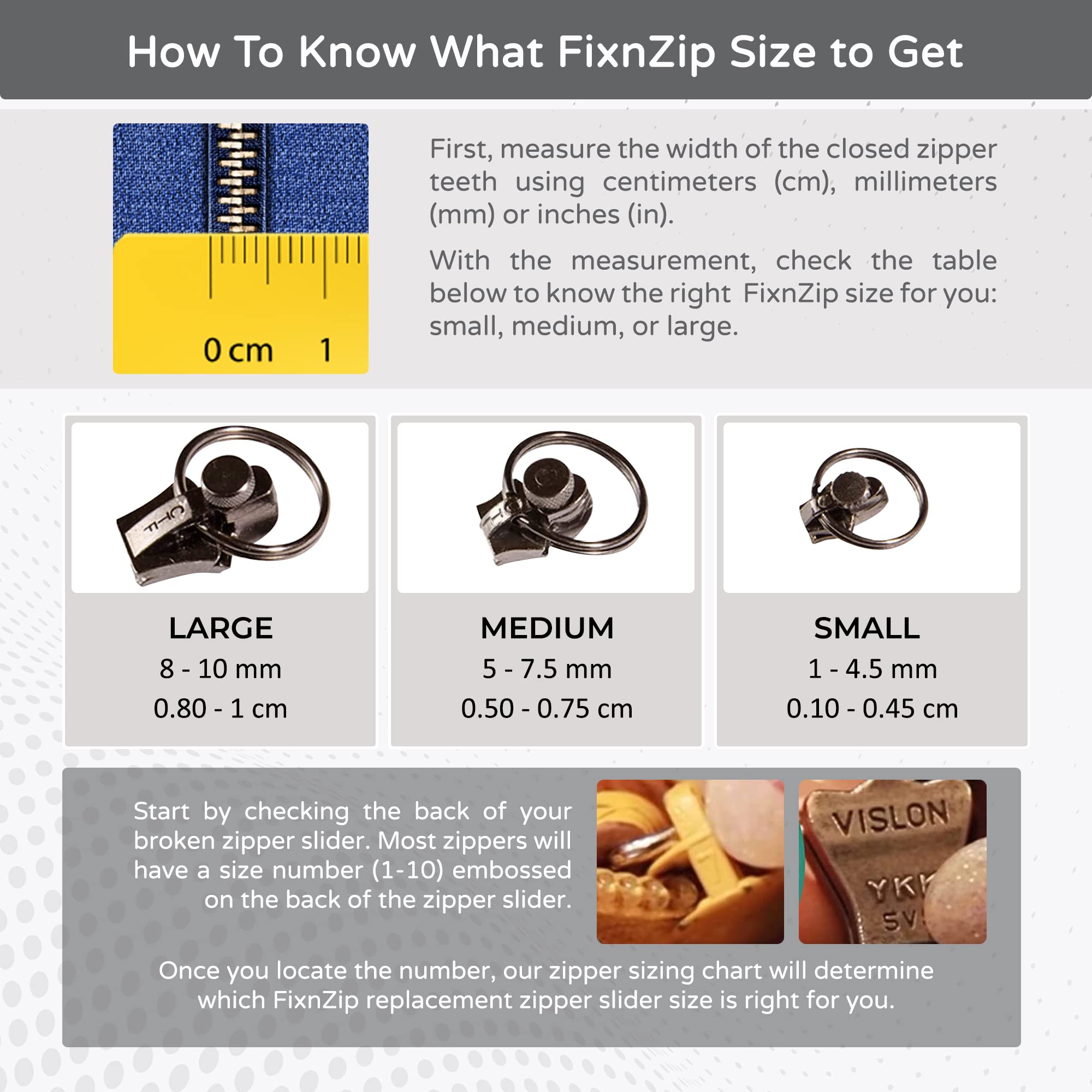 FixnZip (Black Nickel) - Universal Zipper Repair Kit for Jackets, Luggage, Bags - Backpack Zipper Replacement Repair Kit - Instant Zipper Fix (S,M,L) - Made in The USA