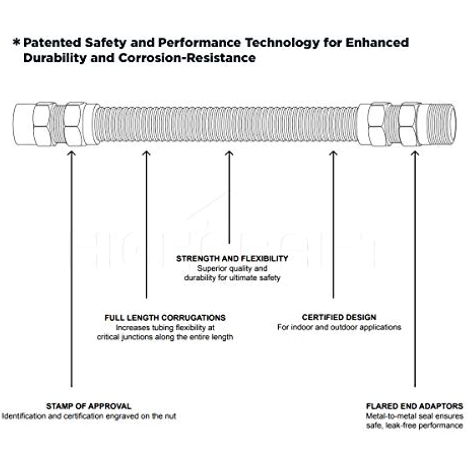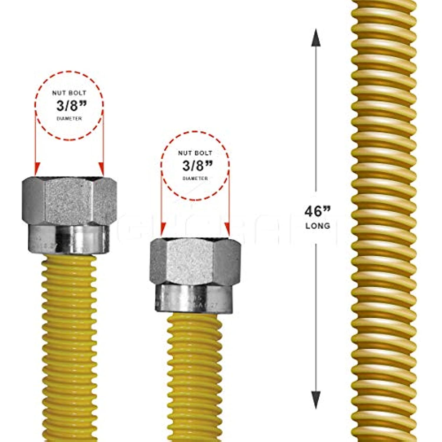 This is a Flextron gas connector from their YC38 series of connectors, which is designed for indoor and outdoor use with gas dryers and water heaters. It has an outer diameter of 1/2 and an inner diameter of 3/8 and is made of stainless steel coated with a yellow epoxy coating along the entire length of the connector. The coating gives it extra protection against corrosion when it comes in contact with chemicals that are typically found in households. On the ends of this 46 long connecter are nut fittings. The connector is rated for use in the temperature range of -40 f to 150 f and can be used up to a pressure of 0.5 PSI. Please consult the product information for the flow capacity for this part, for natural gas. The part meets the amse A112.18.6 and ANSI Z21.24, Z21.69 and Z21.75 gas appliances and manufactured homes standards. Each connector is 100% tested on leaks before it leaves the factory. The design has been tested on strength and it can withstand an internal hydrostatic pressure of 250 PSI or 17 mpa without bursting or showing signs of leaks. It can also endure up to 30 bends without leaks in water at a depth of maximum 2 inches and withstands 15 twists of 90 degree, without showing signs of corrosion. The connector can handle external temperatures of 800 f.