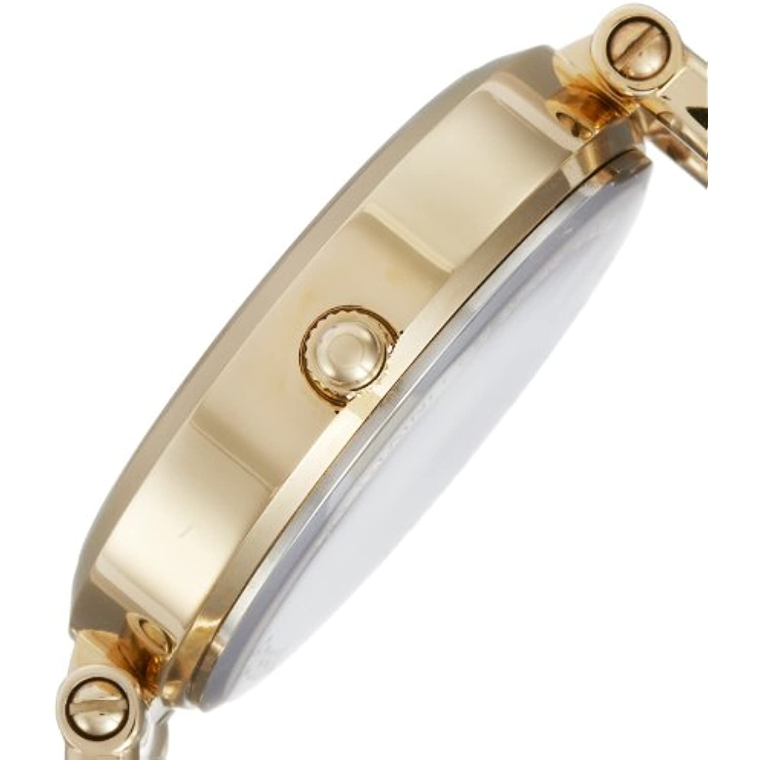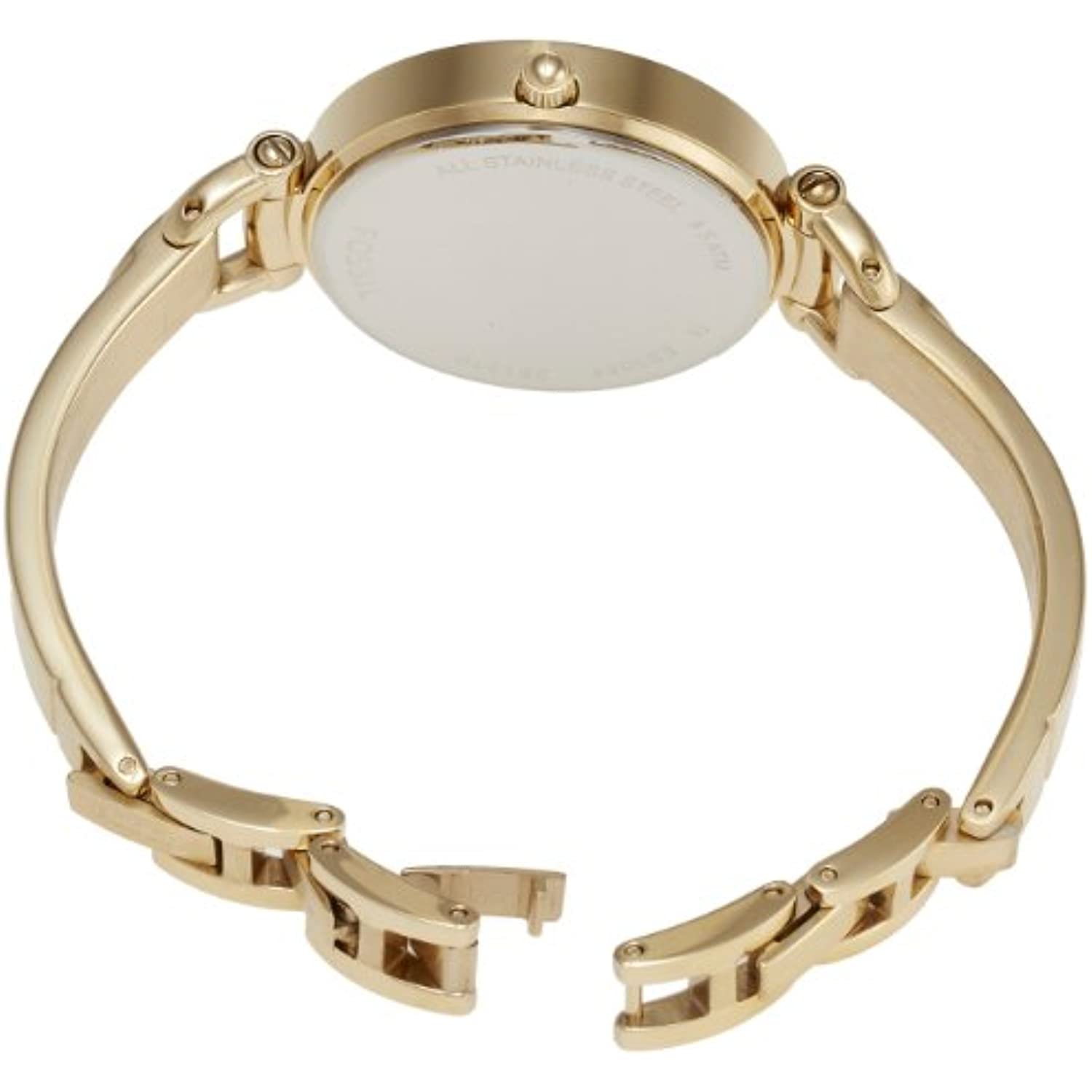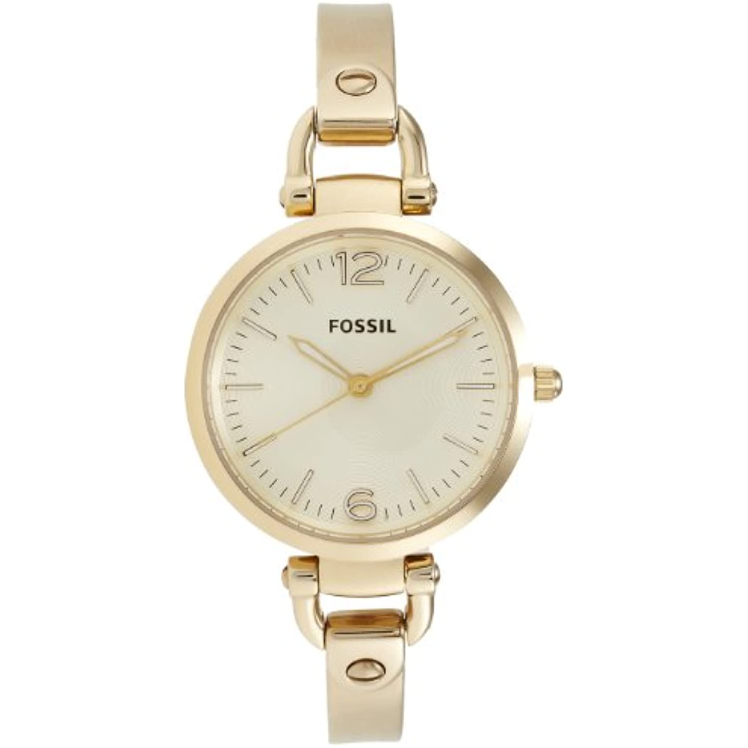 Gold-tone stainless steel case and bracelet. Fixed gold-tone bezel. Champagne dial with luminous gold-tone hands and index hour markers. Arabic numerals mark the 6 and 12 o'clock positions. Minute markers around the outer rim. Dial Type: Analog. Quartz movement. Scratch resistant mineral crystal. Pull / push crown. Solid case back. Case diameter: 32 mm. Case thickness: 9 mm. Round case shape. Band width: 8 mm. Jewelry clasp. Water resistant at 50 meters / 165 feet. Functions: hour, minute, second. Casual watch style. Fossil Georgia Champagne Dial Gold-tone Ladies Watch ES3084.