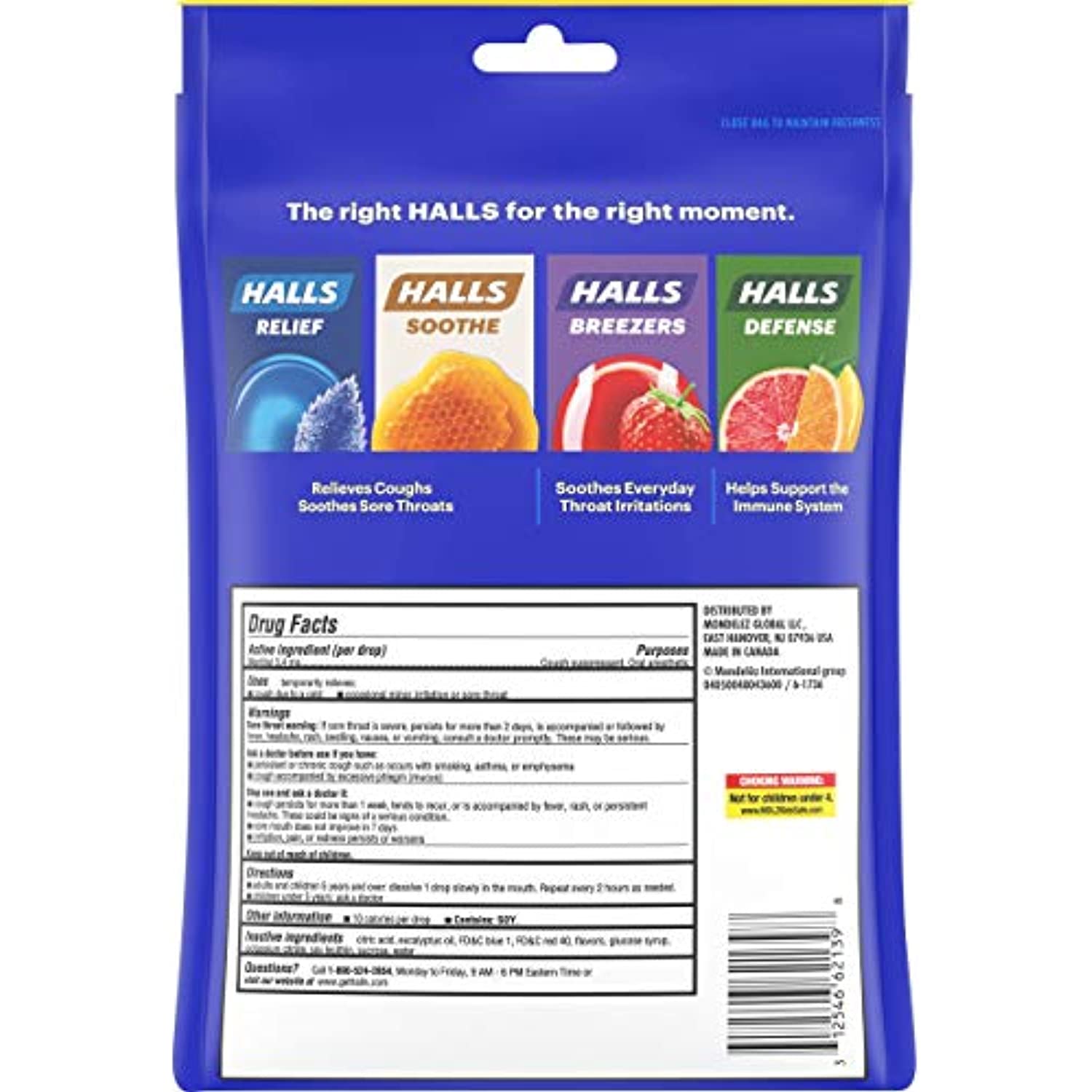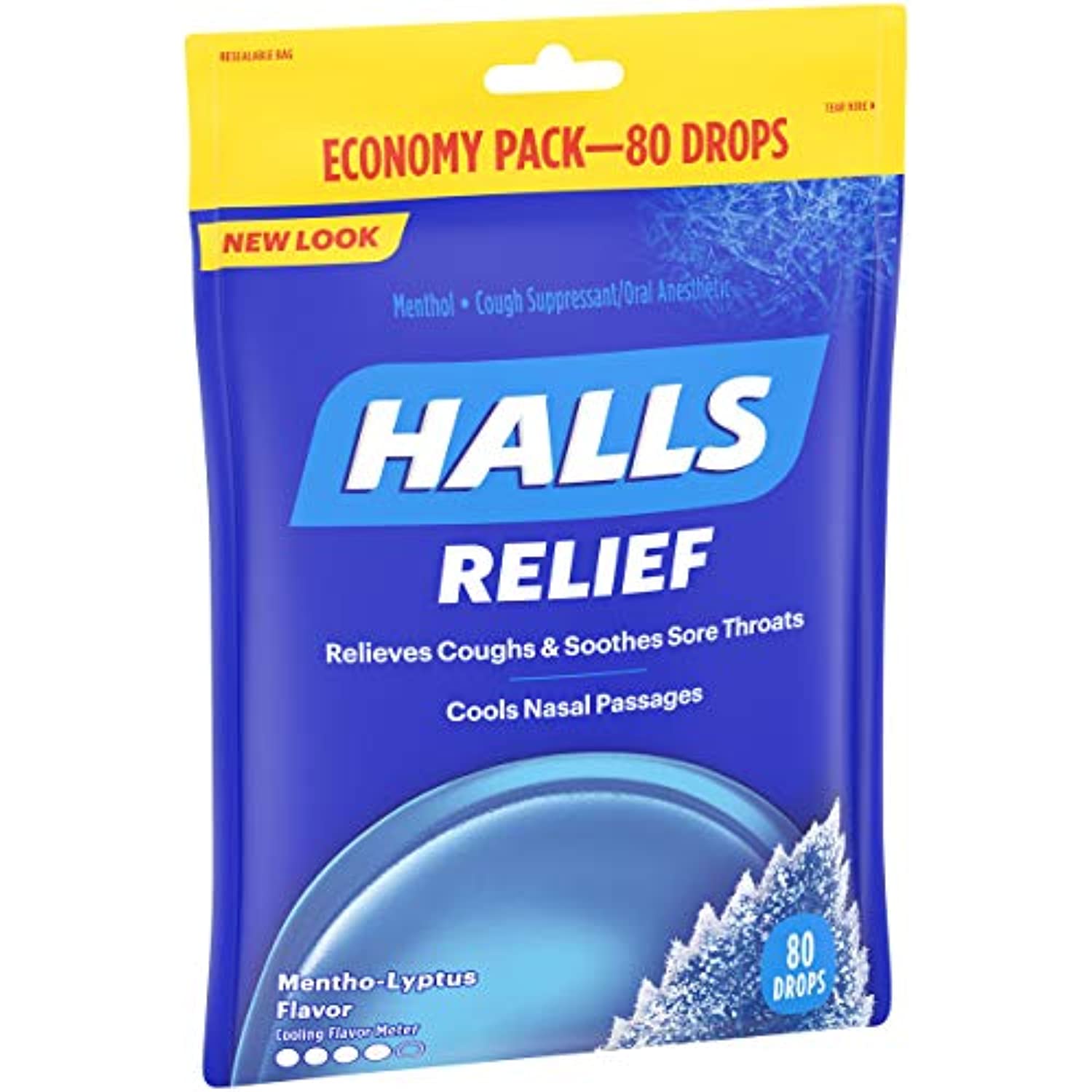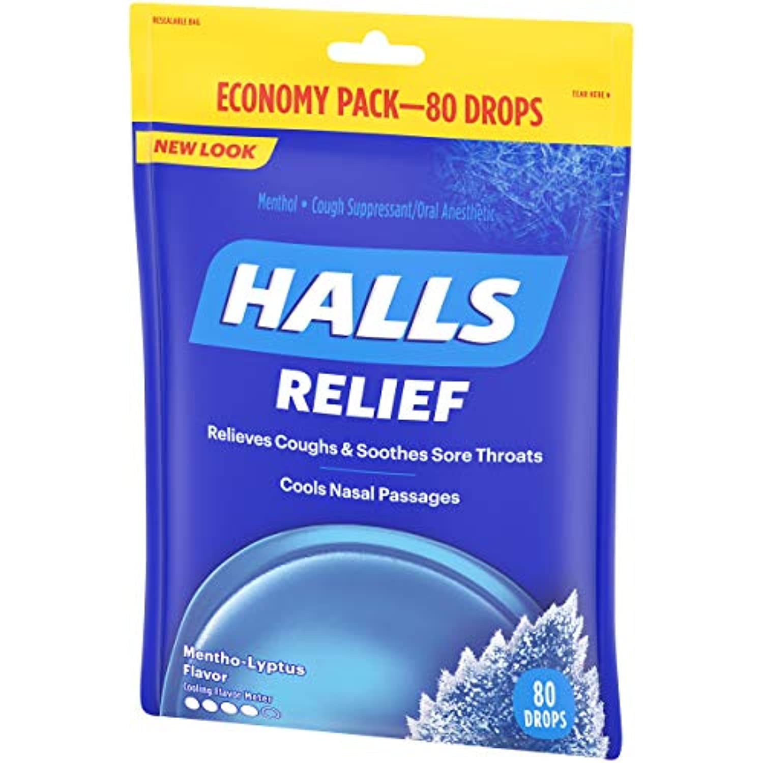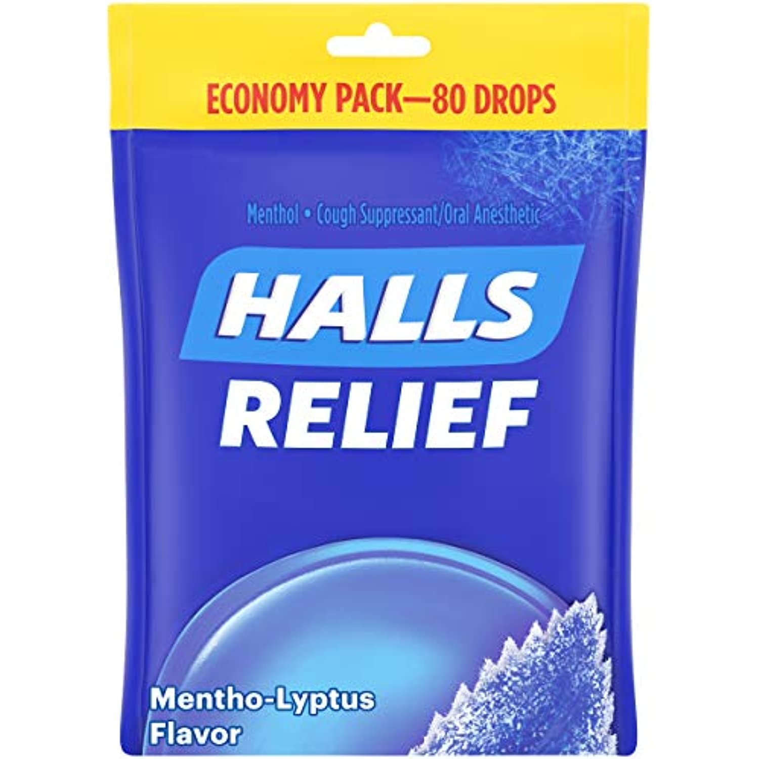HALLS Relief Mentho-Lyptus Cough Drops are ready for whatever life throws, or coughs, your way. With 5.4 mg of menthol per drop, these eucalyptus cough drops relieve coughs, soothe sore throats and cool nasal passages to quickly relieve your worst symptoms. Whether you're using these cough suppressant drops for sore throat relief, cough relief or as an oral anesthetic, dissolve one drop in your mouth slowly, and repeat every two hours as needed. HALLS Relief cough drops are formulated for adults and children five years and older. These sore throat drops are individually wrapped and come in a resealable bag for portability and freshness, making them perfect for a healthy gift or care package. Each economy package holds 80 drops each.