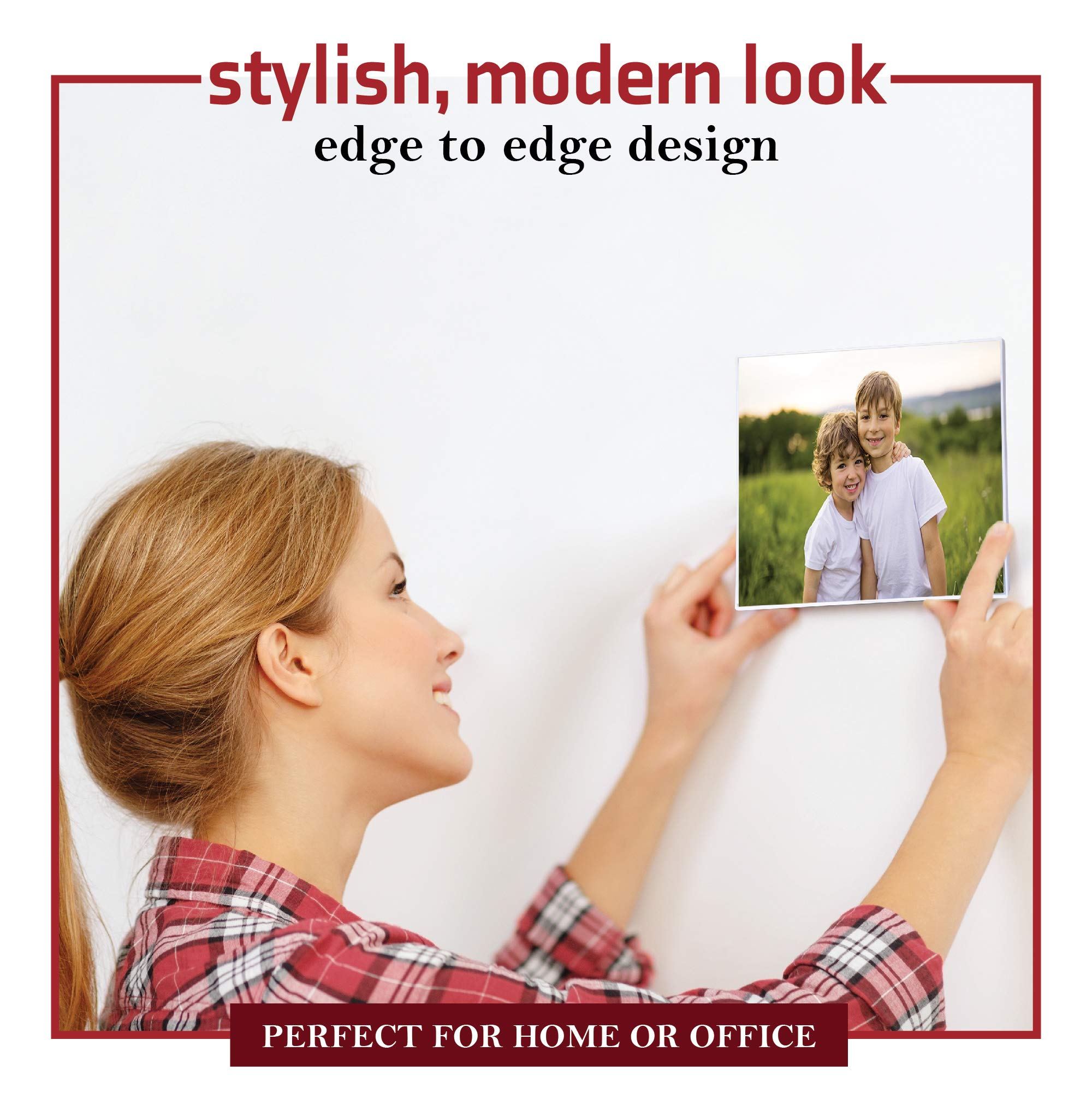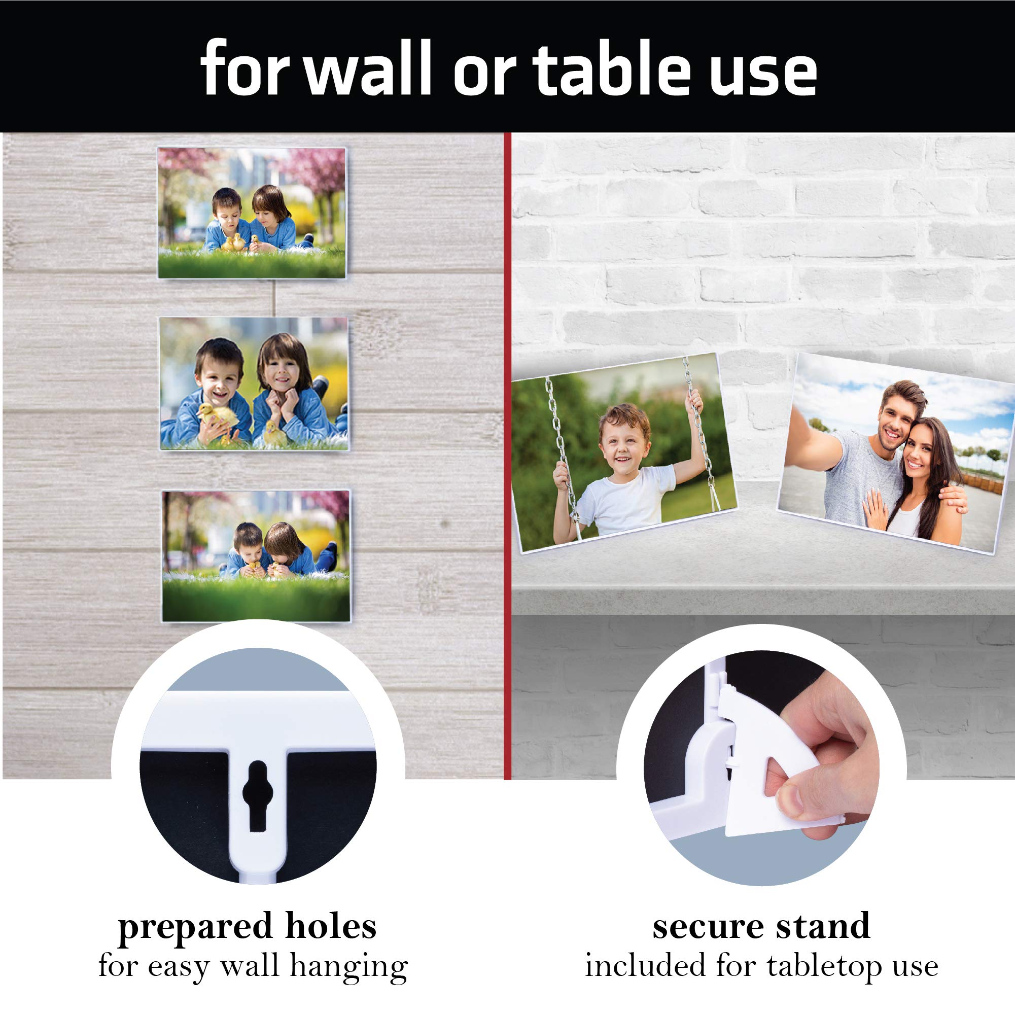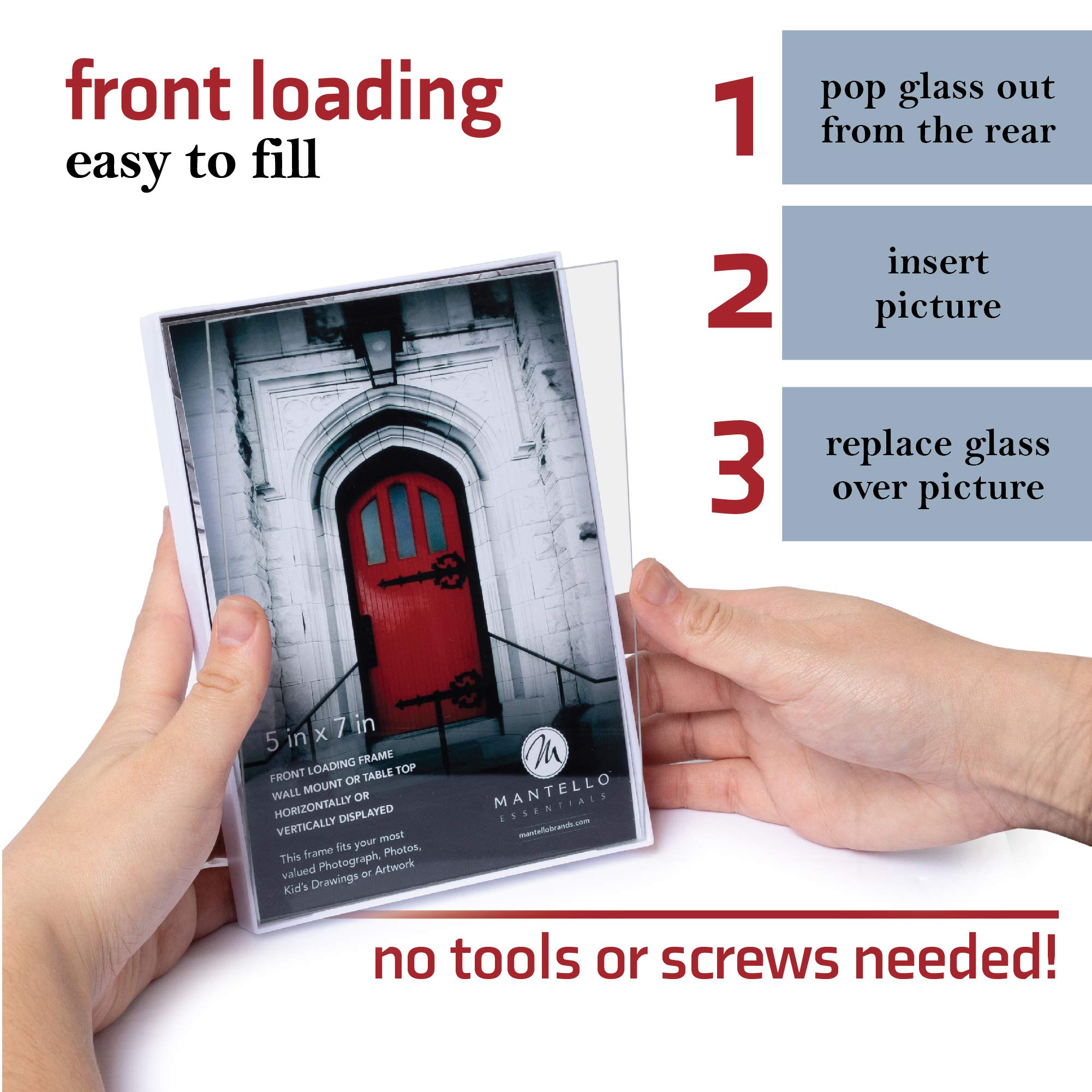 - Each 5x7 white frame has a front-loading glass design that lets you easily and quickly swap photographs. You can also use them to showcase your childrens drawings or artwork.