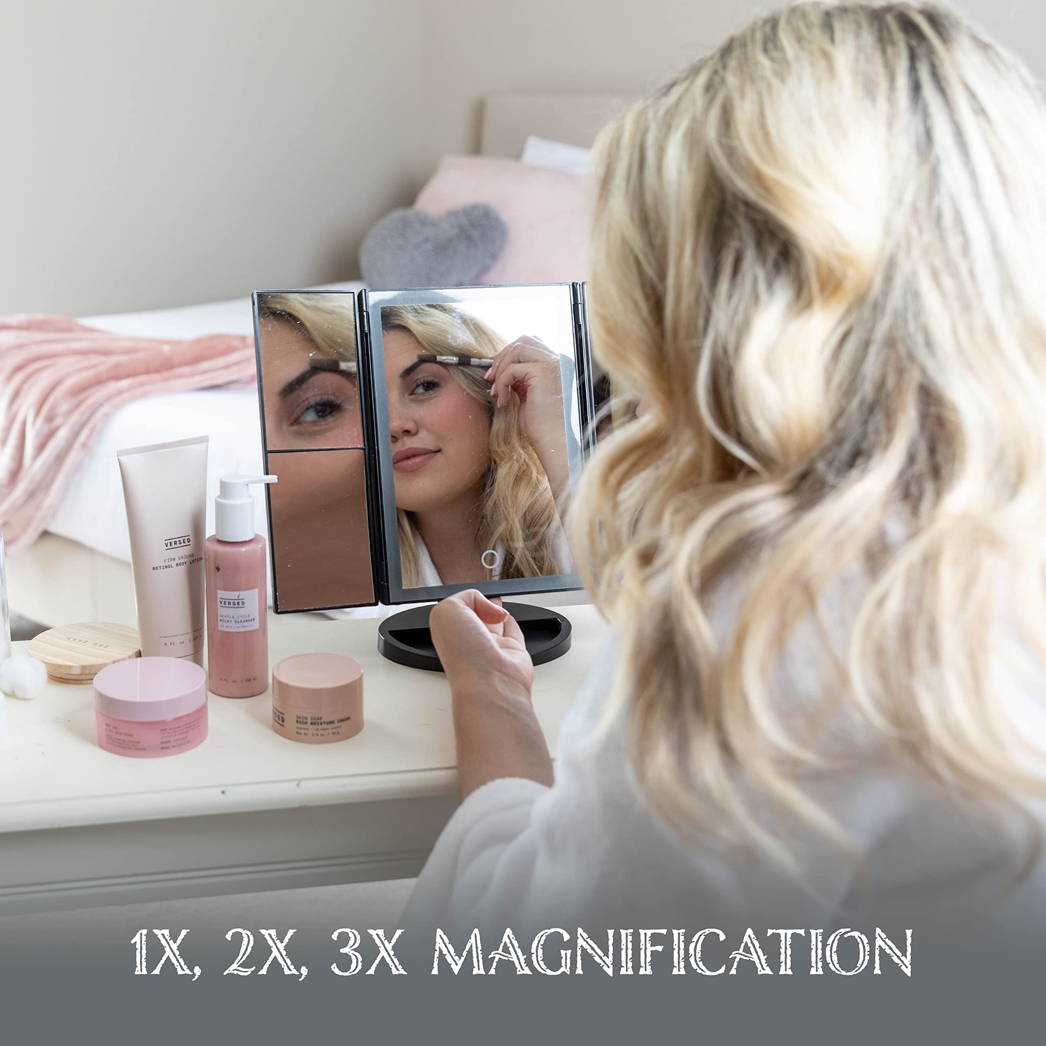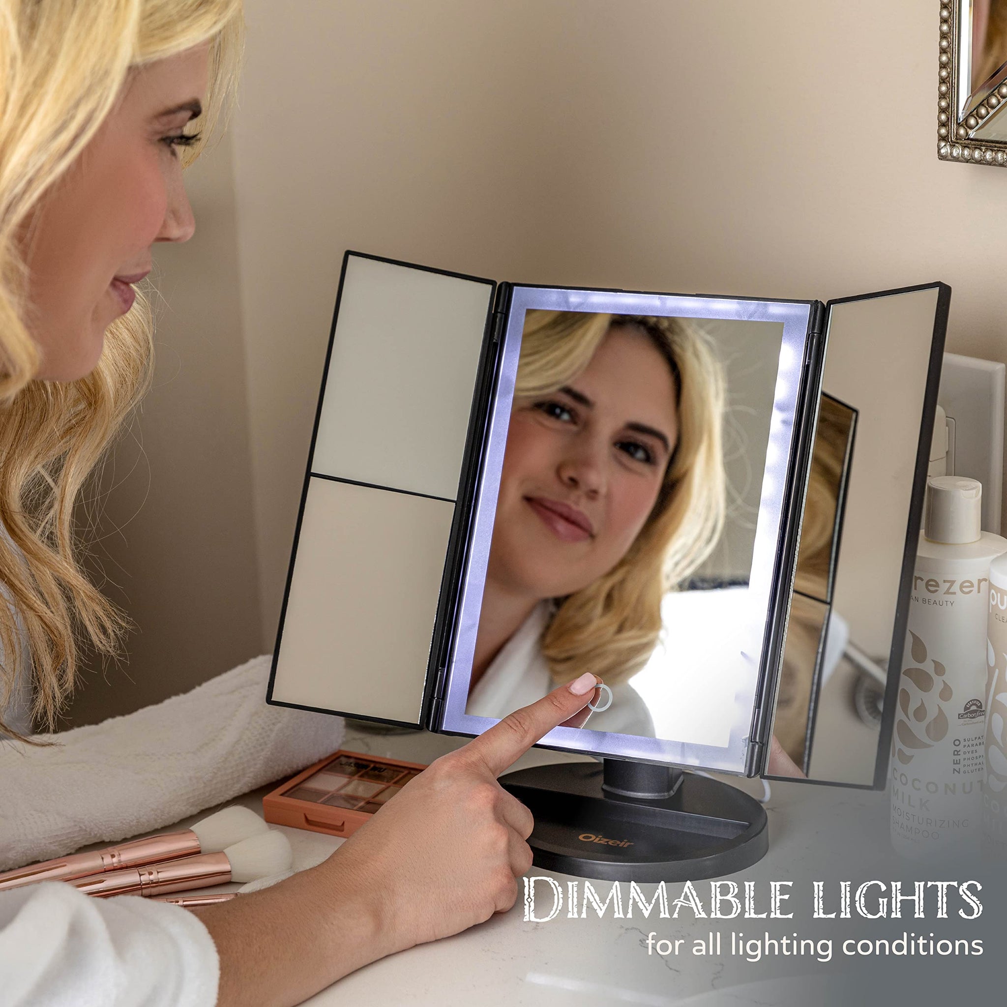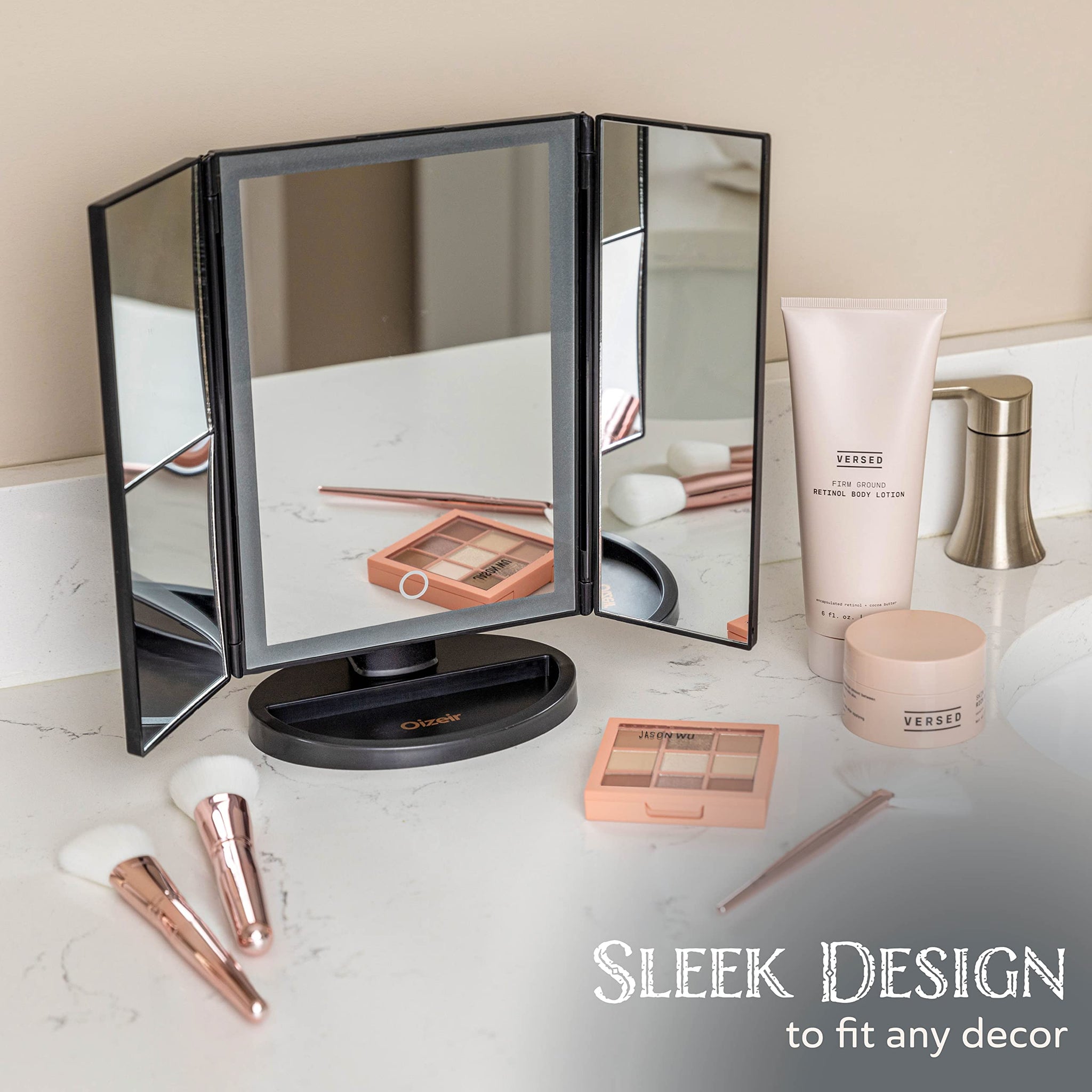 Oizeir Makeup Mirror with Lights – Natural Soft Light, Adjust Brightness, 3X Magnification, USB or Battery Power, Tri-Fold and Rotation Design for Comfortable Viewing Angle. (Black)