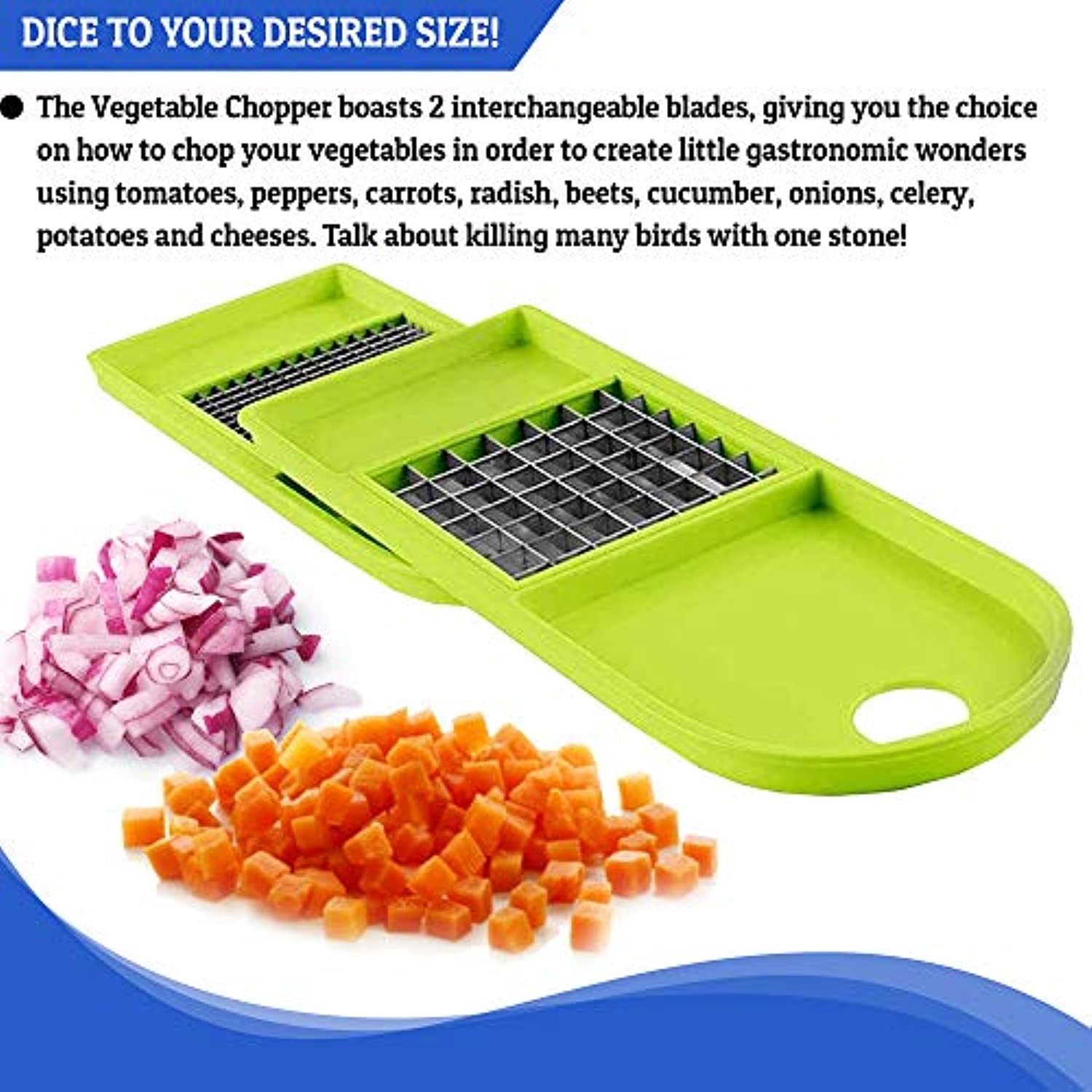 - DICE TO YOUR DESIRED SIZE! The Vegetable Chopper boasts 2 interchangeable blades, giving you the choice on how to chop your vegetables in order to create little gastronomic wonders using tomatoes, peppers, carrots, radish, beets, cucumber, onions, celery, potatoes and cheeses. Talk about killing many birds with one stone!