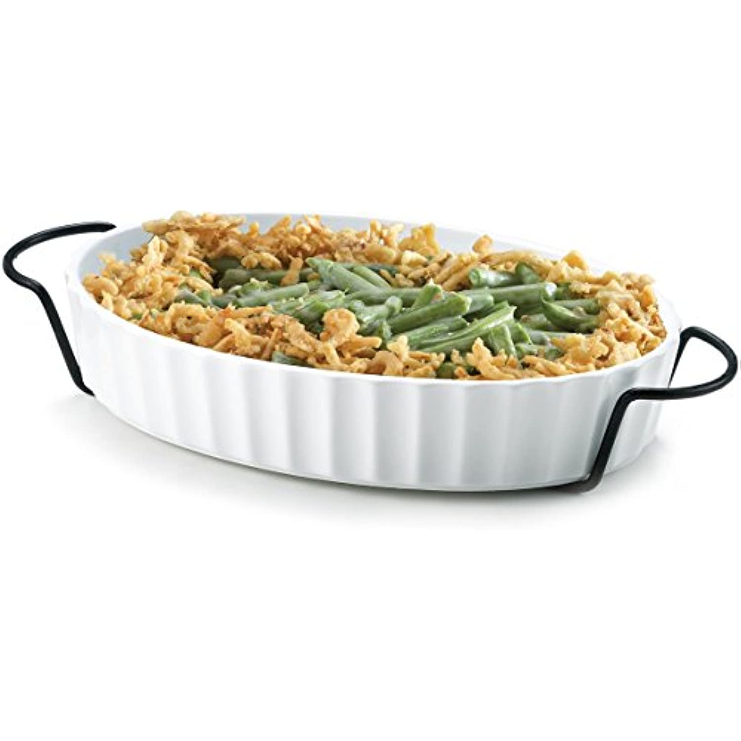 High quality assured with this product. Crafted of porcelain and iron, this 1-Quart Square baker, includes one (1) dish and one (1) rack and measures 11.4L x 8W x 2H in. Its iron rack protects your table and counters from heat damage and the handles allow for safe and easy transport