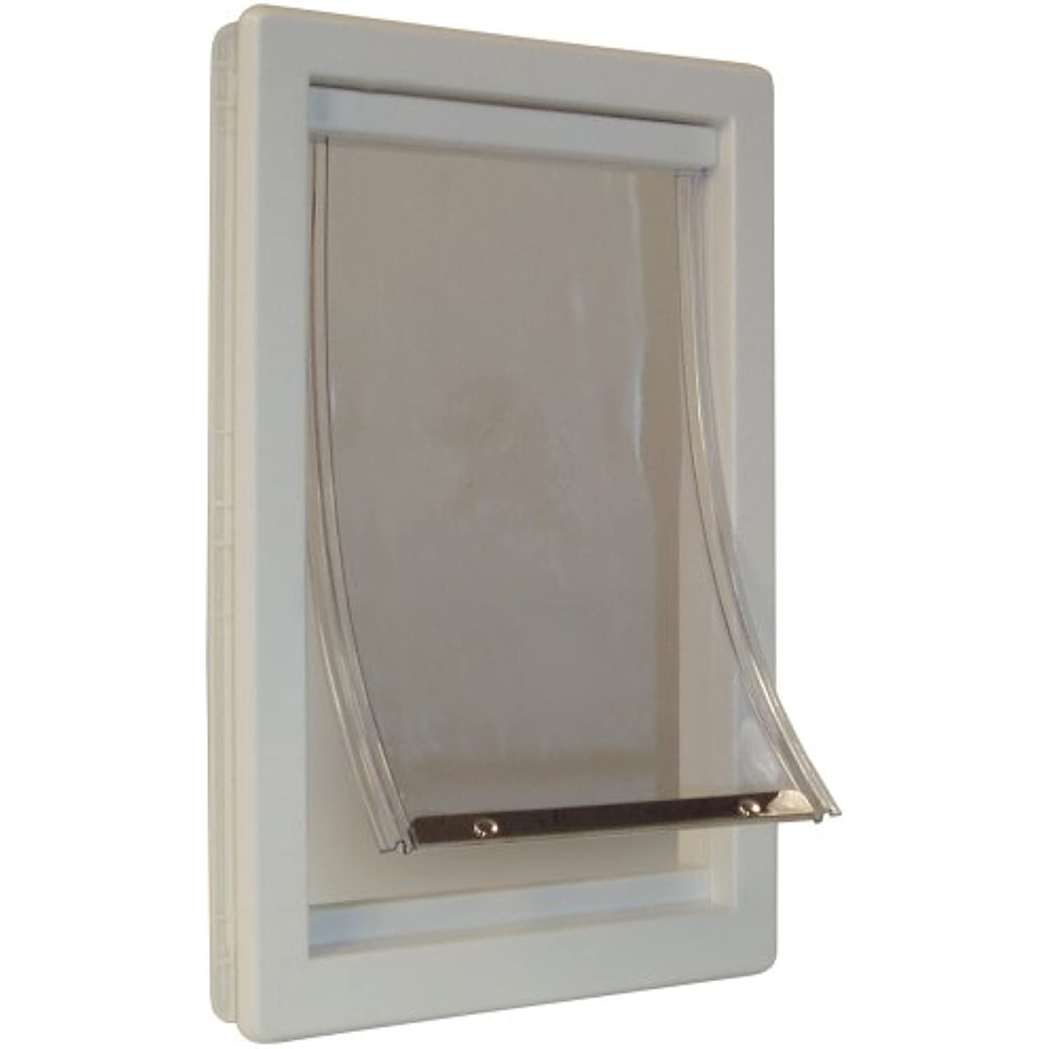 We developed a sturdy thermoplastic (abs) frame. A see through poly vinyl flap with patented edges to not to warp. A floating sill to insure good closure. And a strong molded abs lock-out slide to restrict the pet's movements when necessary. Then we made it 4 sizes for pets up to 120-pound. And with a tamper proof mounting system and easy installation, it's the most economical pet door in the industry
