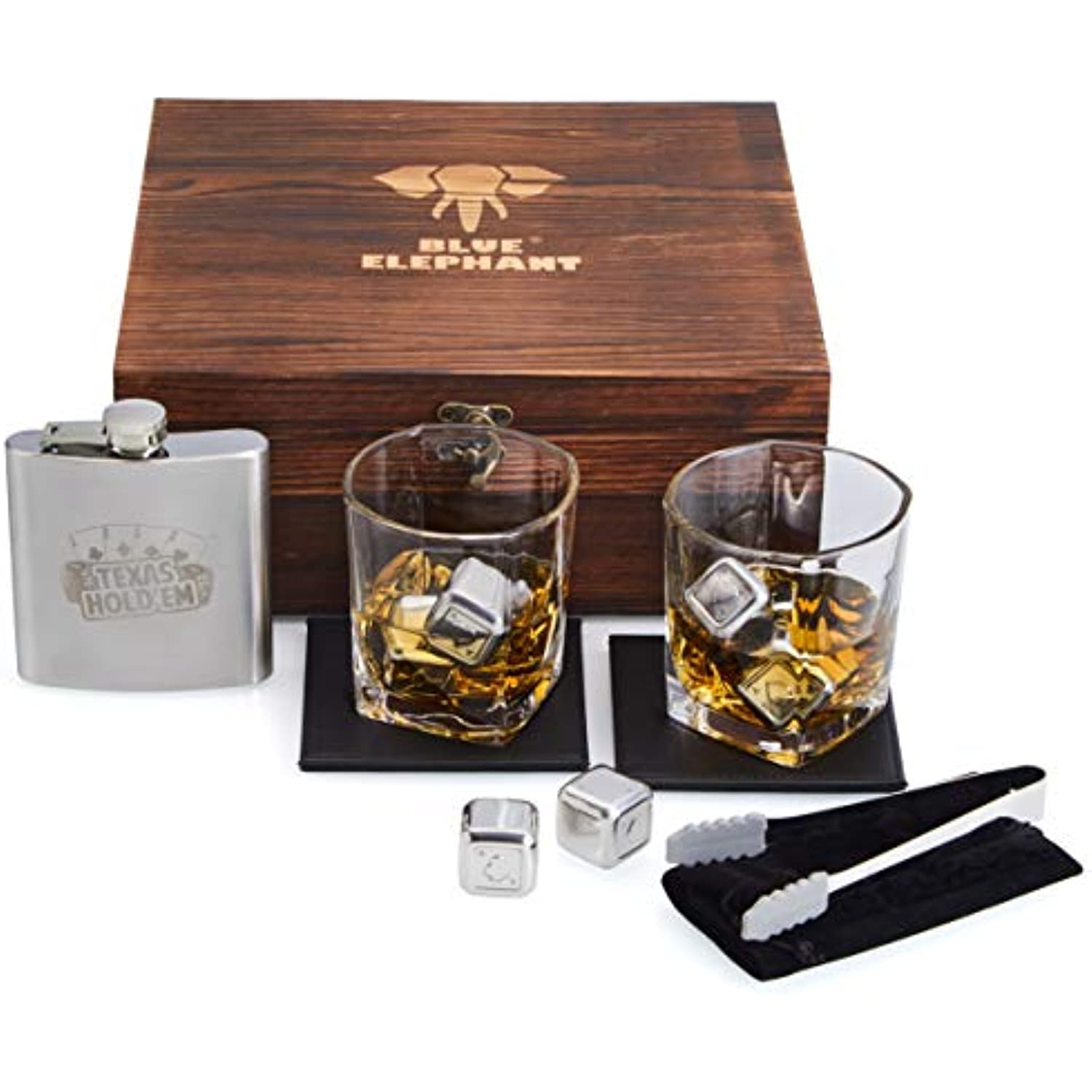 THE PERFECT GIFT FOR MEN OF EXQUISITE TASTEMake Him Smile Our whiskey stones gift set is exquisitely curated for the man with a love for the finer things; the guy with a notoriety for discerning taste. It’s a recipe for thoroughly impressed smiles with its 2 Old Fashioned whiskey glasses, 8 chilling stones crafted from food-grade 304 stainless steel, a velvet bag for the whiskey stones, 2 PU leather coasters, a pair of tongs, and a 6oz hip flask you won’t find in other gift sets. Go ahead, crown that occasion with the gift of sophisticated living.Designed to ImpressWhen it comes to gifting, first impressions are everything. That’s why we’ve poured a great deal of effort into presentation to ensure that first glimpse is filled with joyful wonder! Your recipient will love the elegant gift box and the striking layout. Whether it’s for your dad or husband, boyfriend or brother, co-worker or groomsmen, this whiskey gift set is just what you need to make that special occasion a memorable affair.Here’s what sets apart our set from the rest: ✔Includes a hip flask; something 90% of competitors don’t have.✔Our stainless-steel whiskey stones keep drinks chilled for longer.✔Comes with large Old Fashioned glasses, not tiny shot glasses.✔Crafted from high-quality materials for a premium feel and extra durability.✔Backed by a no-hassle, money-back guarantee to give you complete peace of mind.Make anyone’s day with this exquisitely-curated premium whiskey gift set!