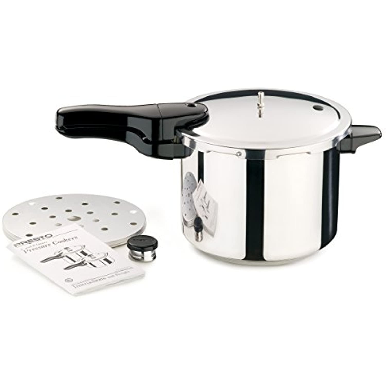 Amazon.com Pressure cookers have experienced renewed popularity over the last several years because cooks have rediscovered what some cooks (particularly grandmas) have known for a long time--they're really fast. And it's easy to cook healthfully with pressure cookers, since the food retains so much more of its nutrients and flavor. Presto's 6-quart stainless steel pressure cooker is a multi-purpose pot that can stand in as a conventional soup pot as well as perform the kitchen magic that pressure cookers are famous for. Chicken Cacciatore cooks in 8 minutes! This professional-quality stainless steel pressure cooker is a handy addition to any well-rounded set of kitchen tools. The heavy-duty lid locks down during cooking; an inner sealing ring keeps the steam in. In addition to a pop-up pressure indicator and a simple steam release mechanism, there is an overpressure plug that will let off steam if it builds up excessively. This pressure cooker is useful for weeknight dinners or for any meal that needs to come together quickly. An accompanying booklet contains more than 65 recipes, ranging from basic soup stocks to stews and pot roasts--even desserts like 5-minute custards! Tenderize lean cuts of beef or pork; or cook chicken, fish, or vegetables faster than you can in a microwave, and without losing moisture. Nonabrasive cleansers are best for cleaning this stainless steel pressure cooker, though occasional use of a fine metal polish will help the exterior keep its shine. The Presto 6-quart pressure cooker is fully immersible; in addition, the sealing ring should be removed after each use to allow cleaning of the inside rim of the lid. The vent pipe is simple to keep clean with a small brush or pipe cleaner, and both the air vent/cover lock and the overpressure plug are removable. The pressure cooker measures 9 inches in diameter (17 inches including handles) and 8-1/2 inches tall (including lid). Presto guarantees this pressure cooker with an extended 12-year warranty. A detailed instruction and recipe booklet is included; special safety issues that pertain to pressure cookers are clearly explained. --Garland Withers Product Description The smart choice for healthy, favorful meals, fast and easy. Cooks 3 to 10 times faster than ordinary cooking methods - even faster than a microwave for many foods. Chicken, fish, meat and vegetables cook to perfection fast. Helps tenderize economical cuts of meat. Works on regular and smooth-top ranges. Cover lock indicator shows when there is pressure inside the cooker and prevents the cover from being removed until pressure is safely reduced. Includes a special rack for cooking several foods at once with no intermingling of flavors. Dishwasher safe for easy cleaning. Liquid capacity: 6 quarts (5.7 liters). Works on gas