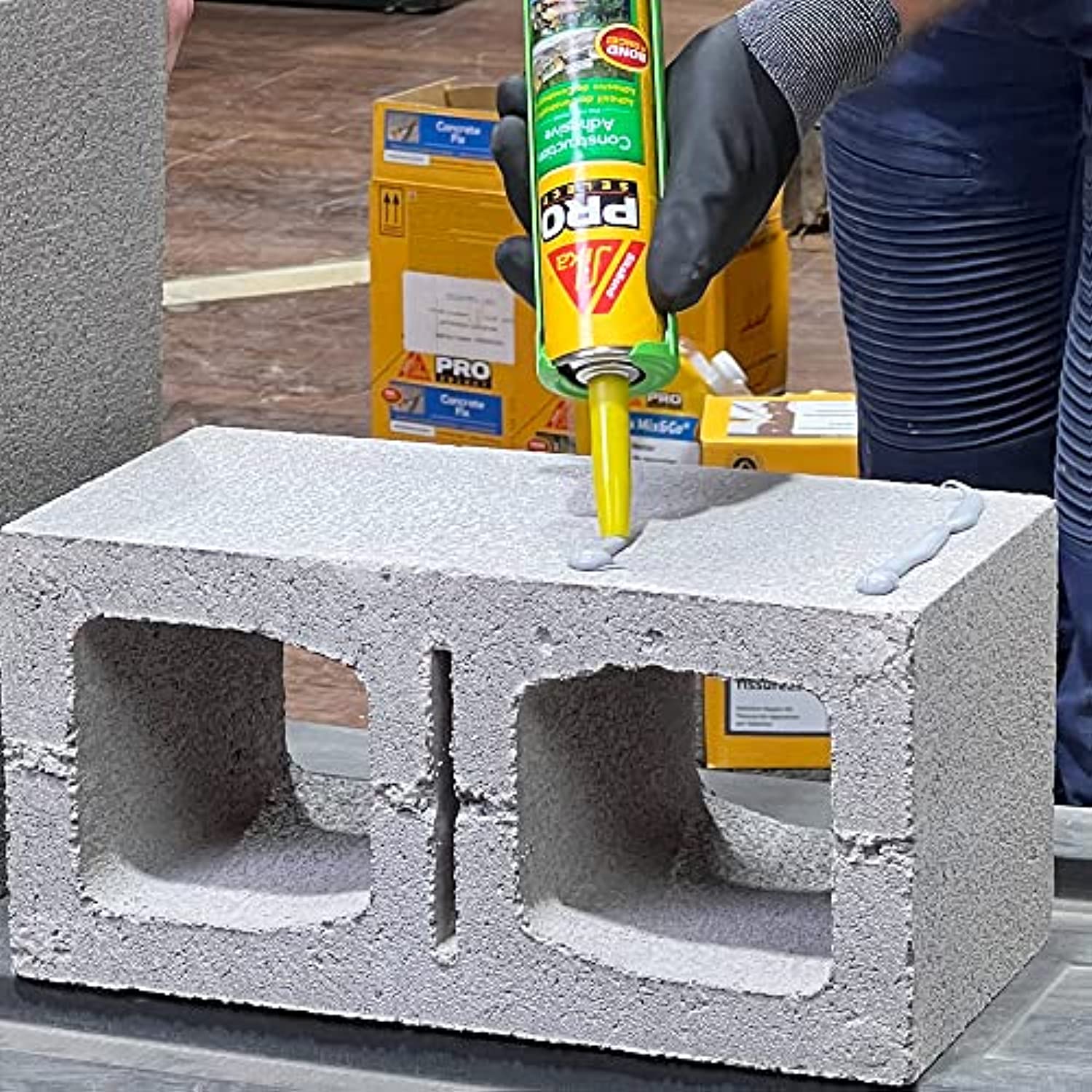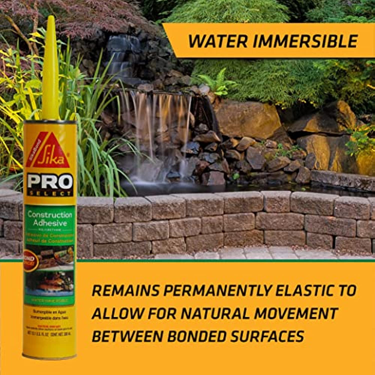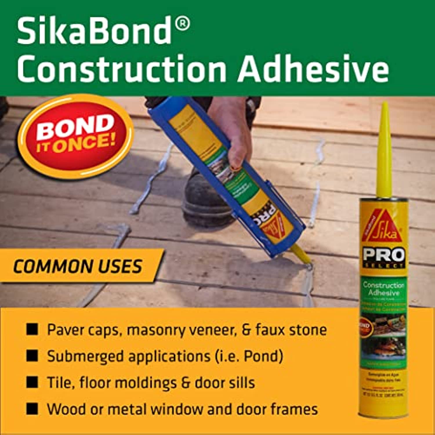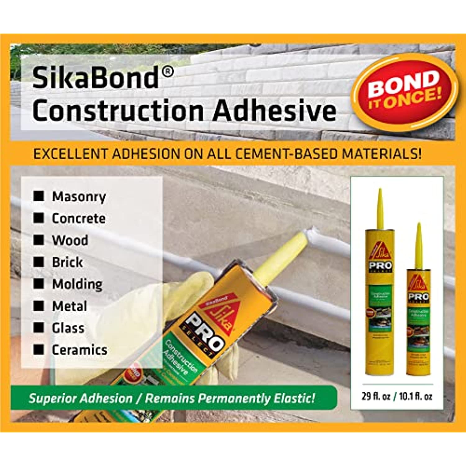 SikaBond Construction Adhesive, a one component polyurethane adhesive that remains permanently elastic to allow for natural movement between bonded surfaces. SikaBond Construction Adhesive is a durable and flexible exterior polyurethane adhesive. It has excellent adhesion on all cement-based materials, brick, ceramics, glass, metals, and wood.