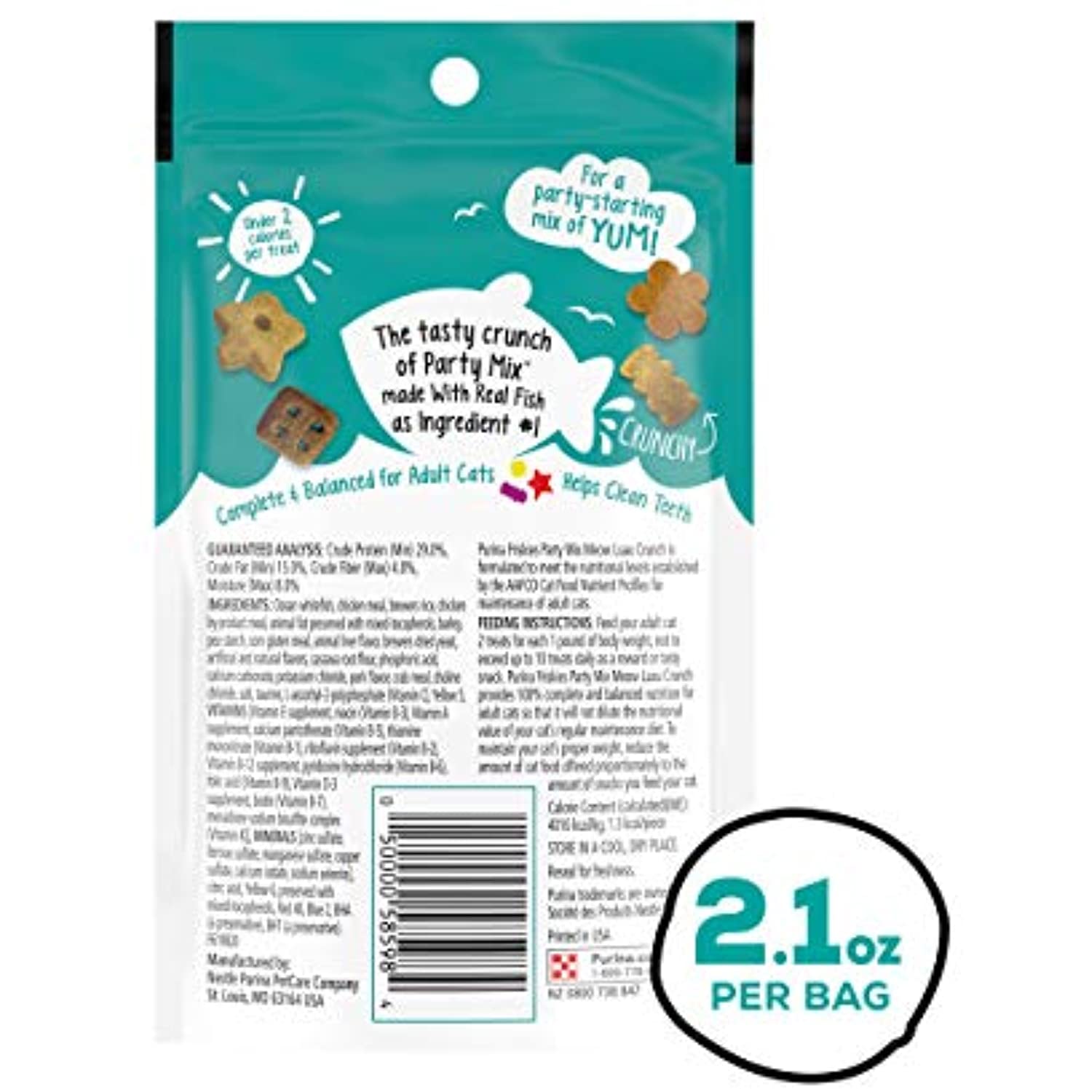 Show your cat some extra love and attention when you serve Purina Friskies Party Mix Meow Luau Crunch adult cat treats. With real ocean whitefish as the #1 ingredient, these cat treats provide the delicious seafood flavor that keeps her interested at treat time. Pork and crab flavors round out this mouthwatering recipe, giving her that satisfying yum she craves. You can feel good about serving these treats, as the crunchy texture helps keep her teeth clean. Each treat contains less than 2 calories, offering a guilt-free way to indulge your kitty. These treats for adult cats come in playful shapes that capture your cat's attention, so snack time is fun and exciting. Reach for a package of Purina Friskies Party Mix Meow Luau Crunch adult cat treats at snack time to celebrate your special bond and treat her taste buds to a medley of purr-licious flavors. Your cat doesn't like waiting around for treats. Place an order through Amazon.com to get these tasty snacks delivered to your home.Guaranteed Analysis:Crude Protein (Min) 29.0%, Crude Fat (Min) 15.0%, Crude Fiber (Max) 4.0%, Moisture (Max) 8.0%