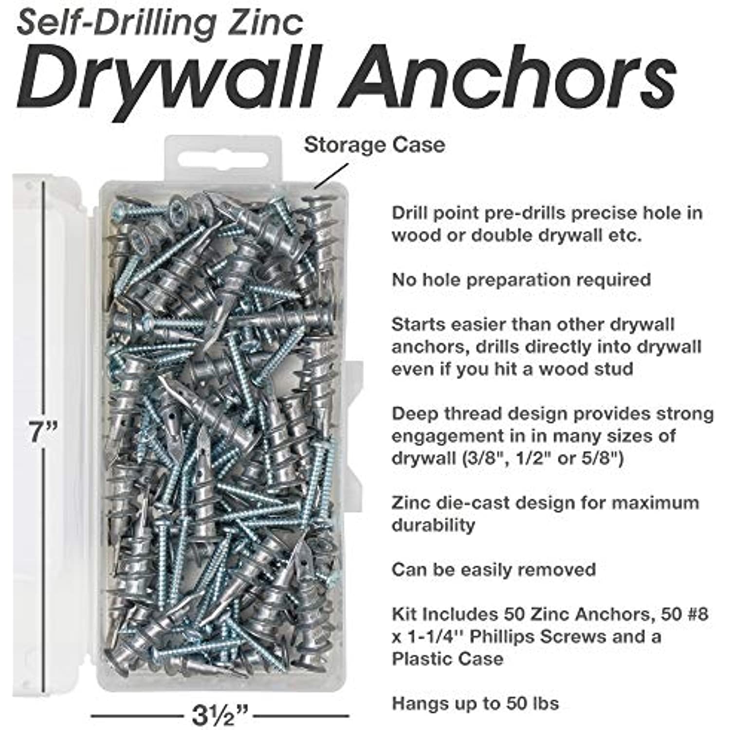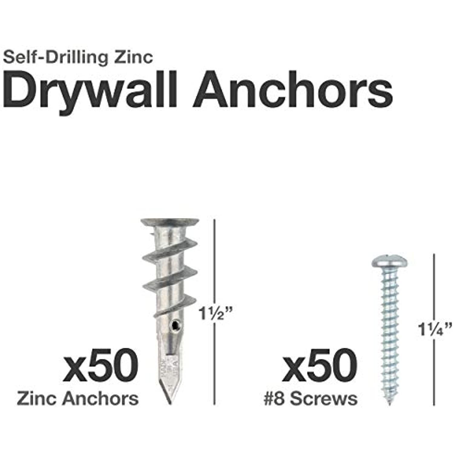 - Kit Includes 50 Zinc Anchors, 50 #8 x 1-1/4'' Phillips Screws and a Plastic Case, Hangs up to 50 lbs. Packaging design may vary.