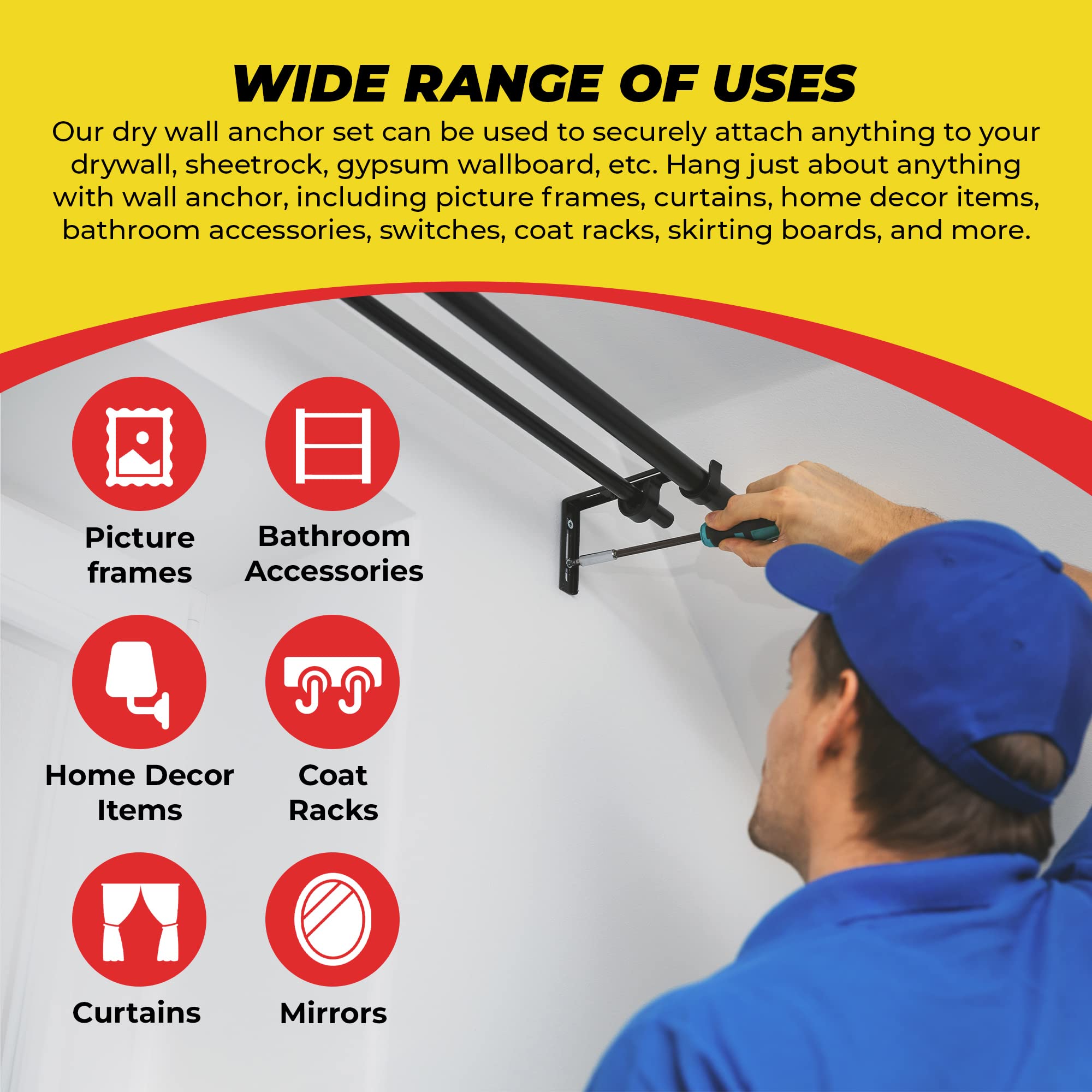 Easy Installations- Installing items to walls, such as shelves, a coat rack, a mirror, framed pictures, etc., is now an easy DIY project thanks to our drywall anchor set. Because of its self-drilling design, a pilot hole is not required. Take the heavy-duty drywall anchors and use a screwdriver to carefully screw and tighten the anchor grip into the wall. Then insert the wall screw into the anchor's central hole. Now, get that picture frame, or whatever else you want to hang safely, and voila!