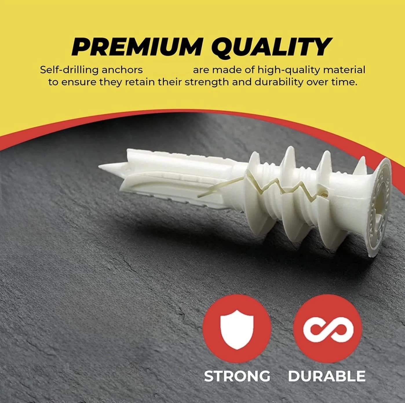Qualihome Self Drilling Drywall Anchors - Plastic Anchors for Drywall, Gypsum Wallboard, Sheetrock - Screw Anchors for Multiple Wall Hanging Items - No Pre Drilling Required - 75 Lbs. (200 Pack)