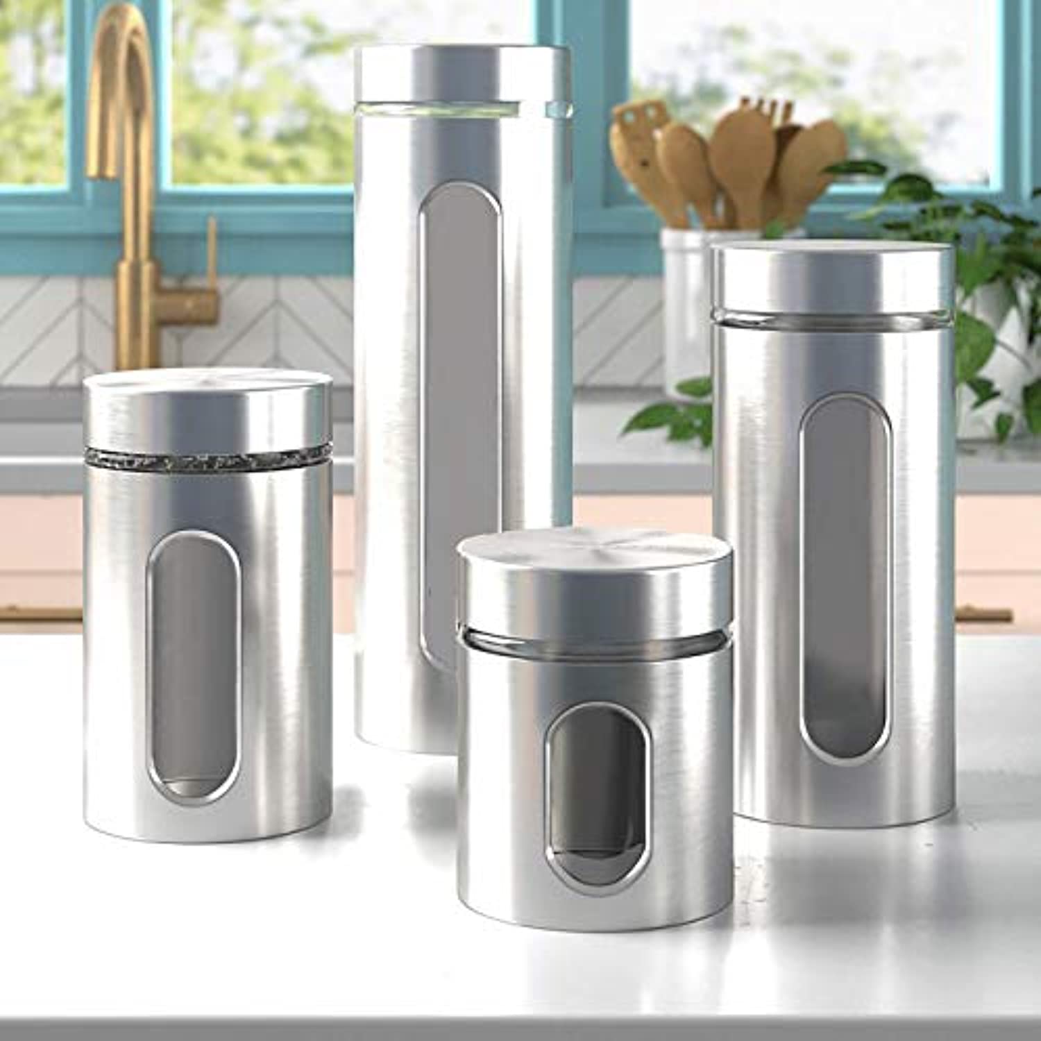 Quality 4pc Stainless Steel Canister Set for Kitchen Counter with Glass Window & Airtight Lids, Food Storage Containers, Pantry Storage & Organization Set for Coffee, Flour, Pasta, Rice, Spices, Herbs