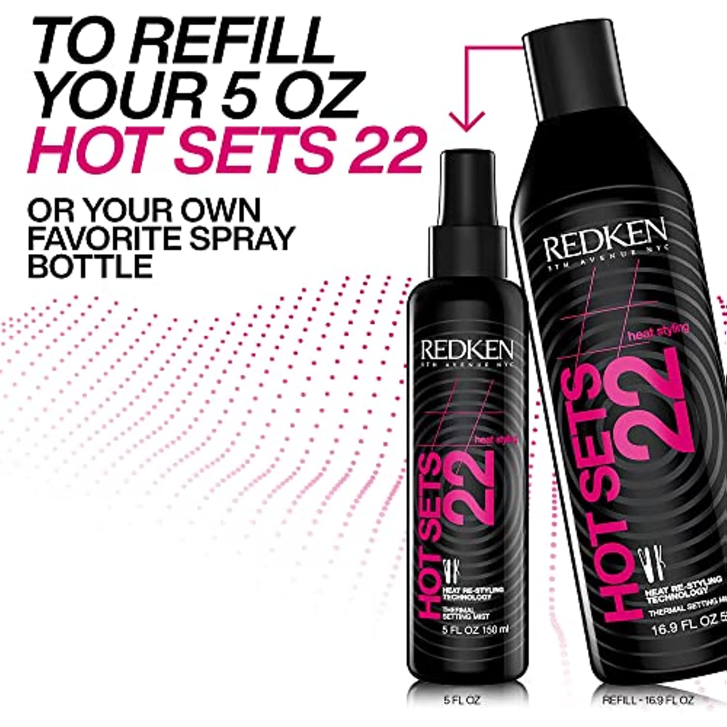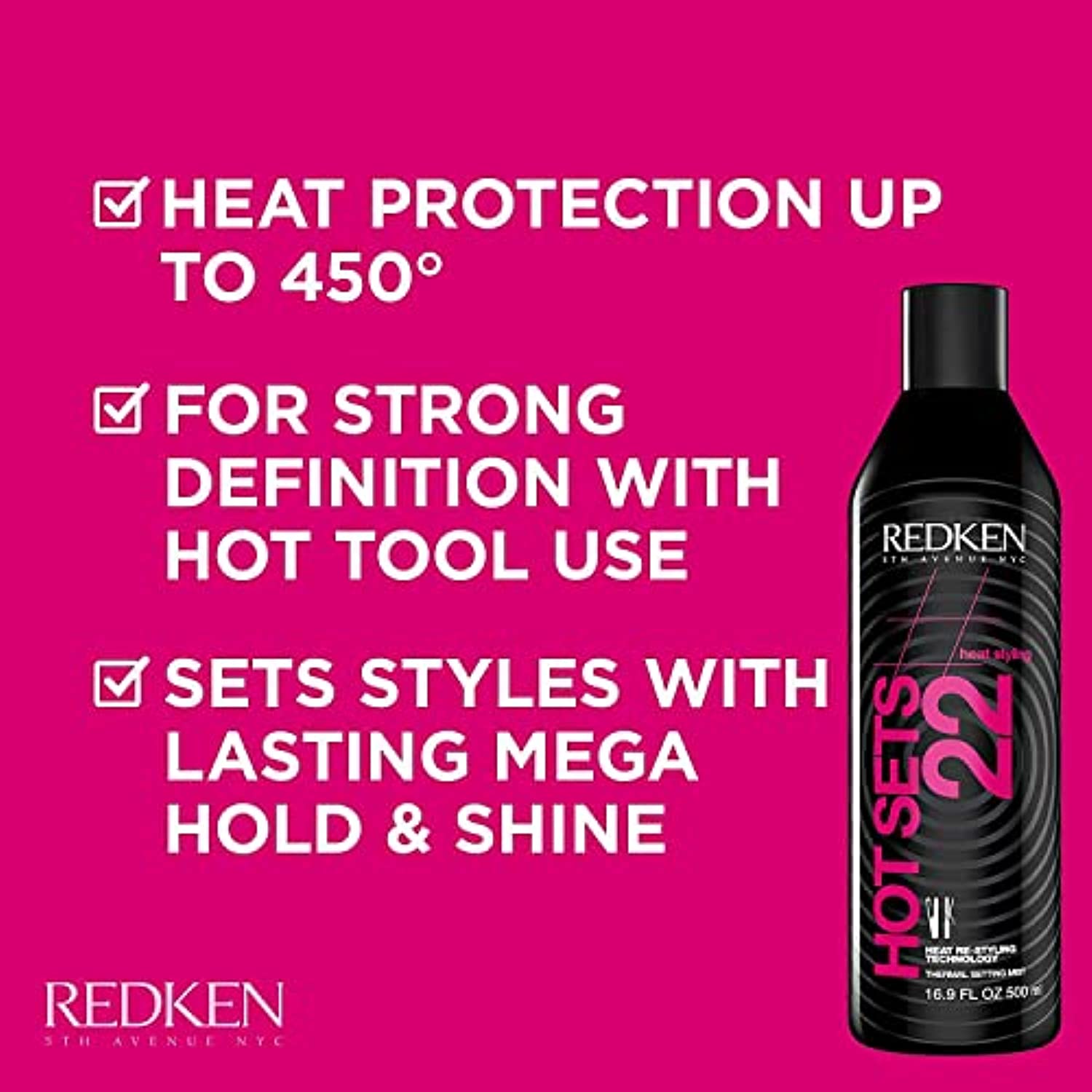 Product Description Hot Sets 22 is a thermal setting mist that acts as a heat protectant for up to 450 degrees. This professional mist adds shine, lasting hold, and offers anti-frizz protection. Use this product to refill your favorite spray bottle. Brand Story Redken is the #1 professional brand in North America. Powered by science, prescribed by professionals, Redken creates products with the highest quality ingredients, delivering powerful hair transformations for all hair types.FEATURES