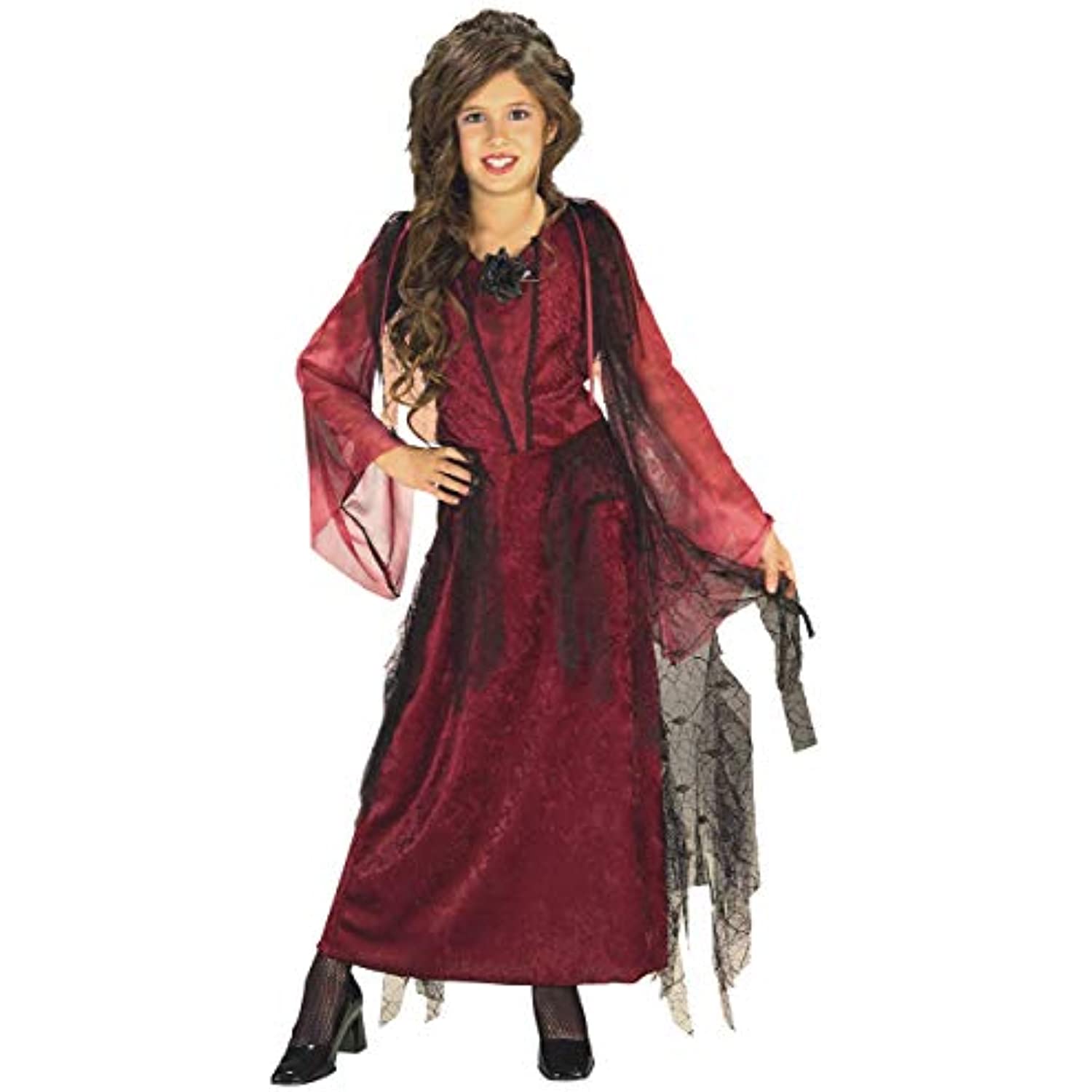 Now your child can become the Gothic vampiress they've been wanting to be in this costume dress. Red velvet, full length dress with long sheer sleeves, attached black Webbed netting on shoulders and at waist. Great look for vampires, or witches too! Important: Costumes are sized differently than apparel, use the Rubies child size Chart in images, read recent reviews and Q & a to determine best fit, do not choose based on child's age or clothing size. Coordinate together with other vampire or classic spooky Halloween costumes by Rubie's; look for vampires, witches, ghosts, zombies and more available in styles and sizes for baby/toddler, children, adult, and pets too For everyone to join in on the dress up fun! Family-owned, family-focused and based in new York since 1951. As the world's largest designer and manufacturer of costumes Rubie's brings fun and fantasy to dress-up. Offering everything from full mascot suits to masks and wigs, from deluxe licensed costumes to simple starter pieces, from costume shoes to character make-up, and so much more. Rubie's promotes safety in dress-up, so you can relax and have a great time while looking The part. Look to Rubie's for every costume occasion and season: Halloween, Christmas, Mardi Gras, Easter, and all occasions in-between.