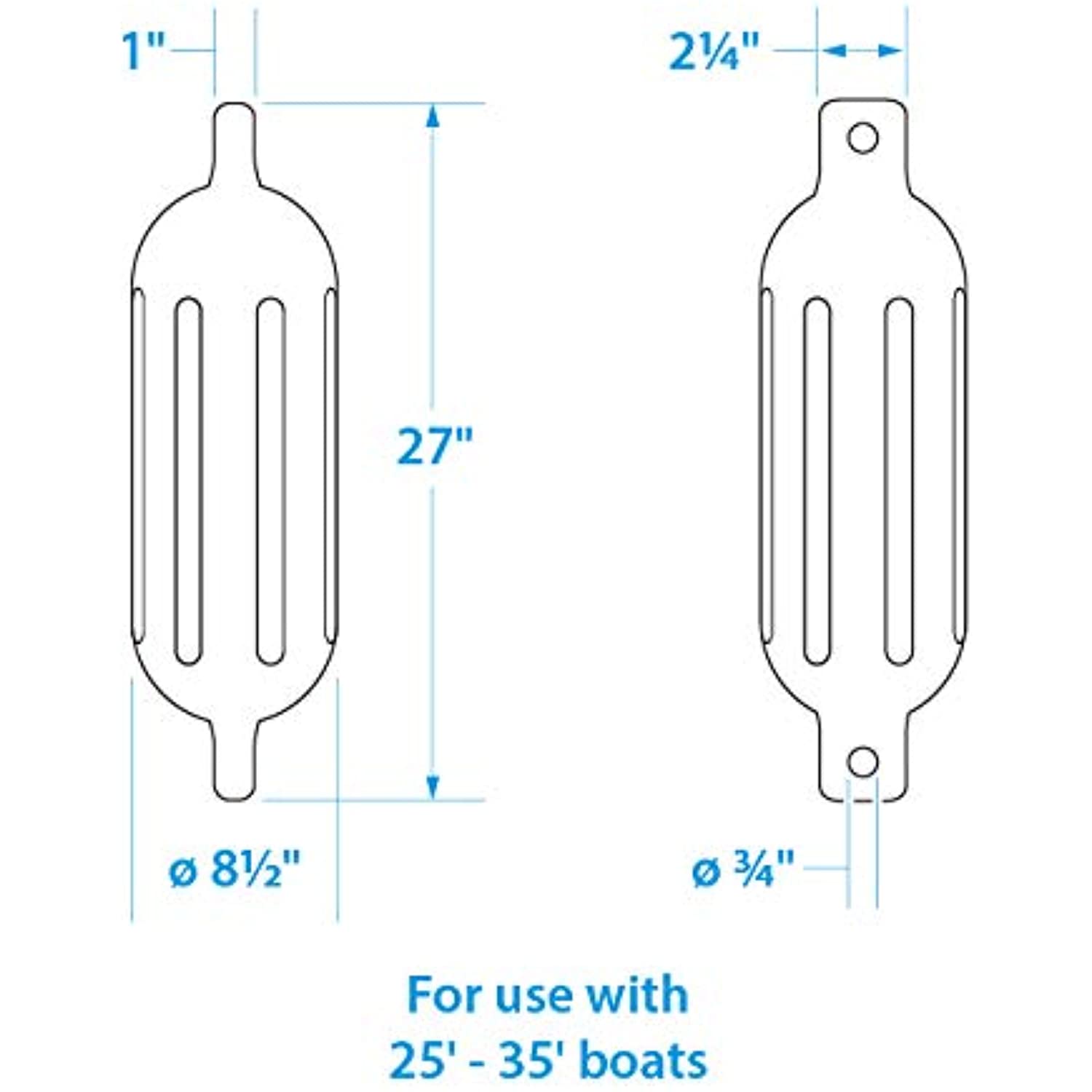 Acting as a cushion and preventing damage to your boat’s hull and topside, this rotomolded UV-resistant vinyl fender with sturdy ribs provides lasting durability. Inflation valve allows for adjustment to desired level of firmness, while twin eye design enables fender to hang vertically or horizontally for attachment to a deck cleat, dock or piling. Sold individually. Seachoice is committed to delivering quality marine accessories and OEM replacement parts to satisfy fishing, boating and watersports enthusiasts worldwide. Seachoice is run for and by boaters offering a wide-ranging product line while remaining affordable.