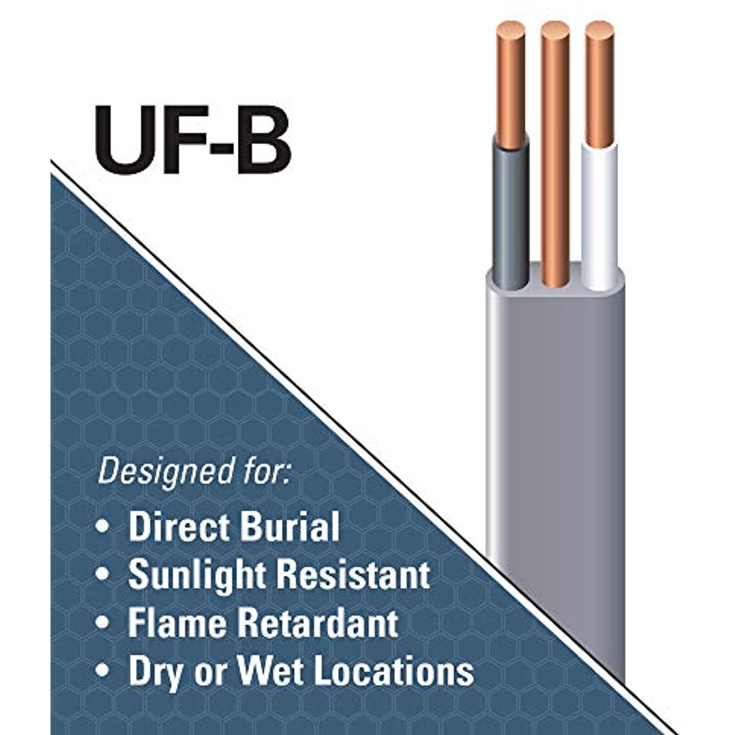 Cable designed specifically for use as underground feeder cable for direct earth burial in branch circuits, and indoors for wet or corrosive locations. Highly to acids, alkalis, corrosive fumes, chemicals, lubricants, and ground water. It is noncorroding, sunlight-, and will not support combustion. UL (Underwriter's Laboratories) listed. Length: 50 Ft. Size: 14 AWG Number Of Conductors: 2 Conductors Conductor Material: Copper Type: UF-B Voltage: 600V Temperature Rating: 75 Deg C Certification: UL Listed 0 -