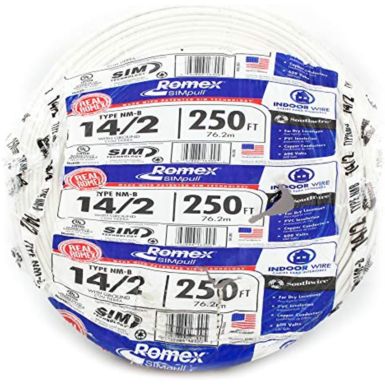 "SOUTHWIRE COMPANY" 14/2 NON METALLIC CABLE WITH GROUND 250' 14/2 Non Metallic Sheathed Cable With Ground Copper Romex Loom 90 Degree C Clear Pak.
