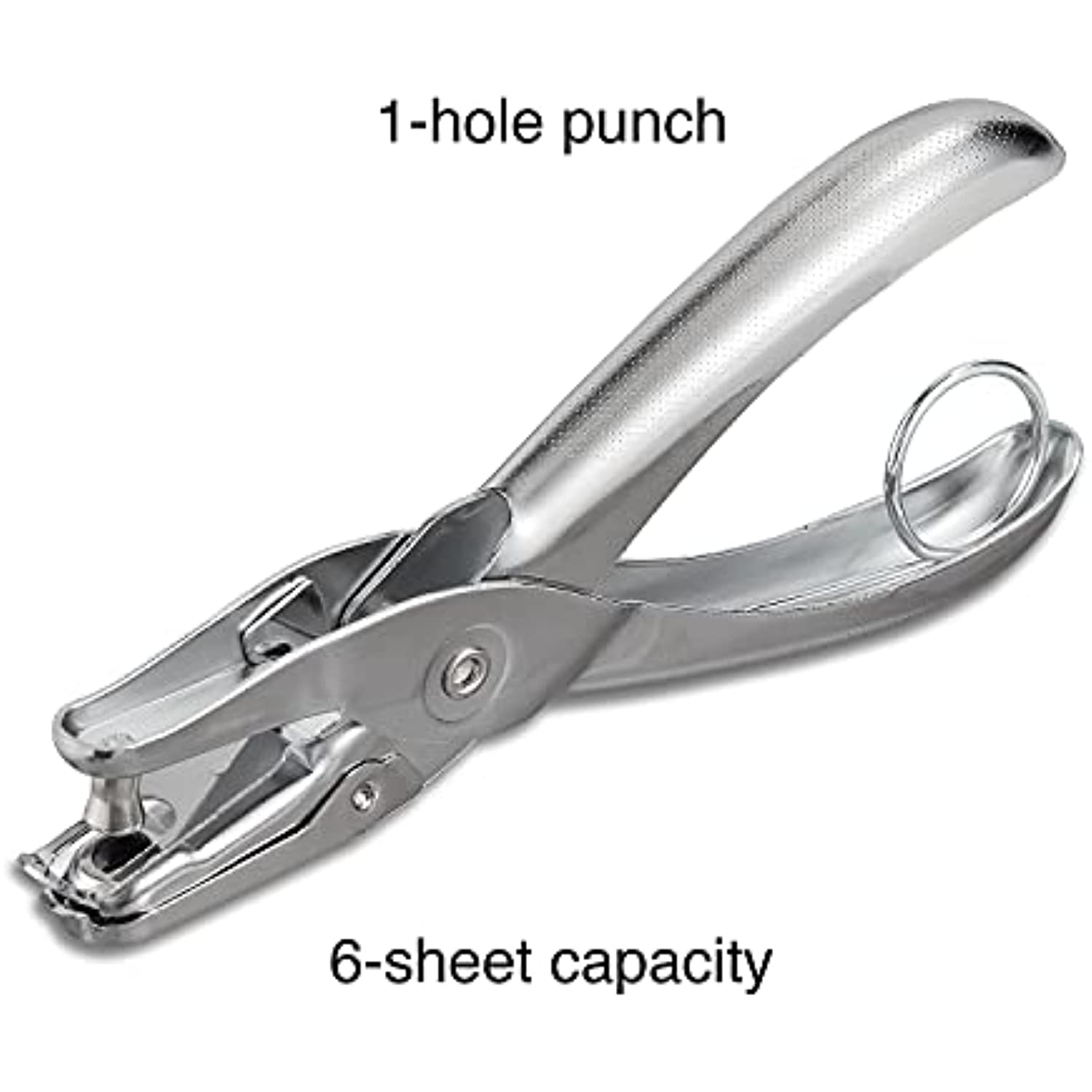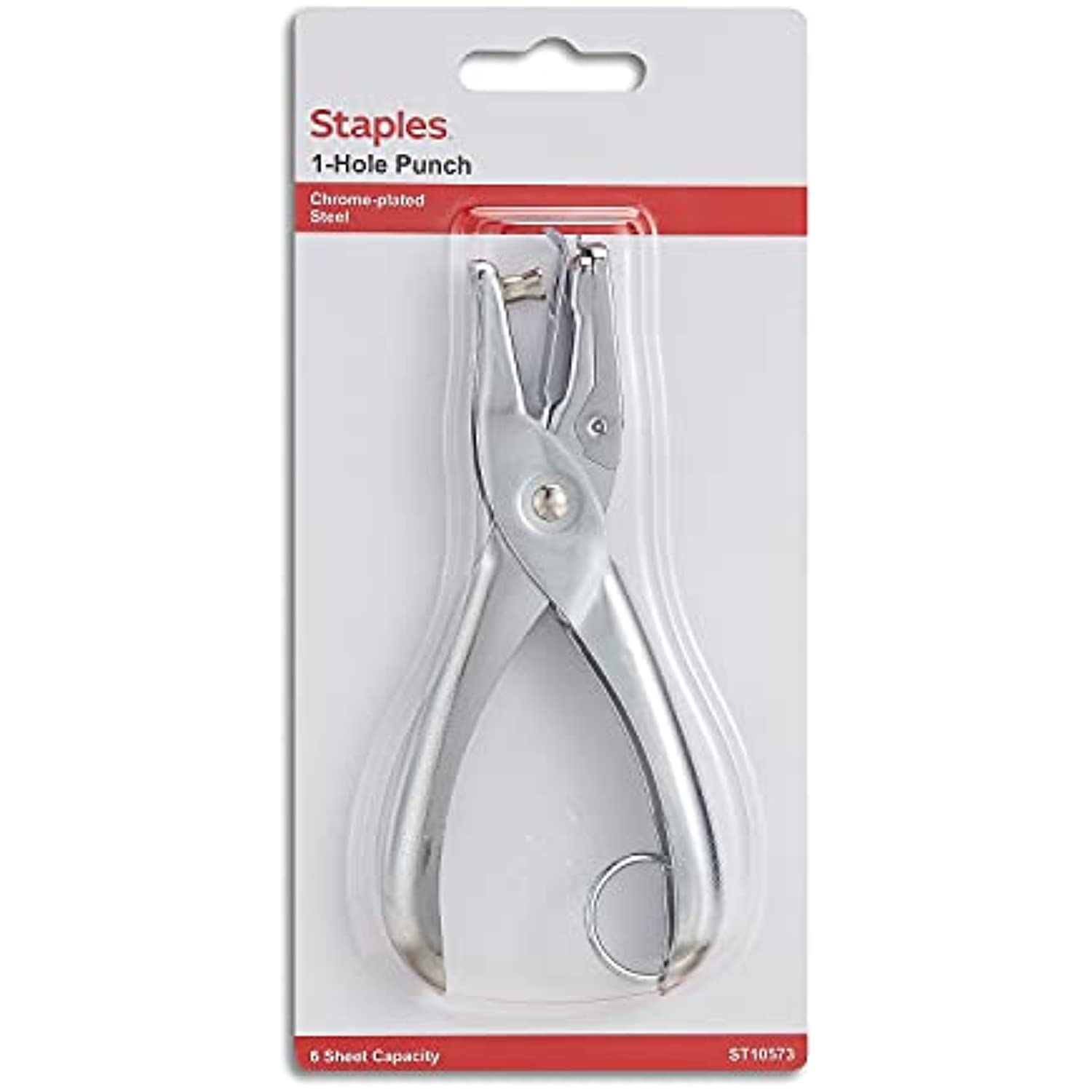 Staples single-hole punch is made of chrome-plated steel and has a metal receptacle to collect the punched paper dots. Punch will create holes 1/4" in diameter and punches up to 5 sheets of standard 20-lb. paper at a time.