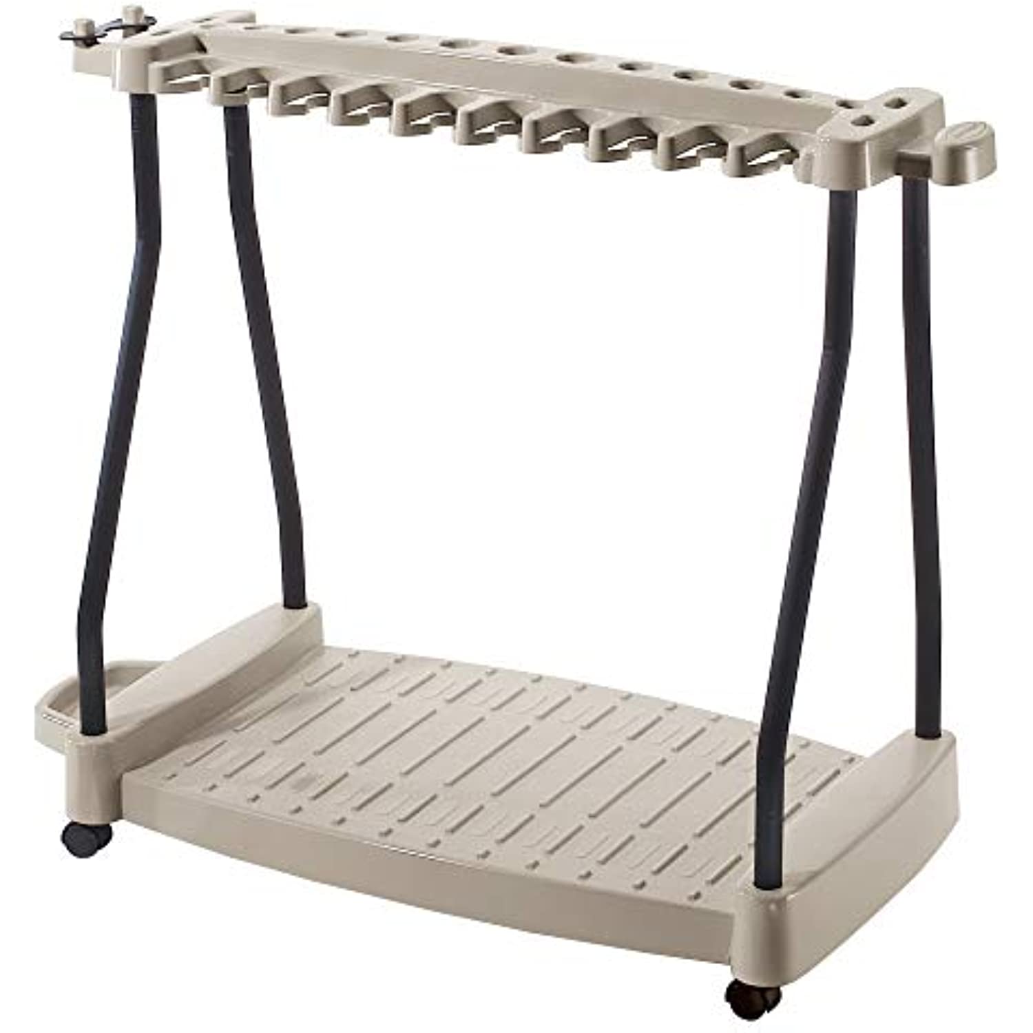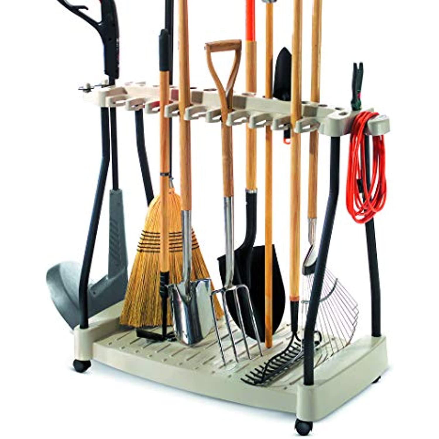 Amazon.com Suncast's rolling yard tool cart will hold up to 20 large and 17 small tools, and it's designed for stability and mobility. A sturdy steel core and heads-down tool storage give it a low center of gravity, and the cart comes mounted on four casters. Storage slots are mounted back to back so you don't have to move one tool out of the way to get to another. This cart lets you take the storage to the tools so you don't have to make multiple trips in order to get your yard clean.--Josh DettweilerWhat's in the BoxStorage cart with casters Product Description Portable long handled tool Rack with wheels, 4 high quality casters, holds approximately 30 tools, side access tool slots with clip, steel core structure, patents pending. This product is highly durable. This product is made in china. Amazon.com Suncast's rolling yard tool cart will hold up to 20 large and 17 small tools, and it's designed for stability and mobility. A sturdy steel core and heads-down tool storage give it a low center of gravity, and the cart comes mounted on four casters. Storage slots are mounted back to back so you don't have to move one tool out of the way to get to another. This cart lets you take the storage to the tools so you don't have to make multiple trips in order to get your yard clean.--Josh DettweilerWhat's in the BoxStorage cart with casters Amazon.com Suncast's rolling yard tool cart will hold up to 20 large and 17 small tools, and it's designed for stability and mobility. A sturdy steel core and heads-down tool storage give it a low center of gravity, and the cart comes mounted on four casters. Storage slots are mounted back to back so you don't have to move one tool out of the way to get to another. This cart lets you take the storage to the tools so you don't have to make multiple trips in order to get your yard clean.--Josh DettweilerWhat's in the BoxStorage cart with casters