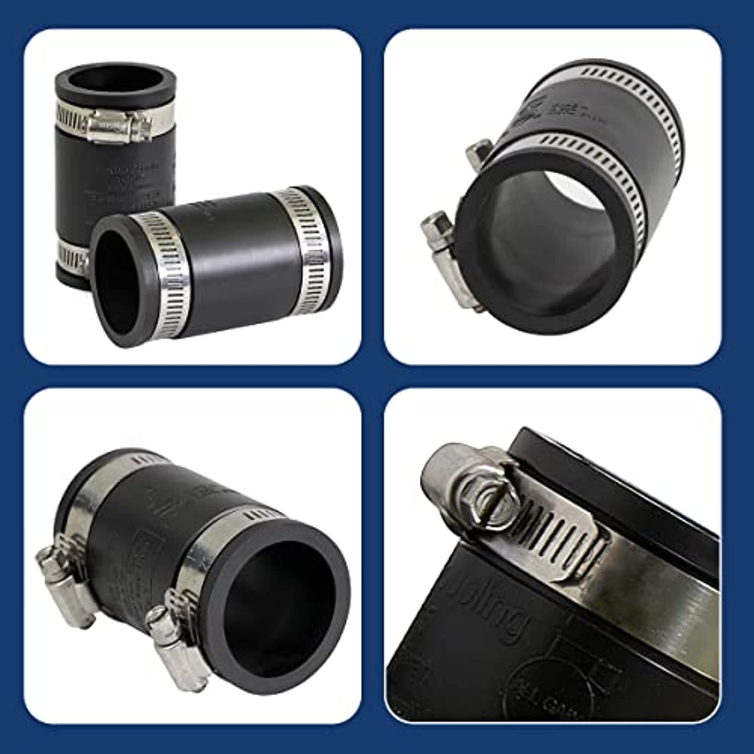 - Flexible Coupling Compatible with cast iron, plastic, copper, lead, and steel piping