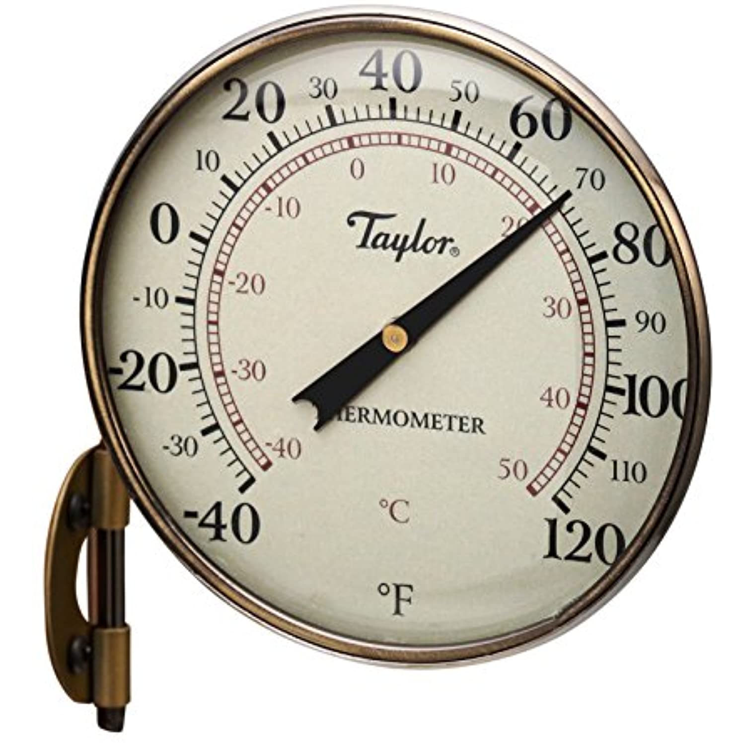 - Part of the Taylor Heritage line of classically styled weather instruments, this thermometer is made of anodized aluminum and glass with a bronze finish and a decorative copper pointer.