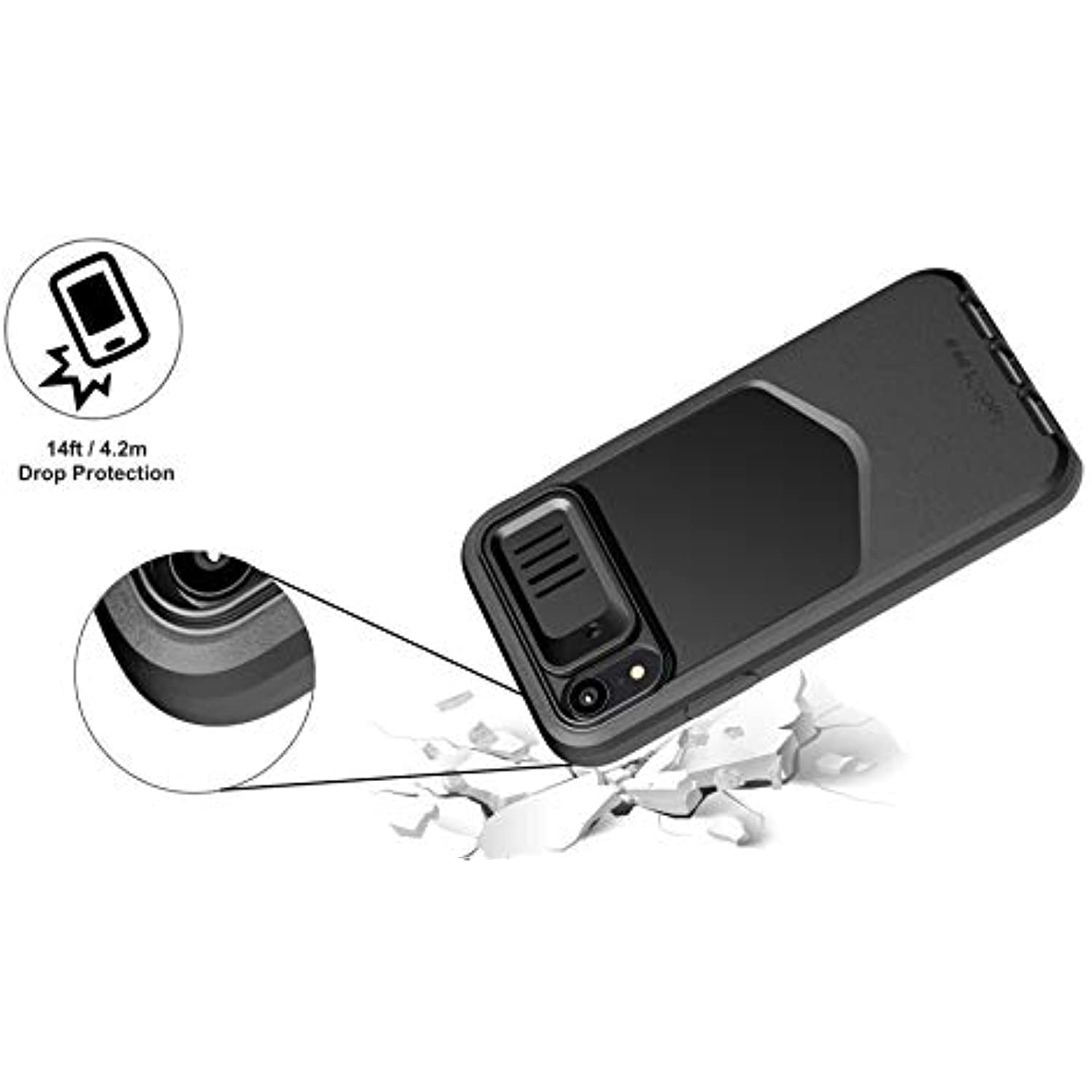 "14FT/4.2M PROTECTION. DROP AFTER DROP. Our most protective case yet, Evo Max uses three layers of high performing impact material to absorb impact energy and deflect it away from your phone. For you, this means protection from up to 14 feet (4.2 meters) and not just once, but drop after drop. "